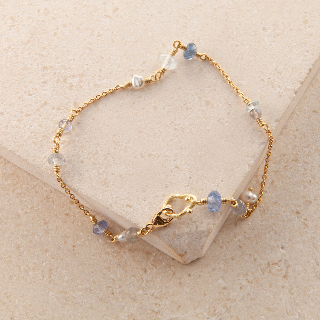 Materiale: 18 karat guld Ædelsten: Akvamarin, spectroliter, blå safirer, Keshi perler, Keshi south Sea Perle....