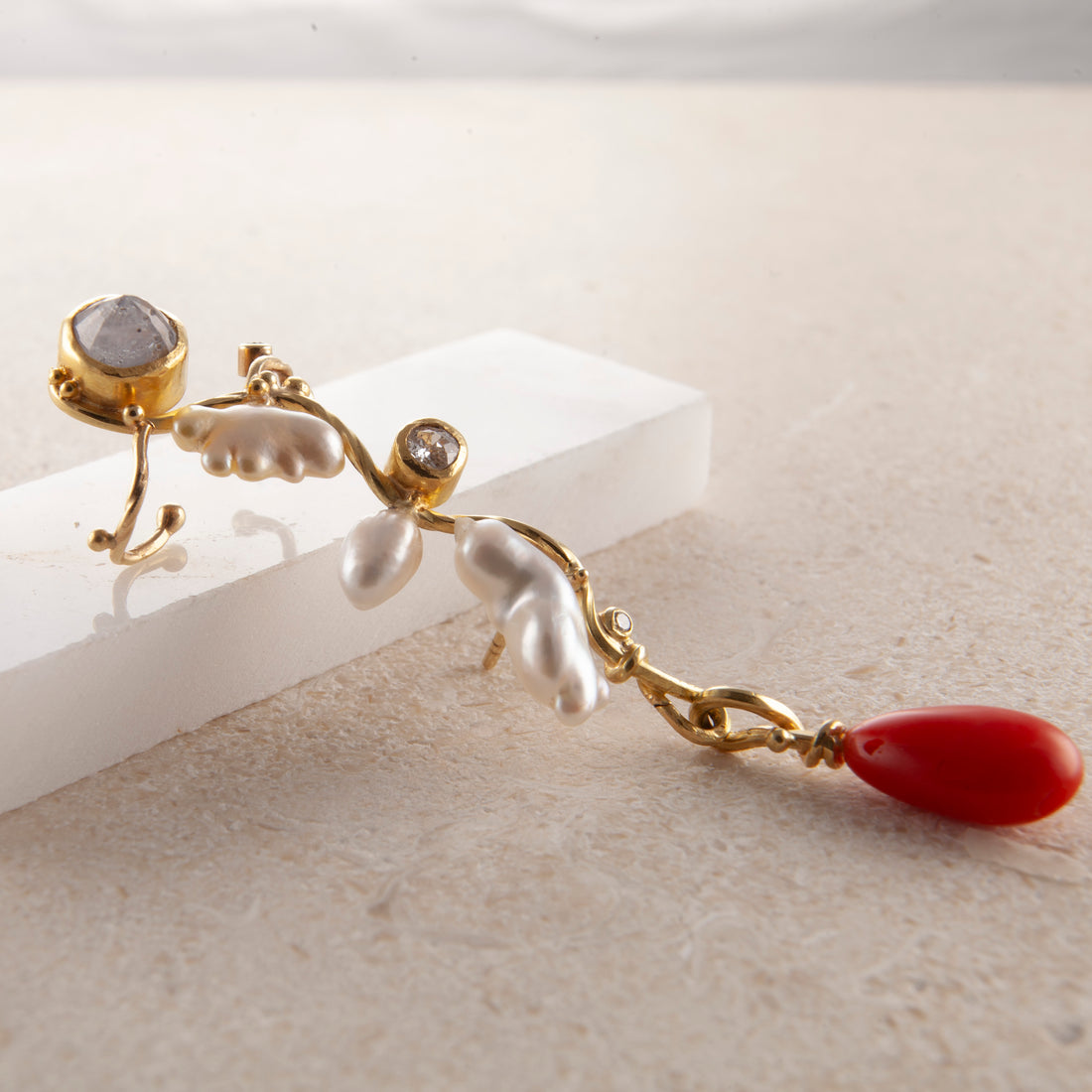 Materiale: 18, 22 karat guld Ædelstene: Koral, keshi perler, rå safir, 0.15 ct. old mine...
