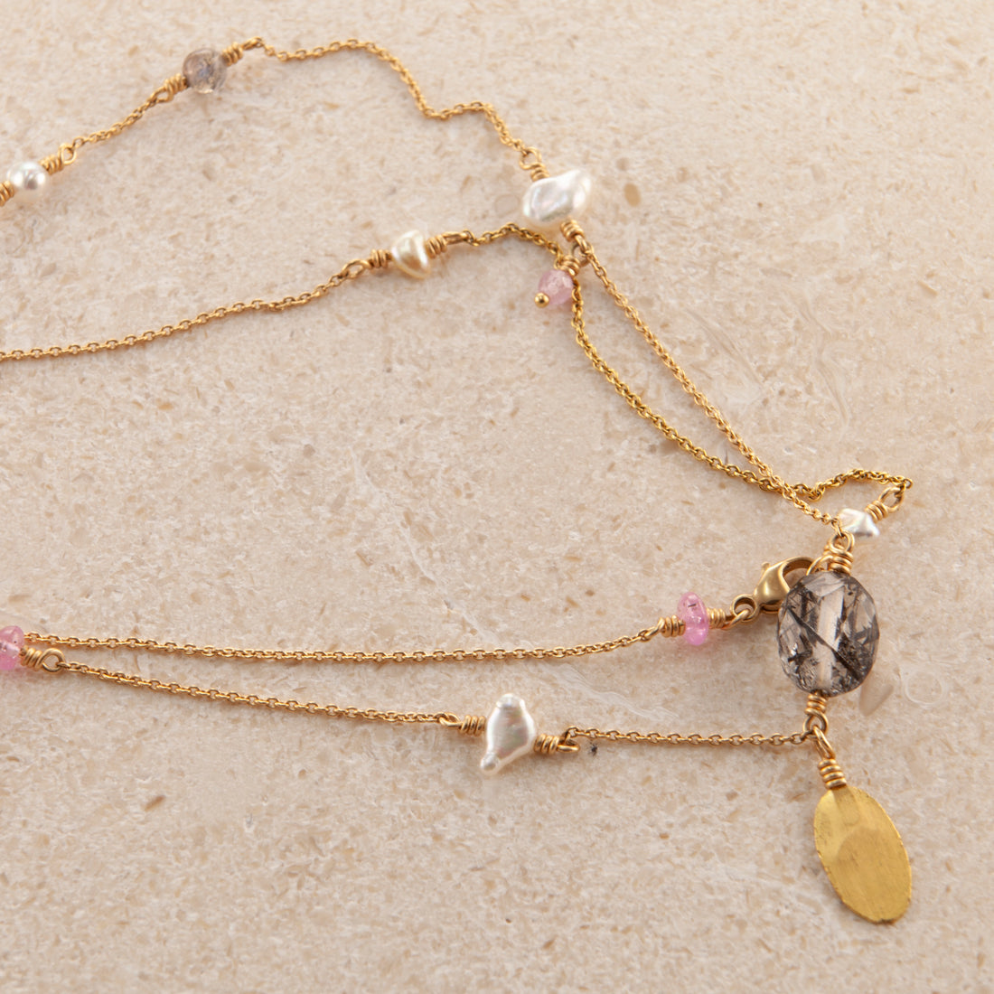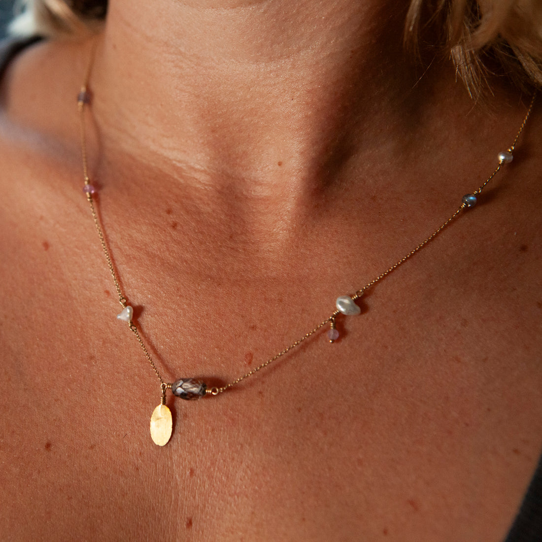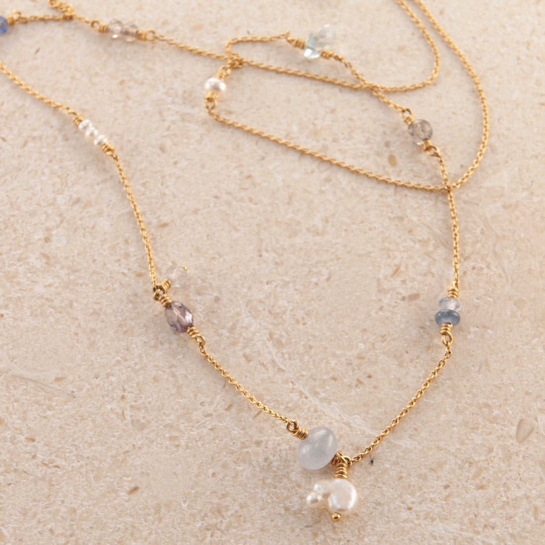 Materiale : 18 karat guld Ædelsten: Blå safirer, spektrolitter, akvamarin, iolit, keshi-perler Kæden er 48,5...