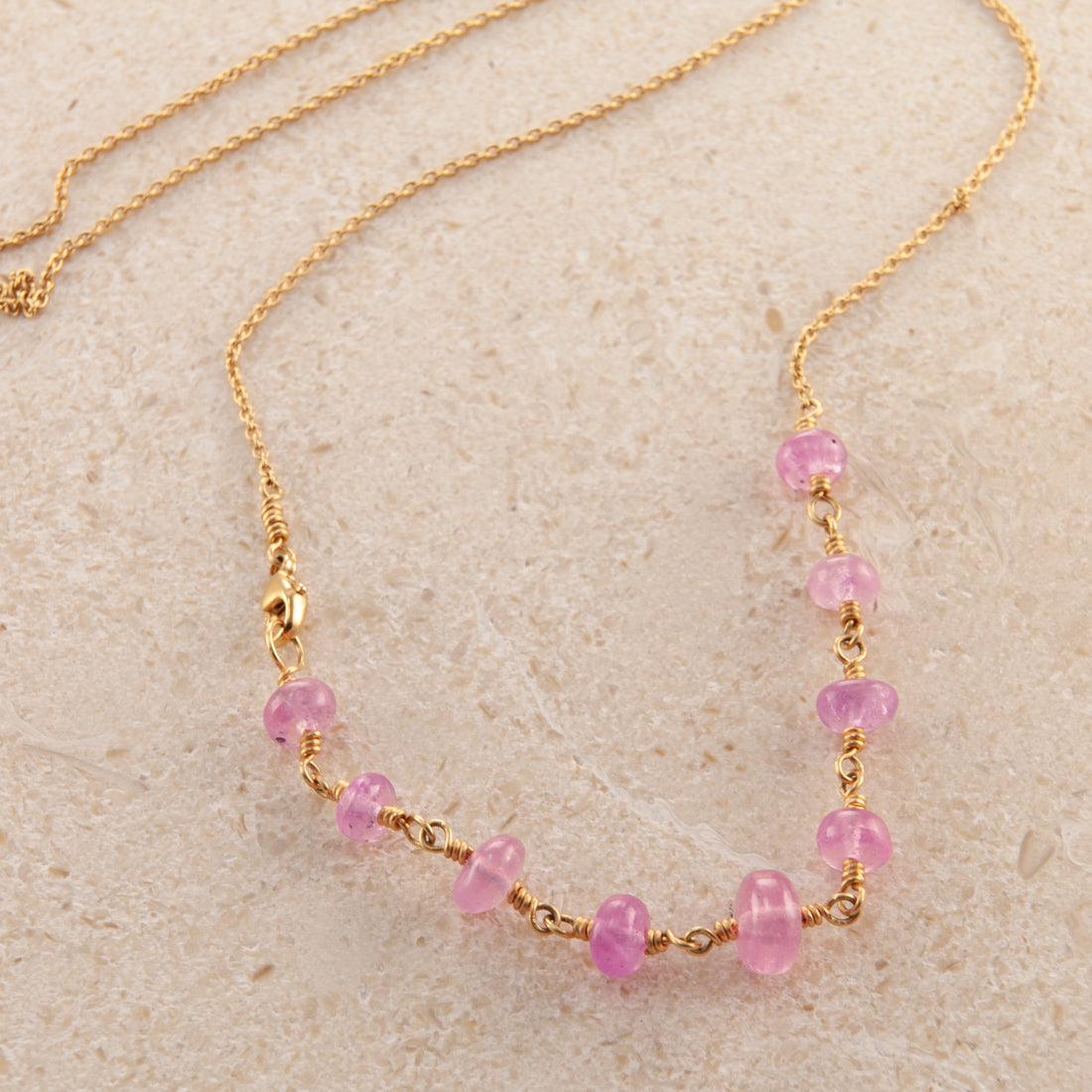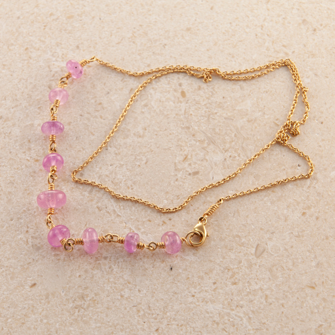 Materiale: 18 karat guld. Ædelsten: Lyserøde safirer Kædens samlede længde er 43 cm. Hvis du...