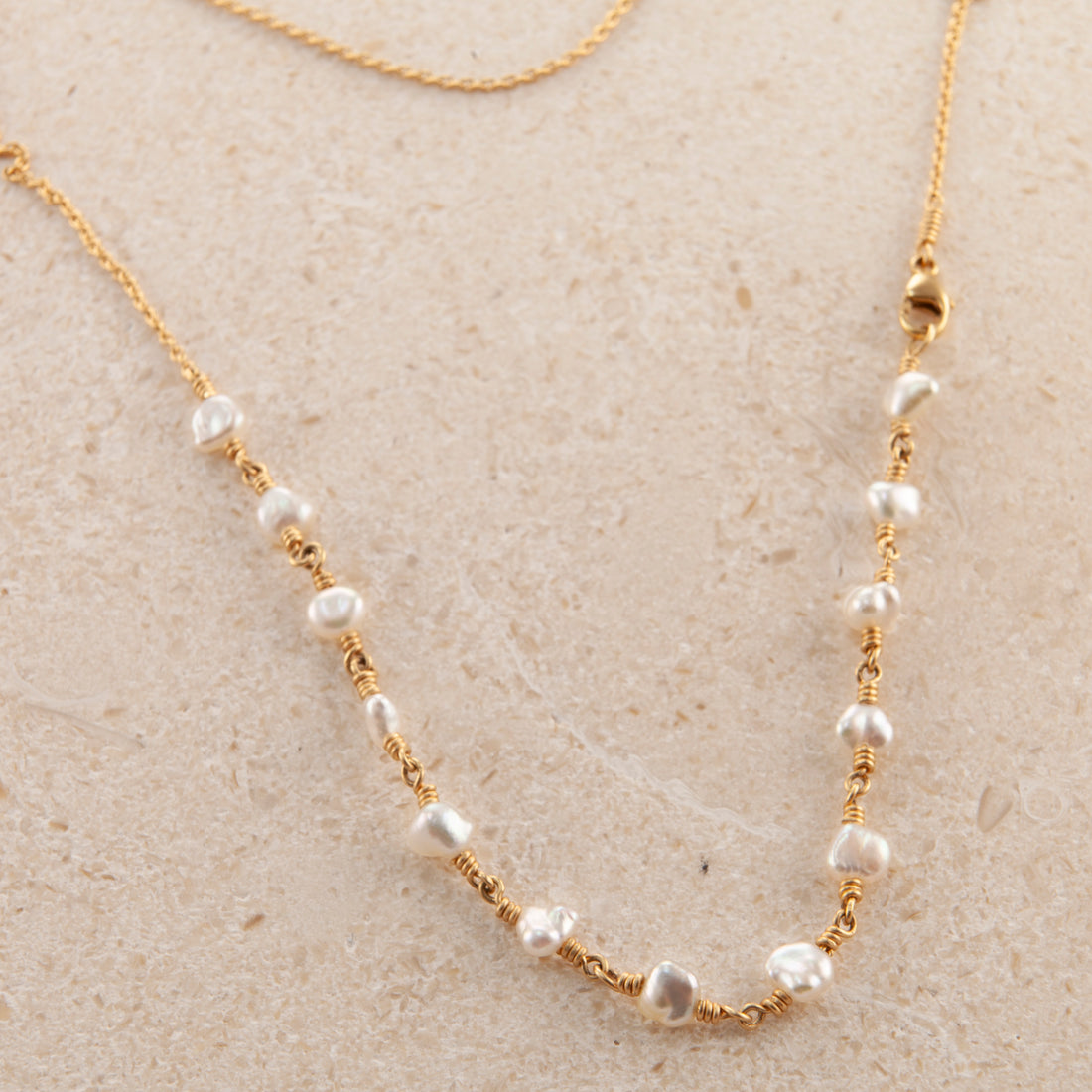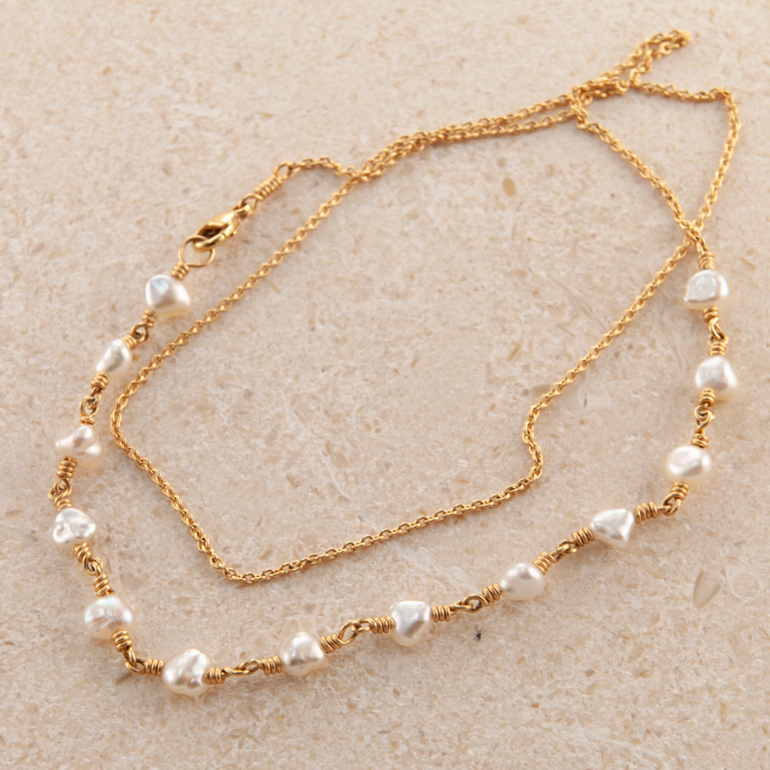 Materiale: 18 karat guld Ædelsten: 7 x Keshi perler Kædens længde er 39,5 cm Hvis...
