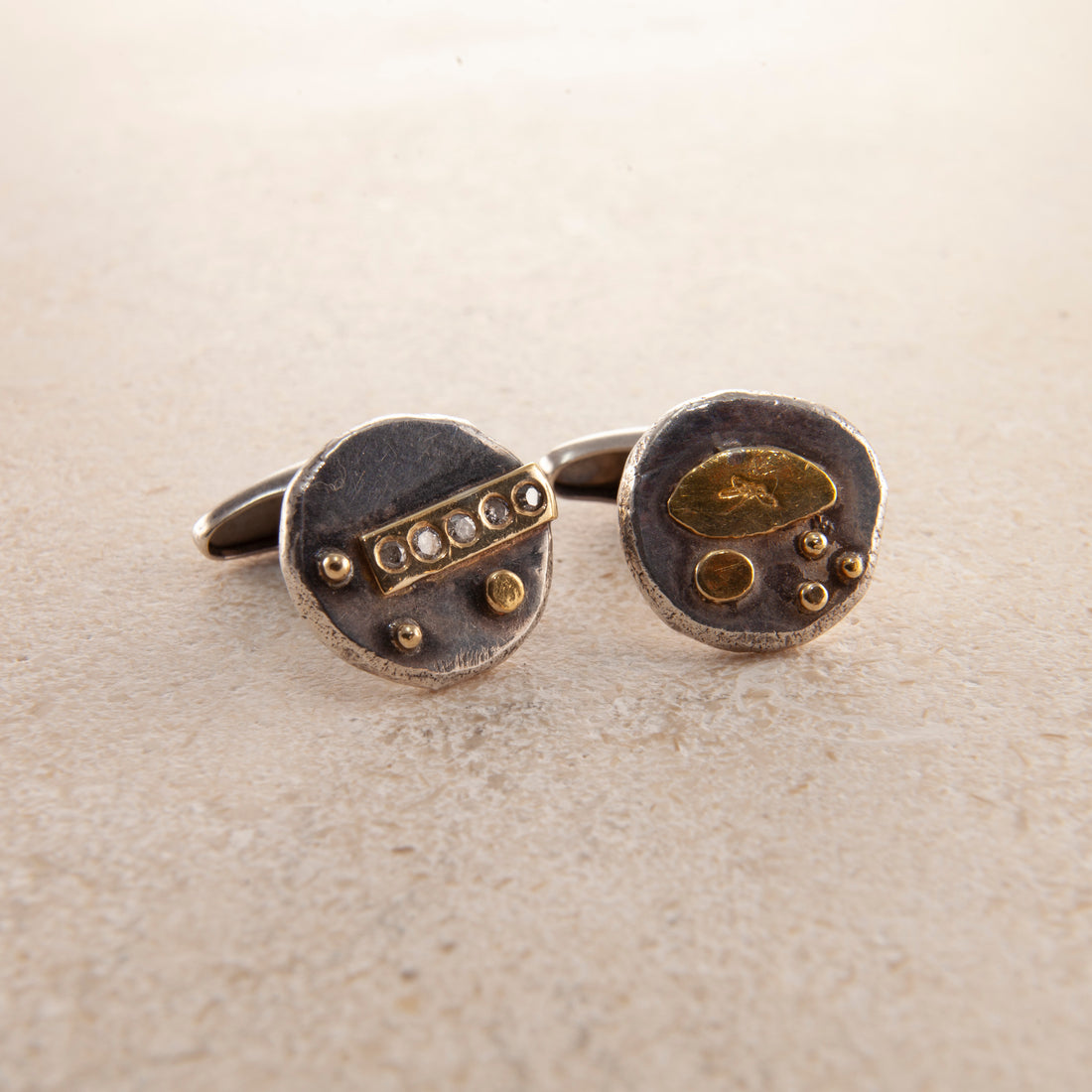 Materiale: Sølv, 18, 22 karat guld Ædelstene: Rå diamant, 7 x 0.02 ct. grå brillantslebne...