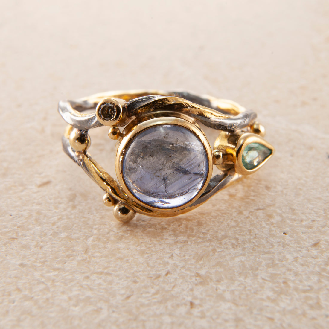 Materiale: Sølv, 18, 22, 24 karat guld Ædelsten: Blå cabochon Safir, grøn Dråbeformet smaragd, 0.04 ct....