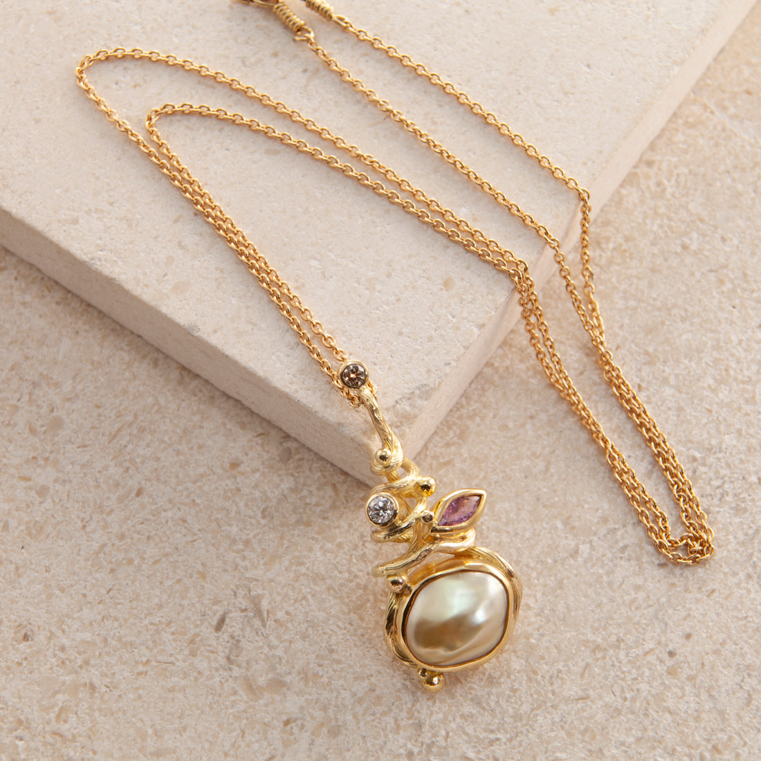 Materiale: 18, 22 karat guld Ædelsten: Blå cabochon-safir, keshi-perle, 0,08 ct. champagnefarvet brillantslebet diamant, 0,02...