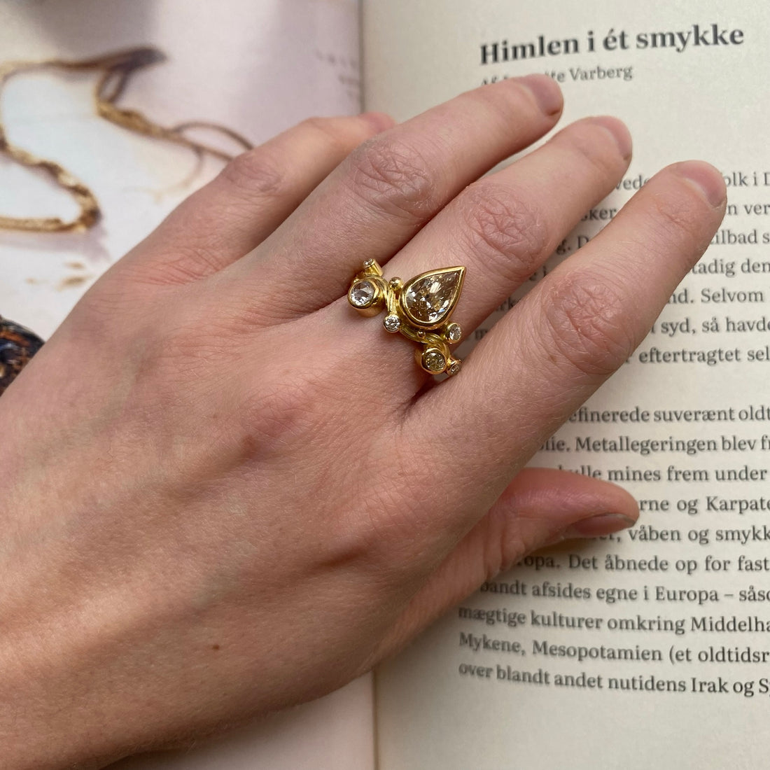 Materiale: 18, 22k guld Ædelstene: Blå pæreformet safir, 0,22 ct. rosenslebet diamant, 0,06 ct. TW...