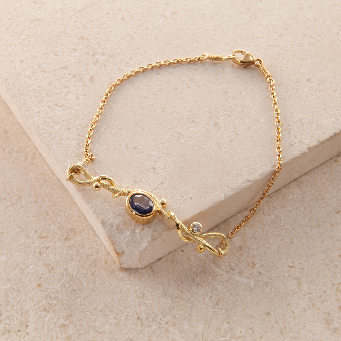 Jeg forsøgte at omsætte den fornemmelse: Det flydende og formløse vand, tangens bløde bevægelse, de blinkende glimt. I begyndelsen var det blot diamanter drysset over et gyldent bånd eller en fin tråd om fingeren. Men i dag sniger jeg farvede ædelsten ind i alle former, slibninger og nuancer — stadig overvældet, inspireret og fortryllet af havet og dets vidunderlige væsner.