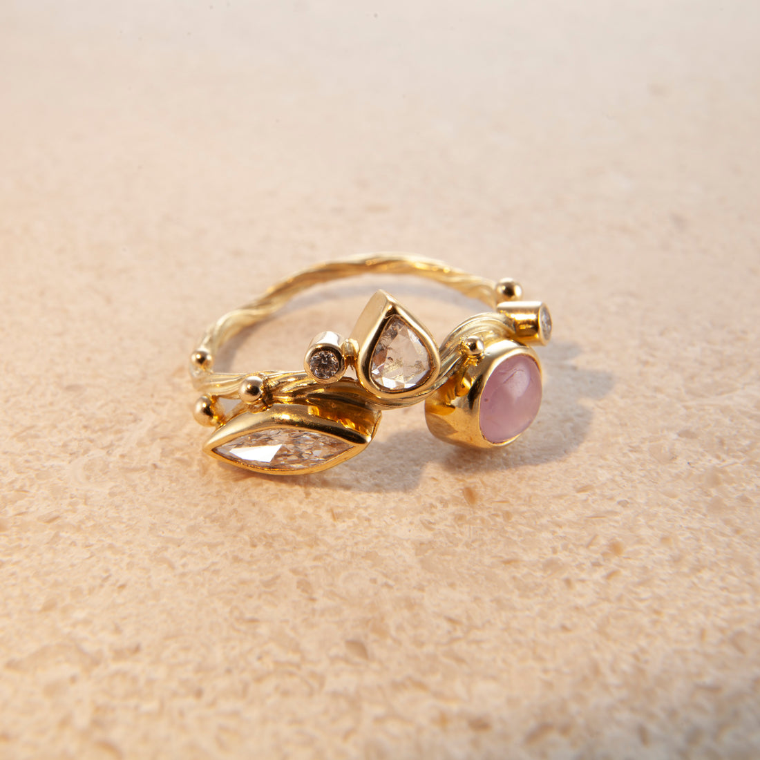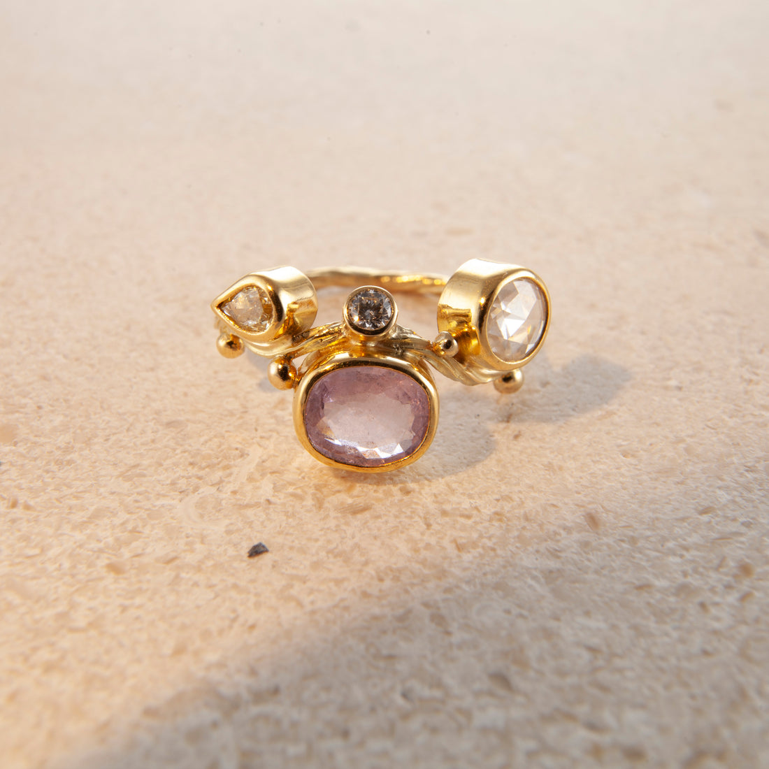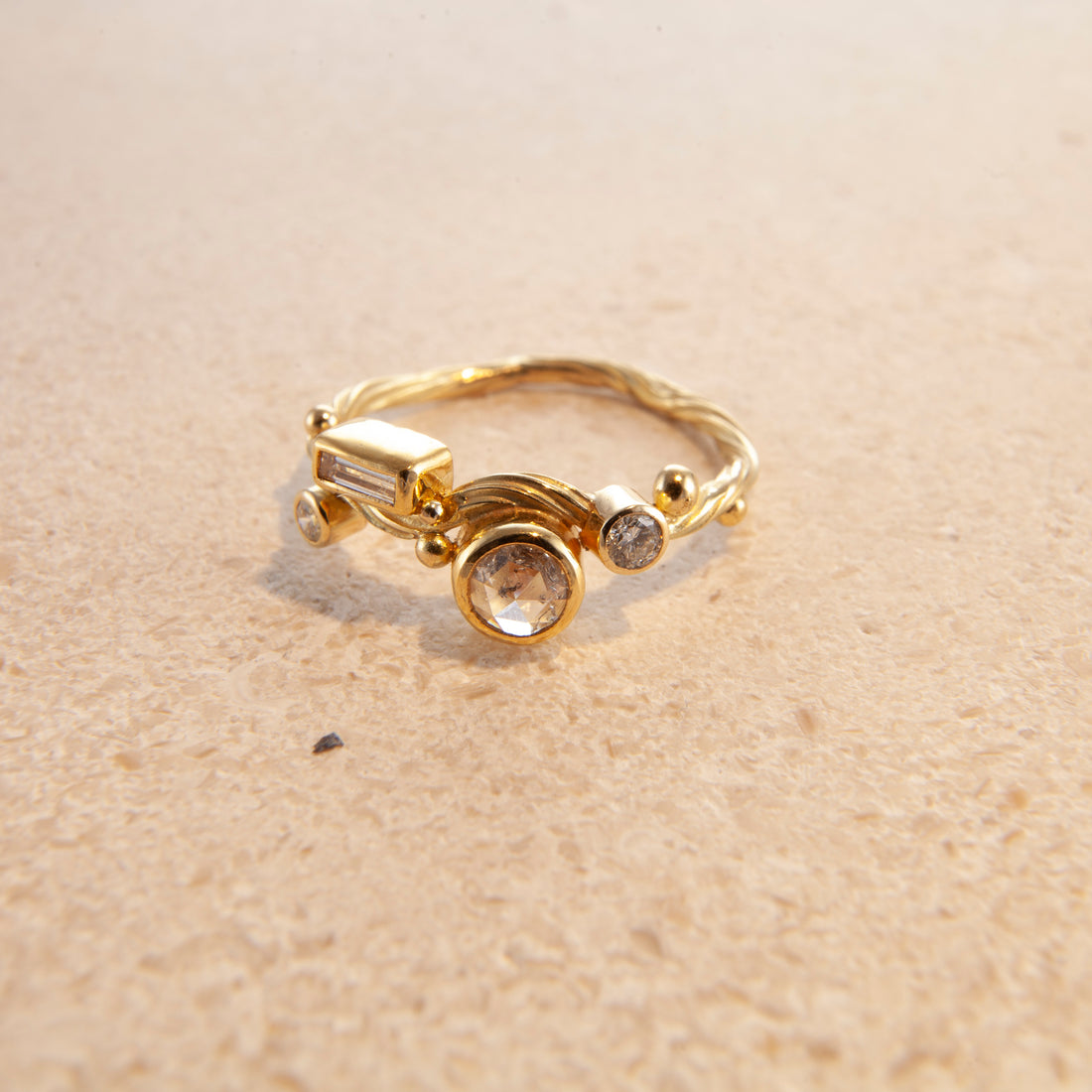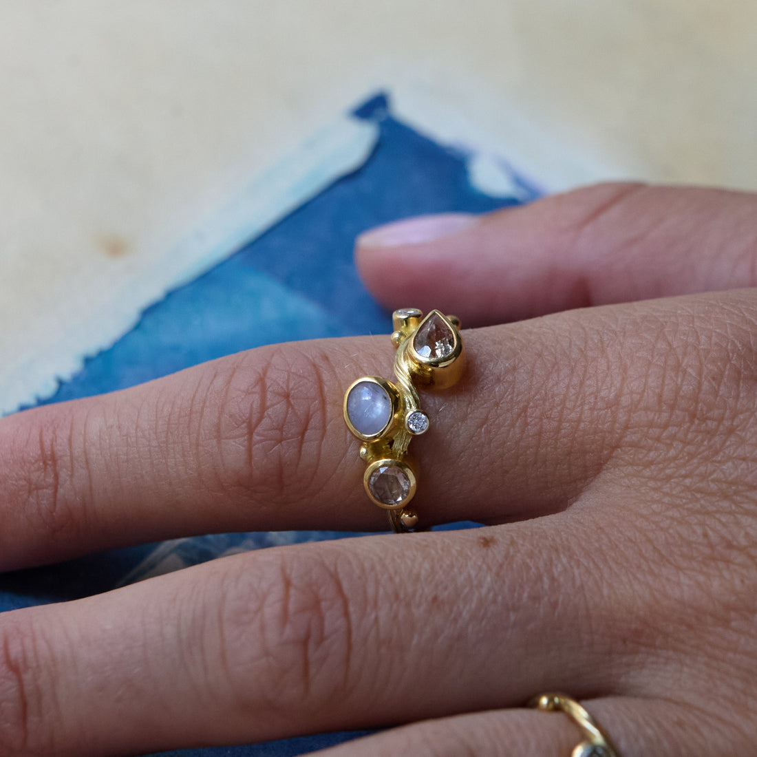 Jeg forsøgte at omsætte den fornemmelse: Det flydende og formløse vand, tangens bløde bevægelse, de blinkende glimt. I begyndelsen var det blot diamanter drysset over et gyldent bånd eller en fin tråd om fingeren. Men i dag sniger jeg farvede ædelsten ind i alle former, slibninger og nuancer — stadig inspireret og fortryllet af havet og dets vidunderlige væsner.