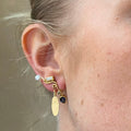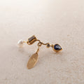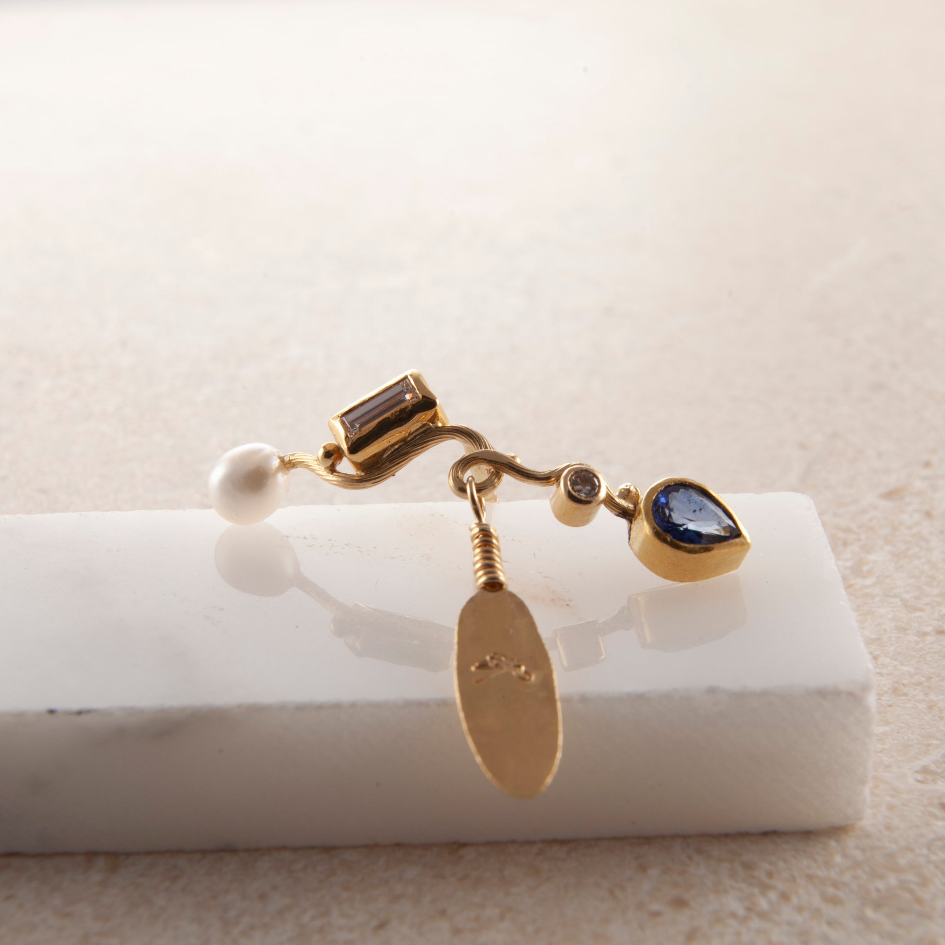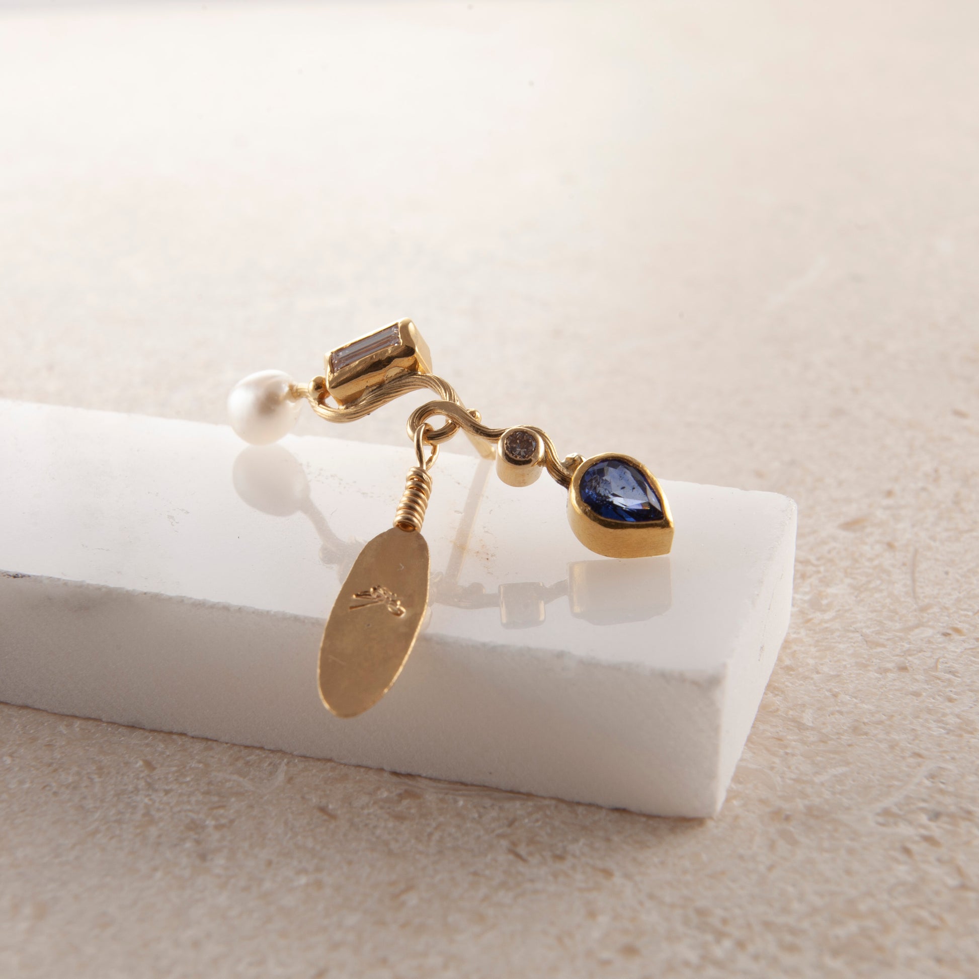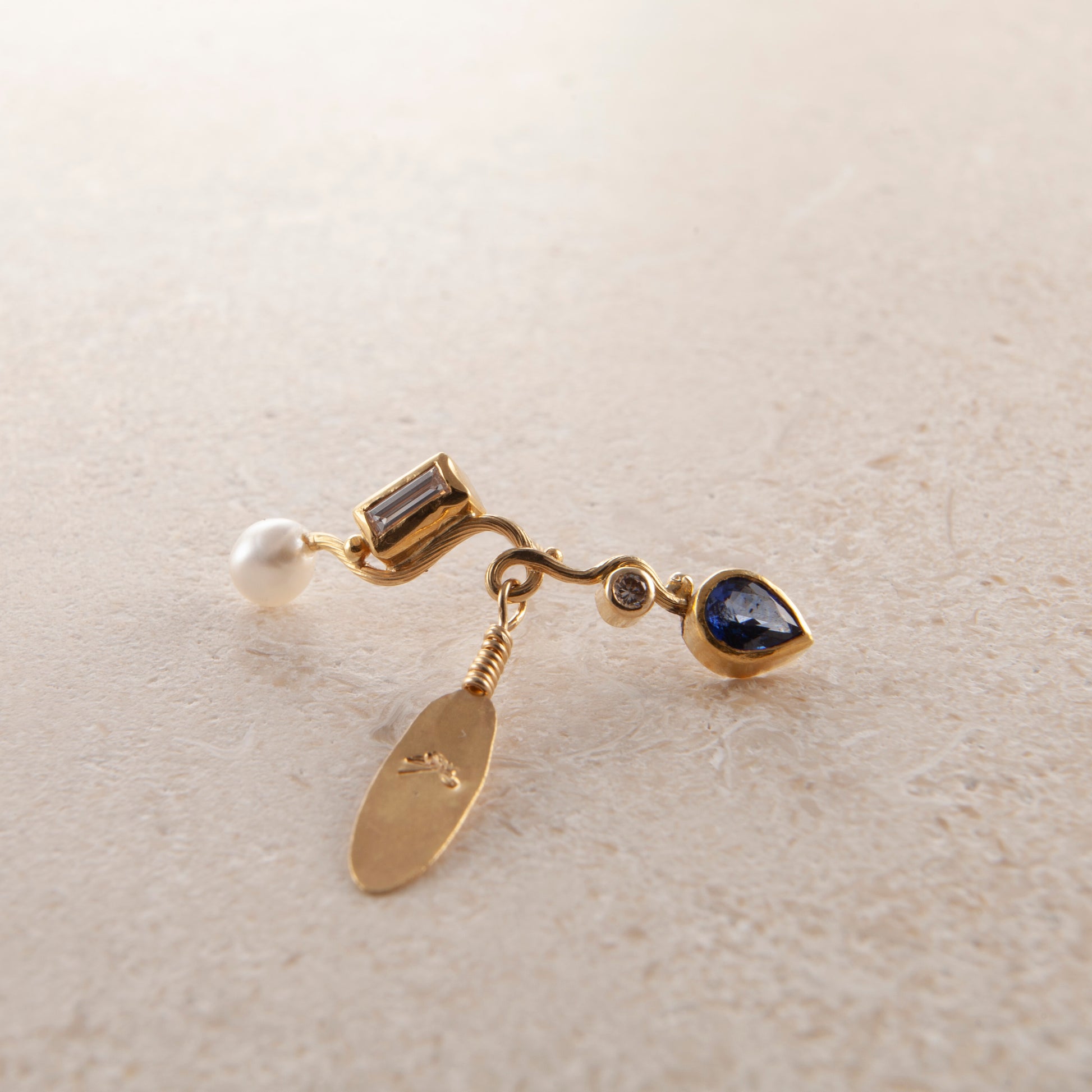 Gems: Blue pear shaped sapphire, 0.14 ct. baguette diamond, 0.04 ct. champagne brilliant cut diamond, keshi pearl