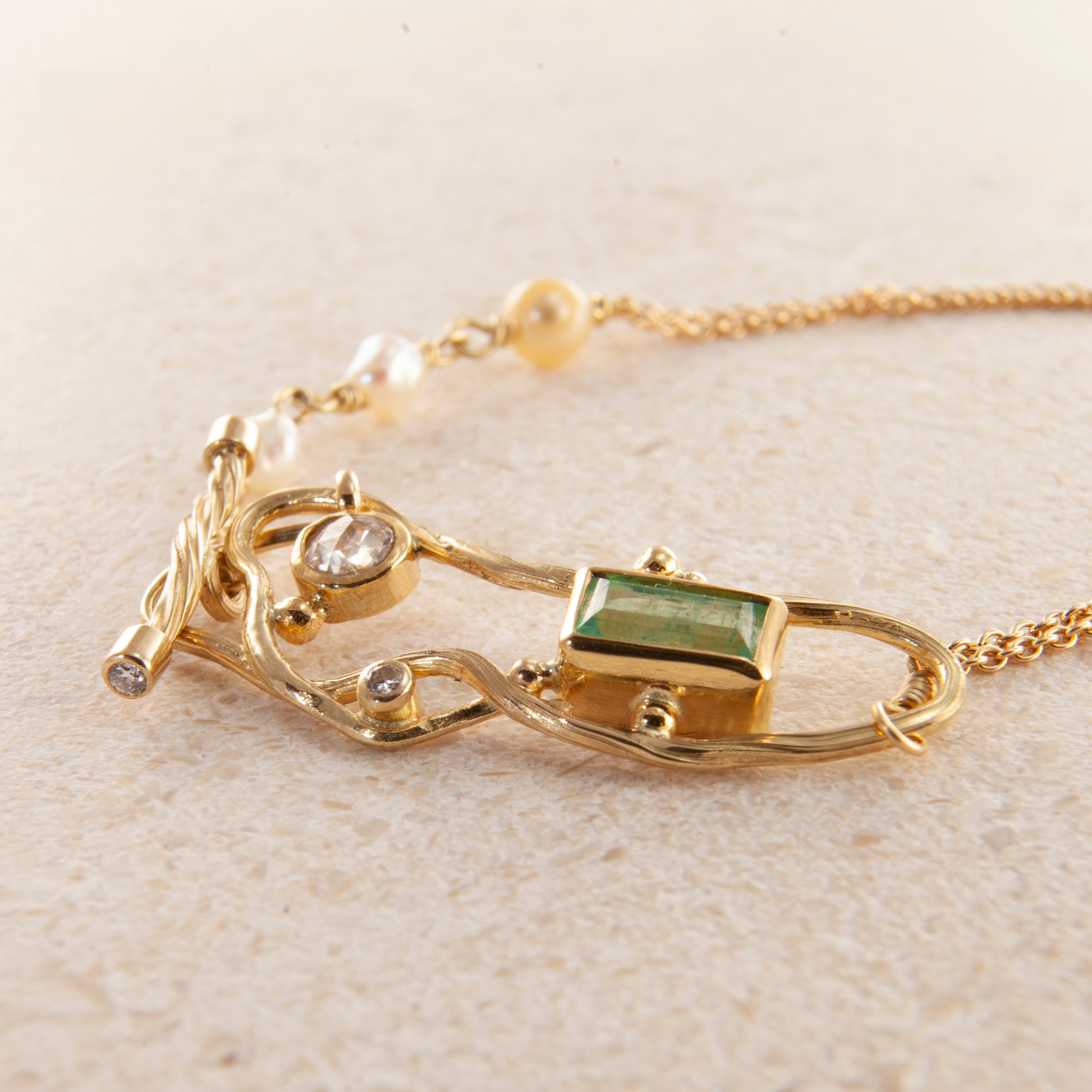 Gems: 0.15 ct. Rose cut Diamond, Emerald, 3x 0.02 ct. TW vs brillant cut diamonds, Keshi Pearls