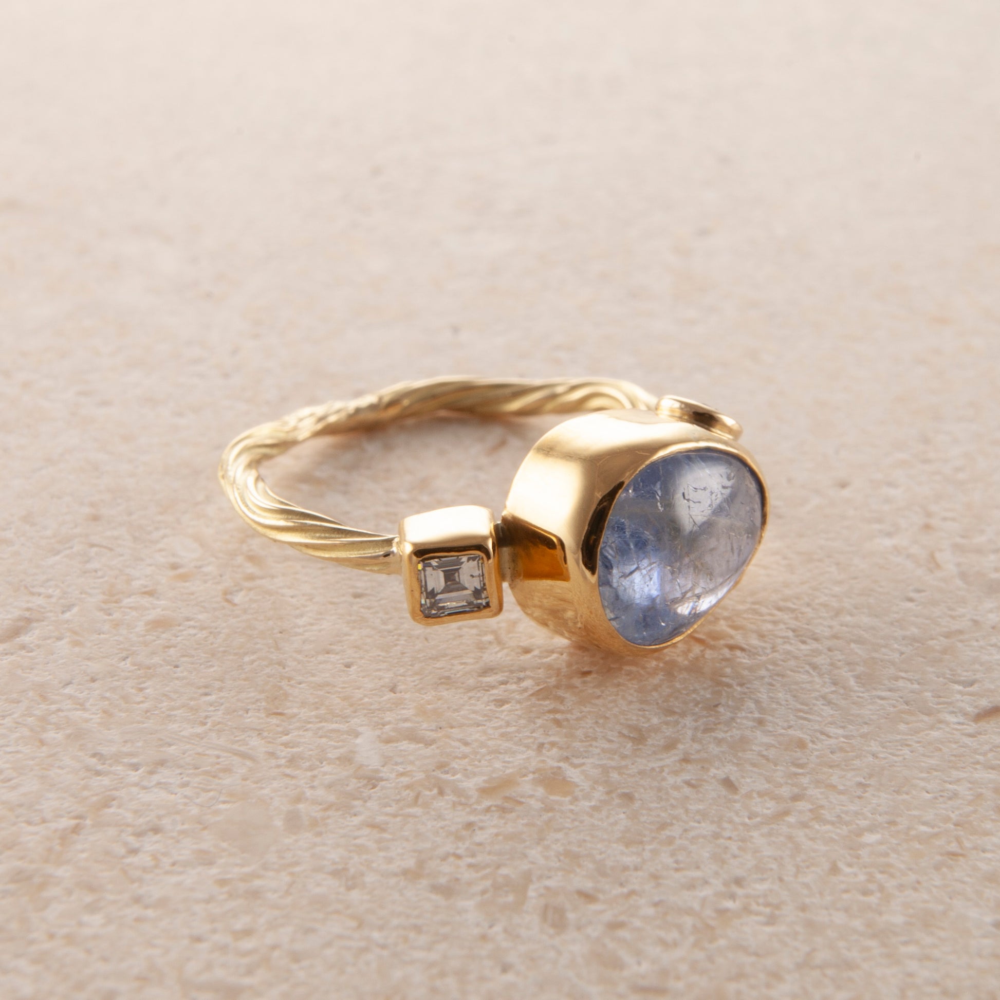 Gemstone: 4.32 ct. Blue cabochon sapphire, 0.18 ct. brilliant cut diamond, 2 x 0.06 ct. TW VS brilliant cut diamonds