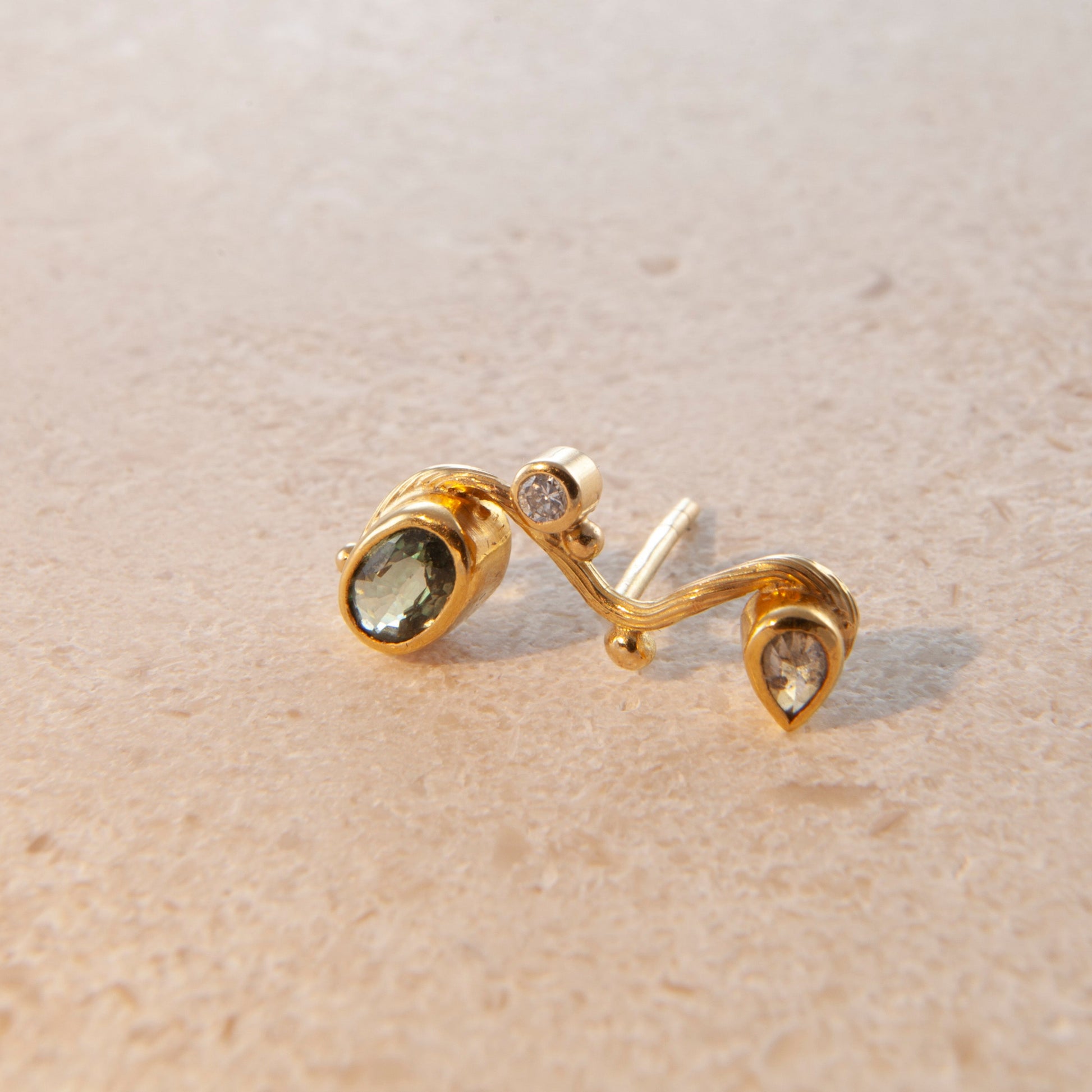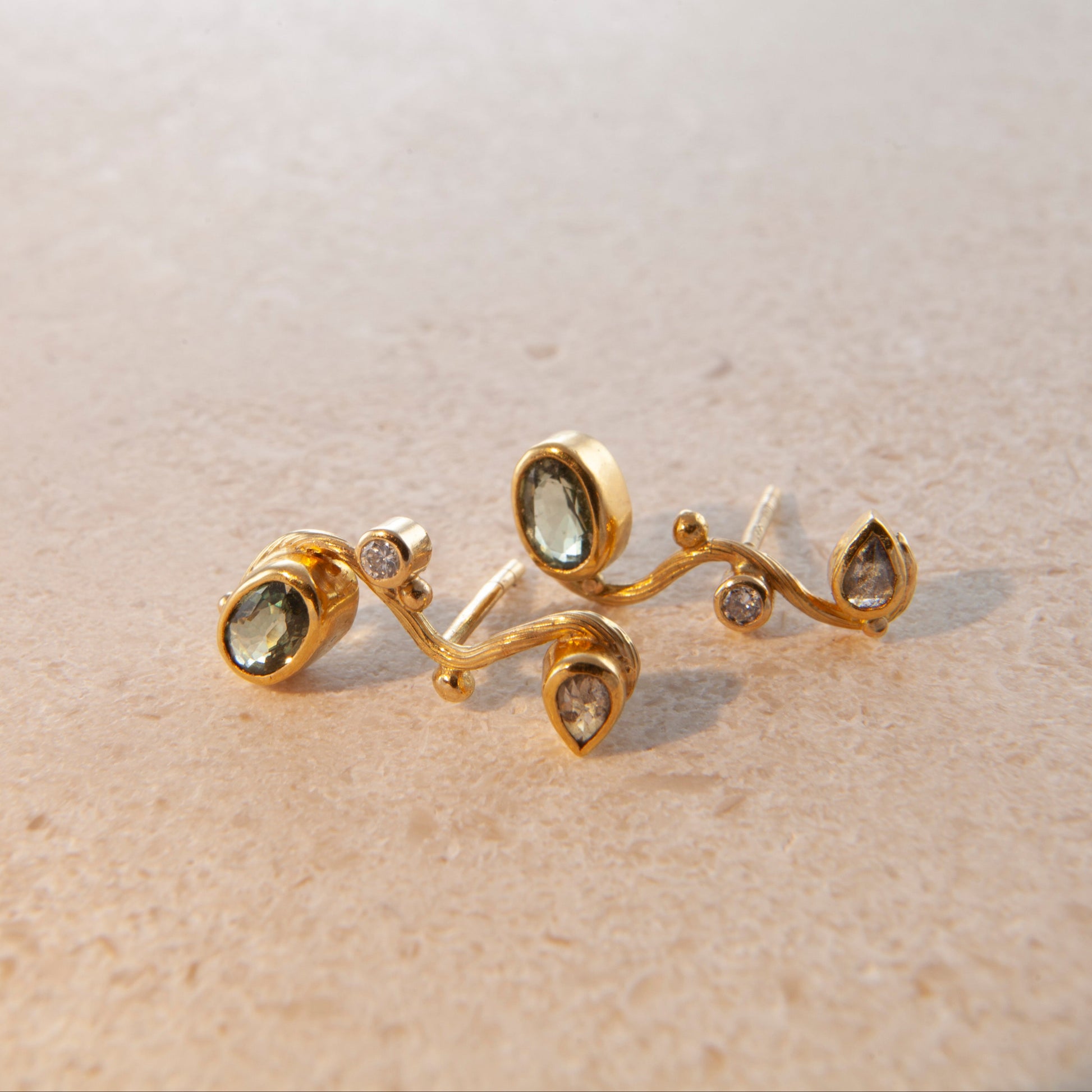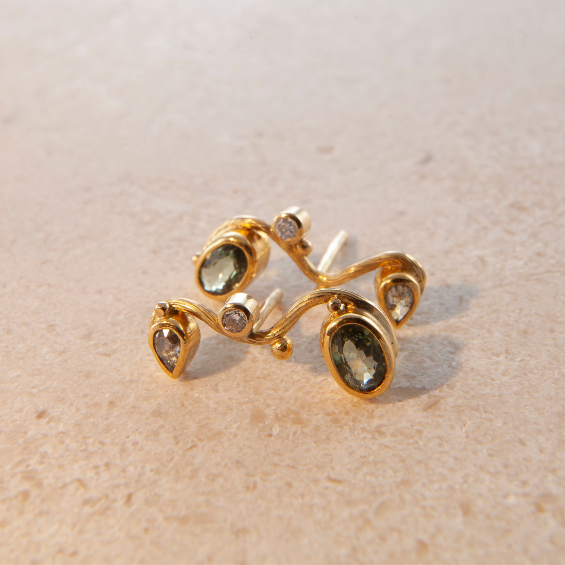 Gems: Green sapphires, 2 x 0.08 ct. grey pear shaped antique cut diamonds, 2 x 0.04 ct. TW vs brilliant cut diamonds.