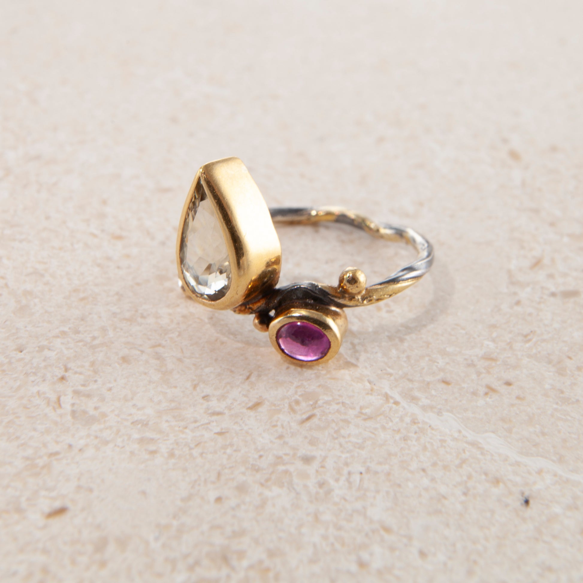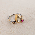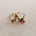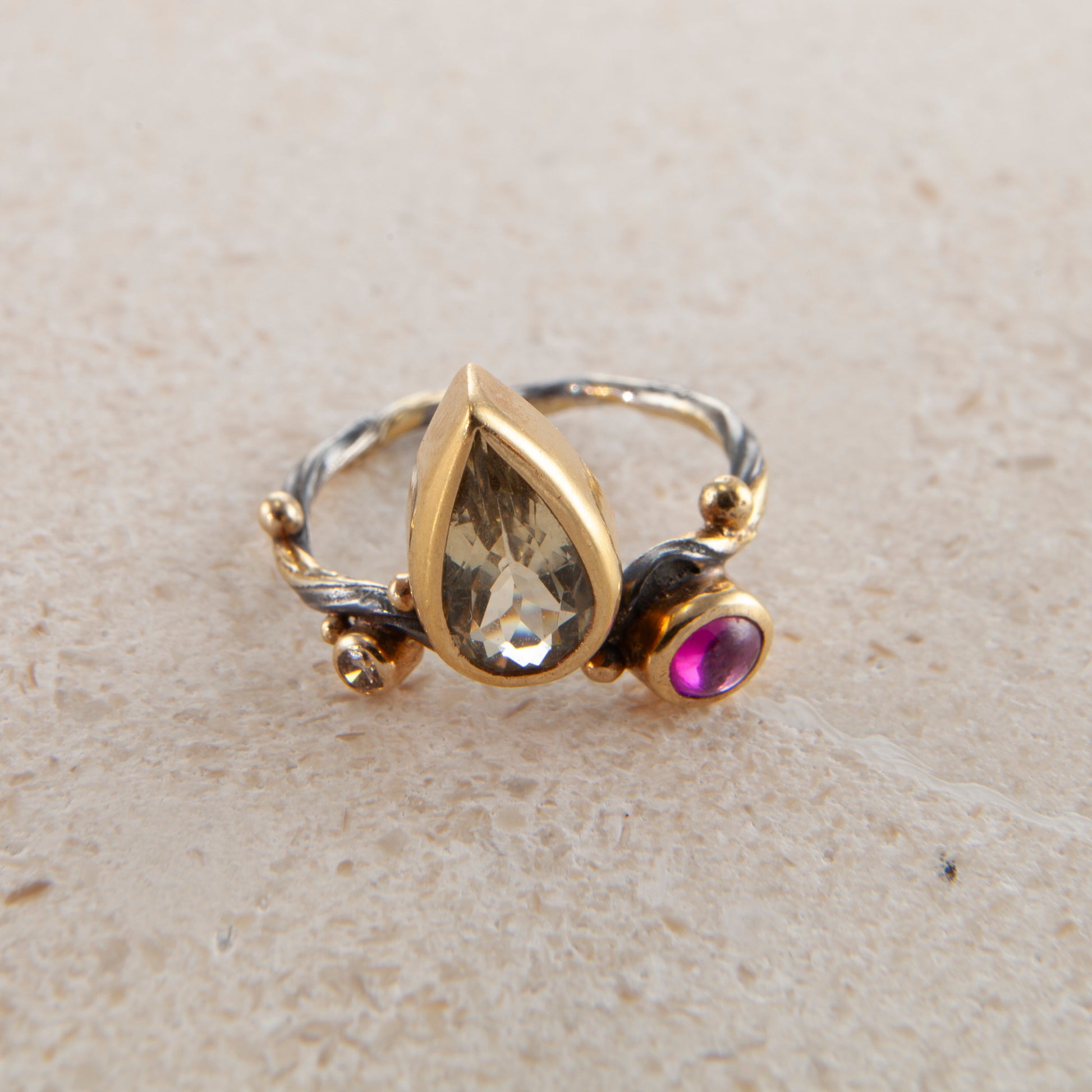 Gems: Pear shaped lemon quartz, ruby, 0.04 ct. champagne brilliant cut diamond.