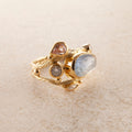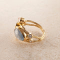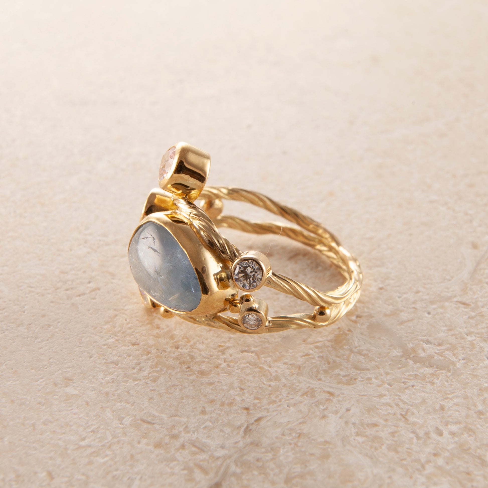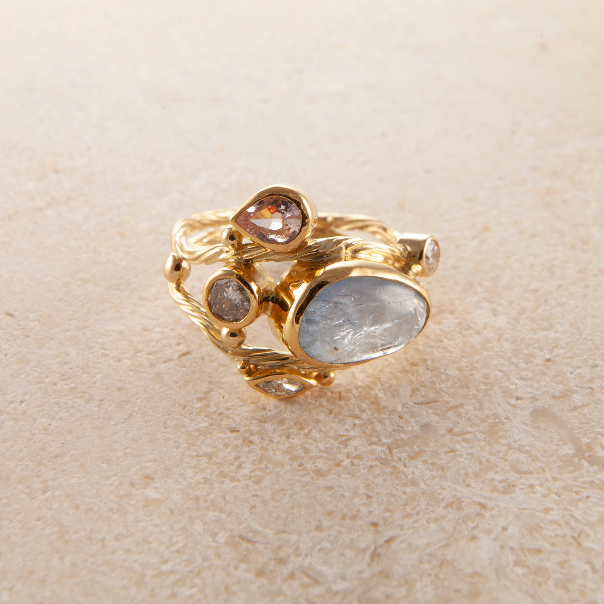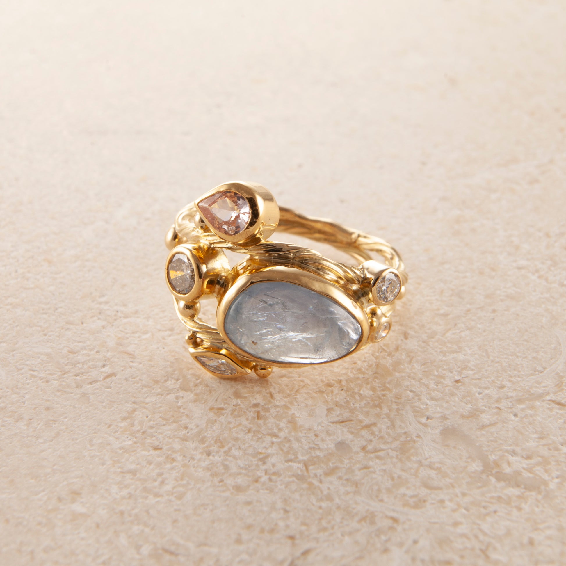 Gemstone: Blue cabocon sapphire, pink pear shaped sapphire, 0.10 ct., 0.04 ct. TW vs brilliant cut diamonds, 0.05 ct. navette cut diamond, 0.40 ct. grey brilliant cut diamond.