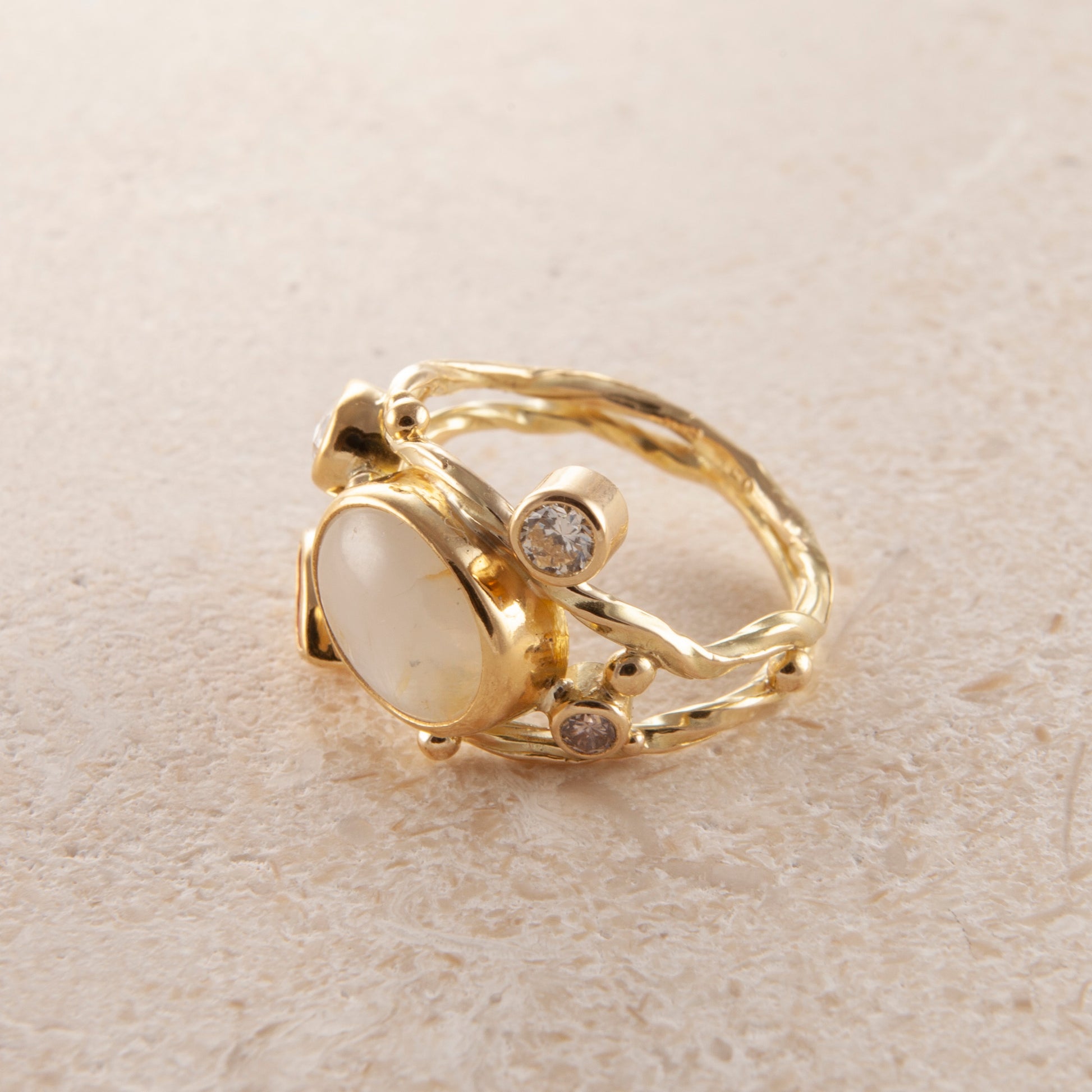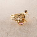 Gemstone: Star sapphire, pink navette cut sapphire, 0.28 ct. pear shaped rose cut diamond, 0.15 ct. TW vs brilliant cut diamond, 0.16 champagne brilliant cut diamond