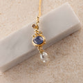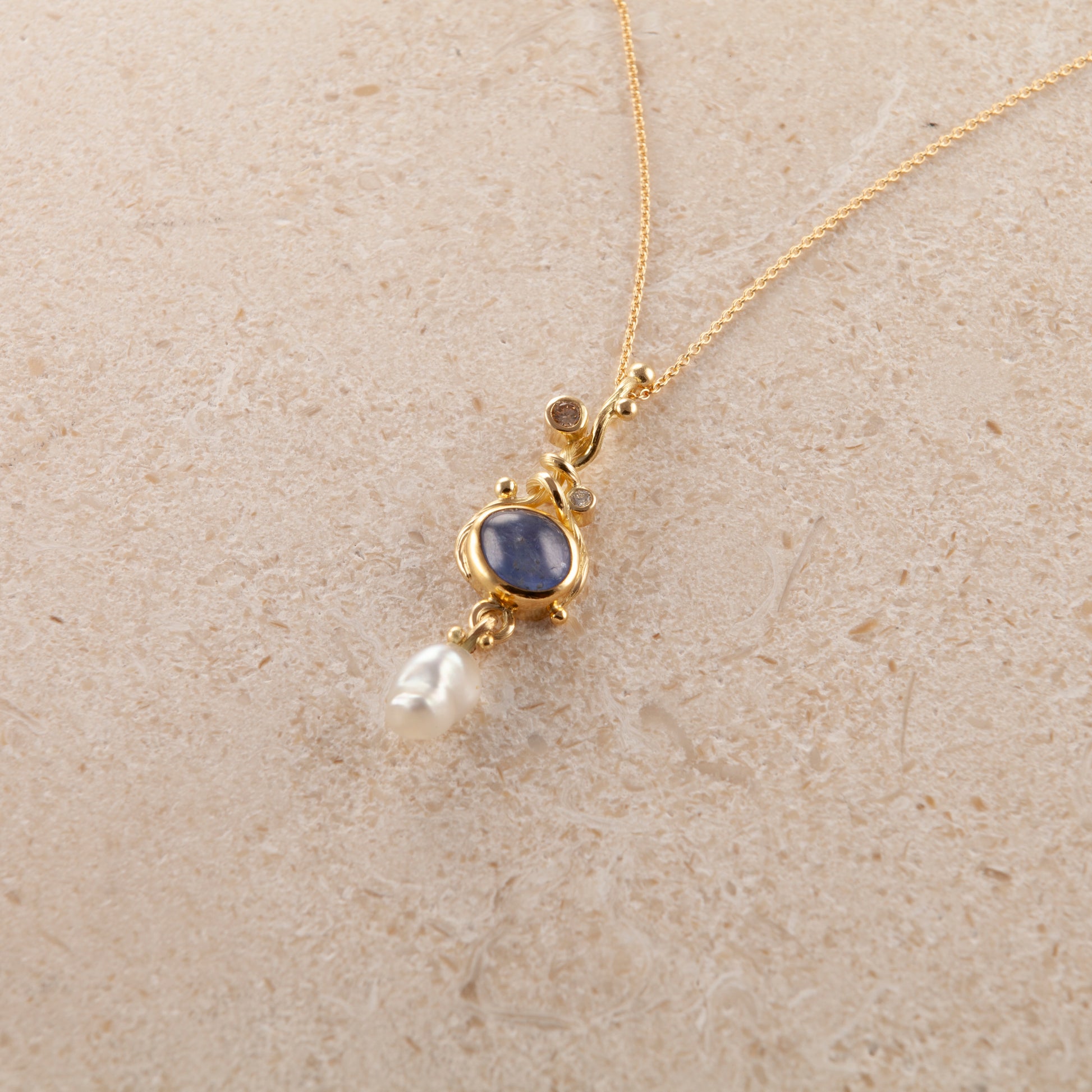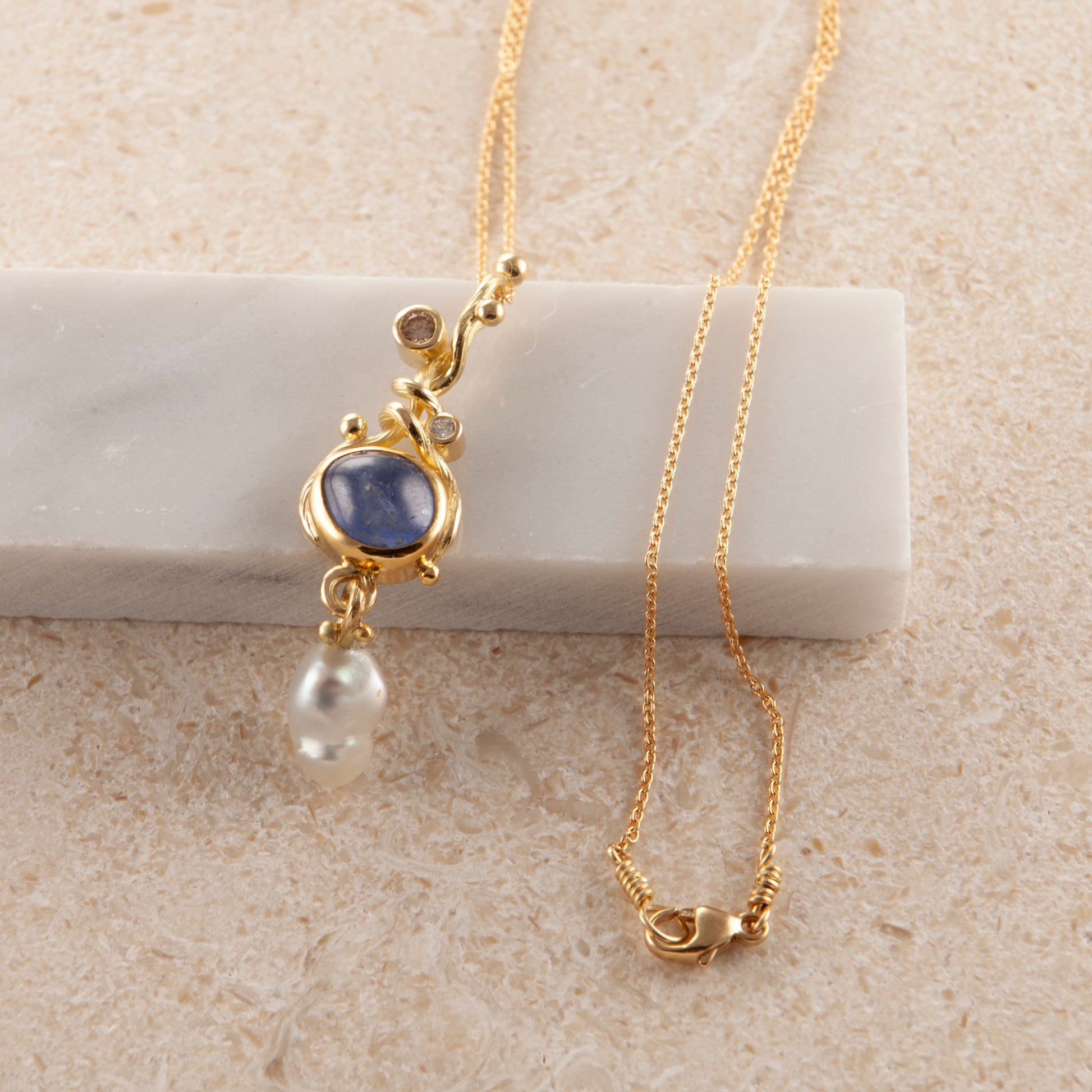 Gems: Blue Cabochon sapphire, keshi pearl, 0.08 ct. champagne brilliant cut diamond, 0.02 ct. TW vs brilliant cut diamond.