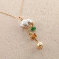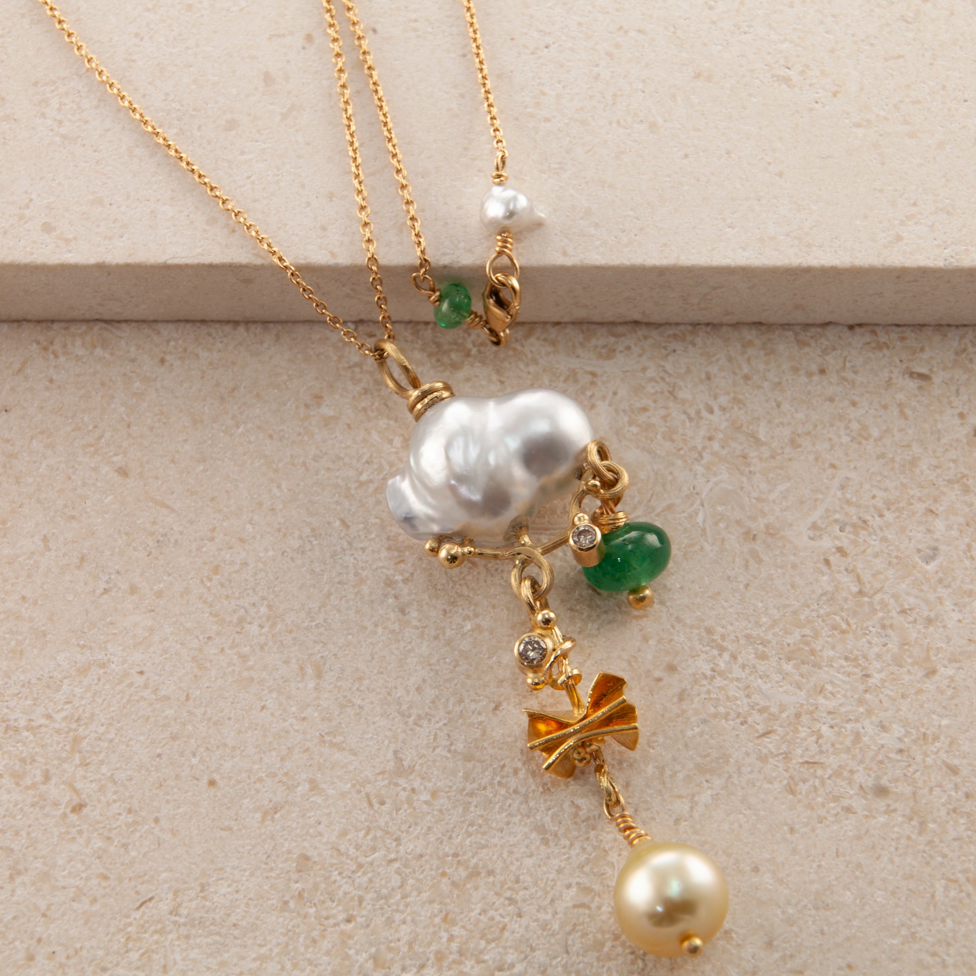 Gems: South sea pearls, emeralds, 0.06 ct., 0.04 ct. champagne brilliant cut diamonds, keshi pearl.