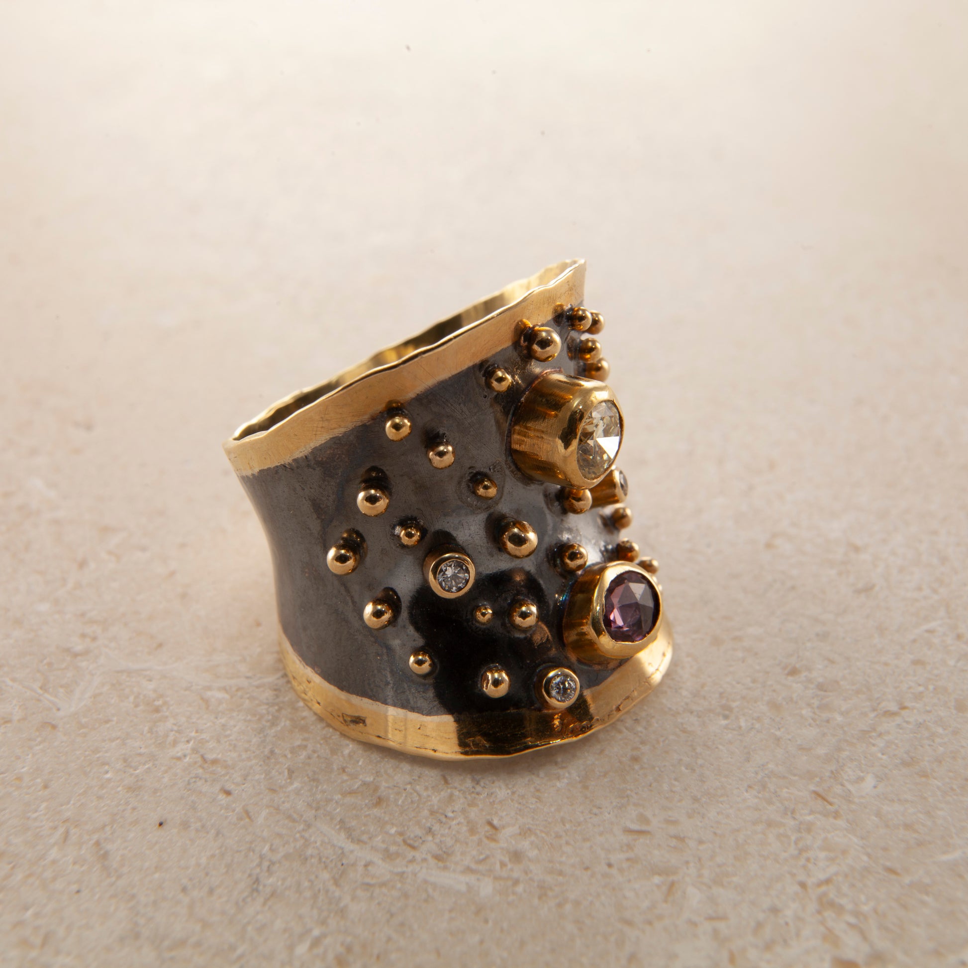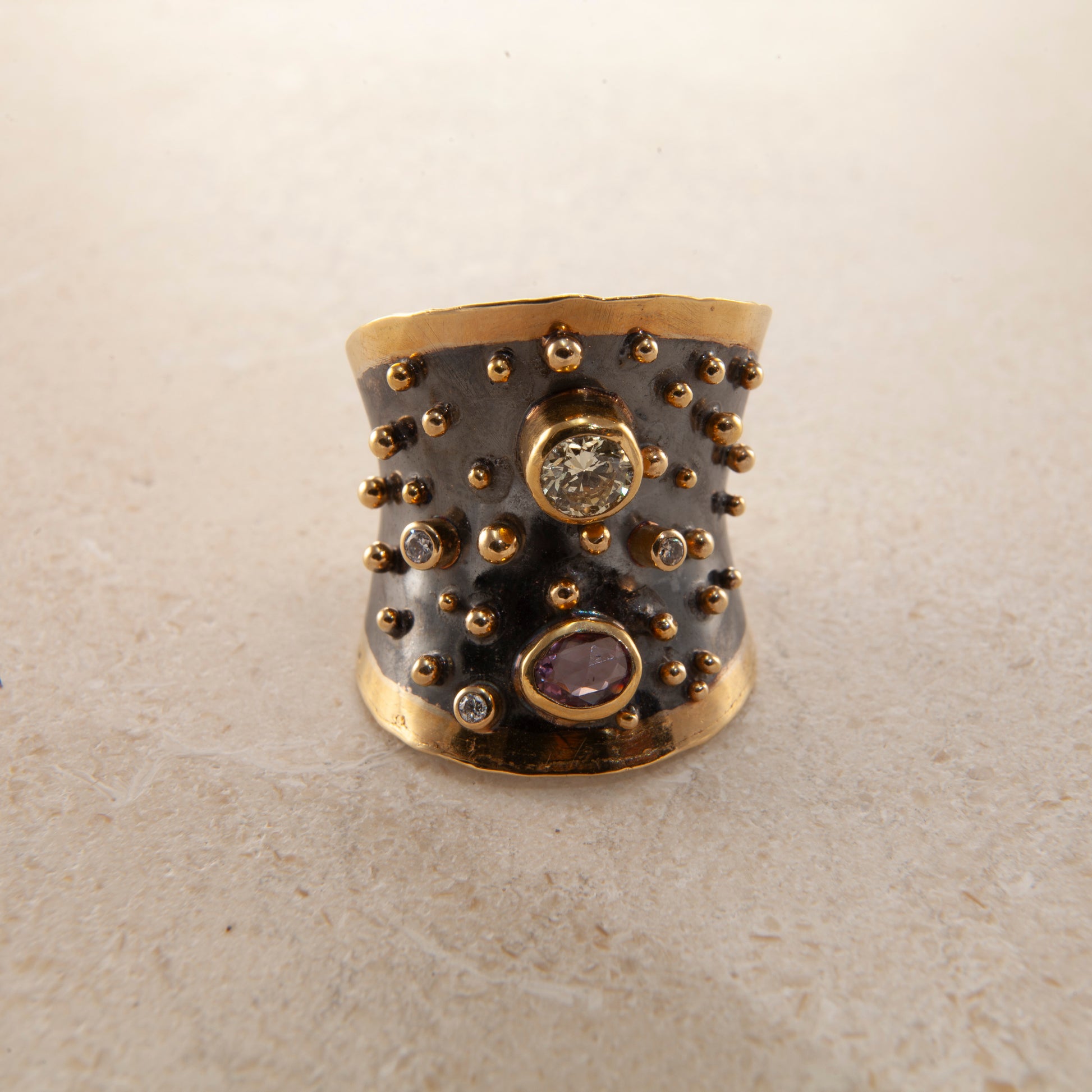 Gems: Pink sapphire, 0.50 ct. diamond, 0.04 ct., 0.02 ct. TW vs brilliant cut diamonds, 0.02 ct. brilliant cut champagne diamond