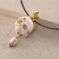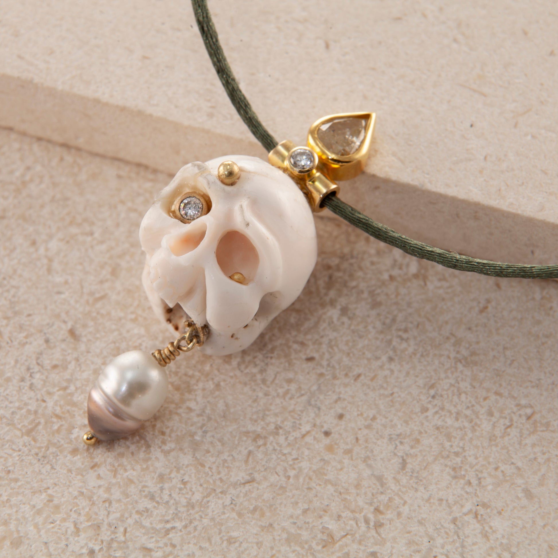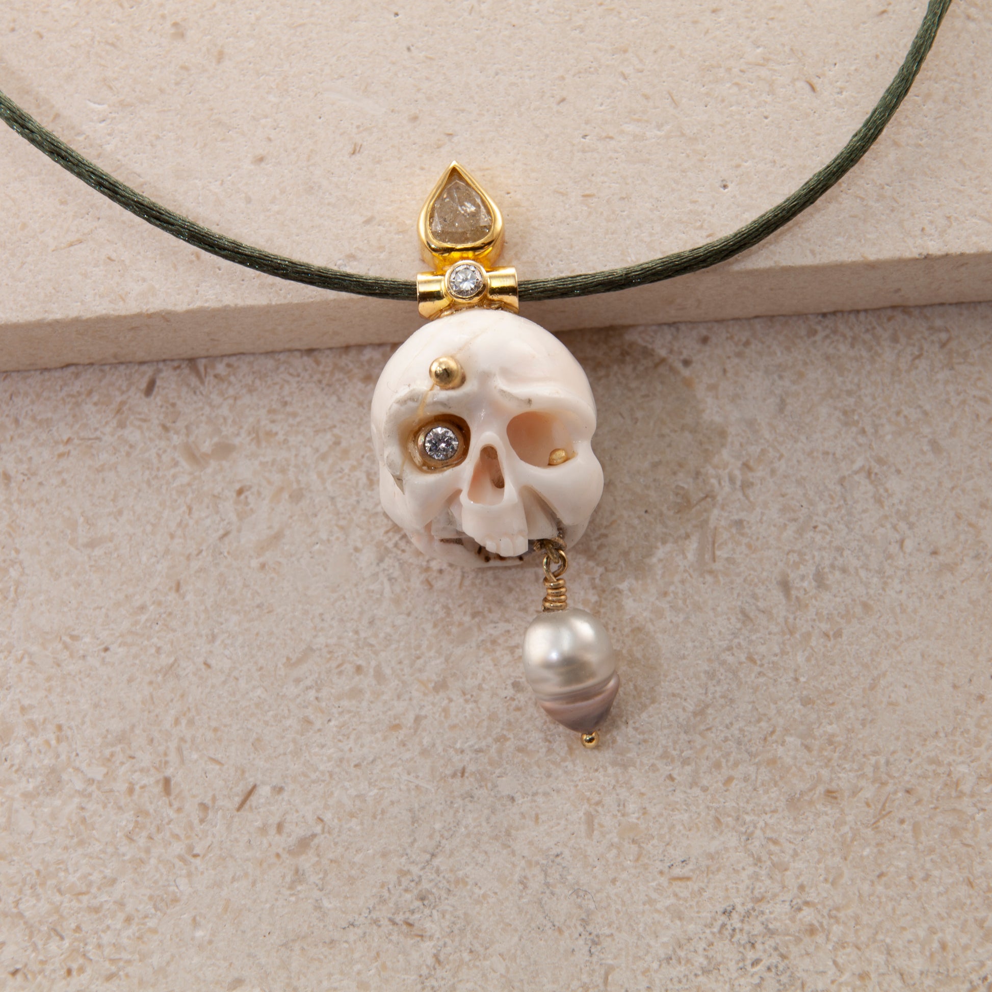 Gems: Hand carved Coral scull, 0.83 ct. pear shaped Diamond, 2 x 0.06 ct. TW vs brilliant cut Diamonds, Keshi Pearl.