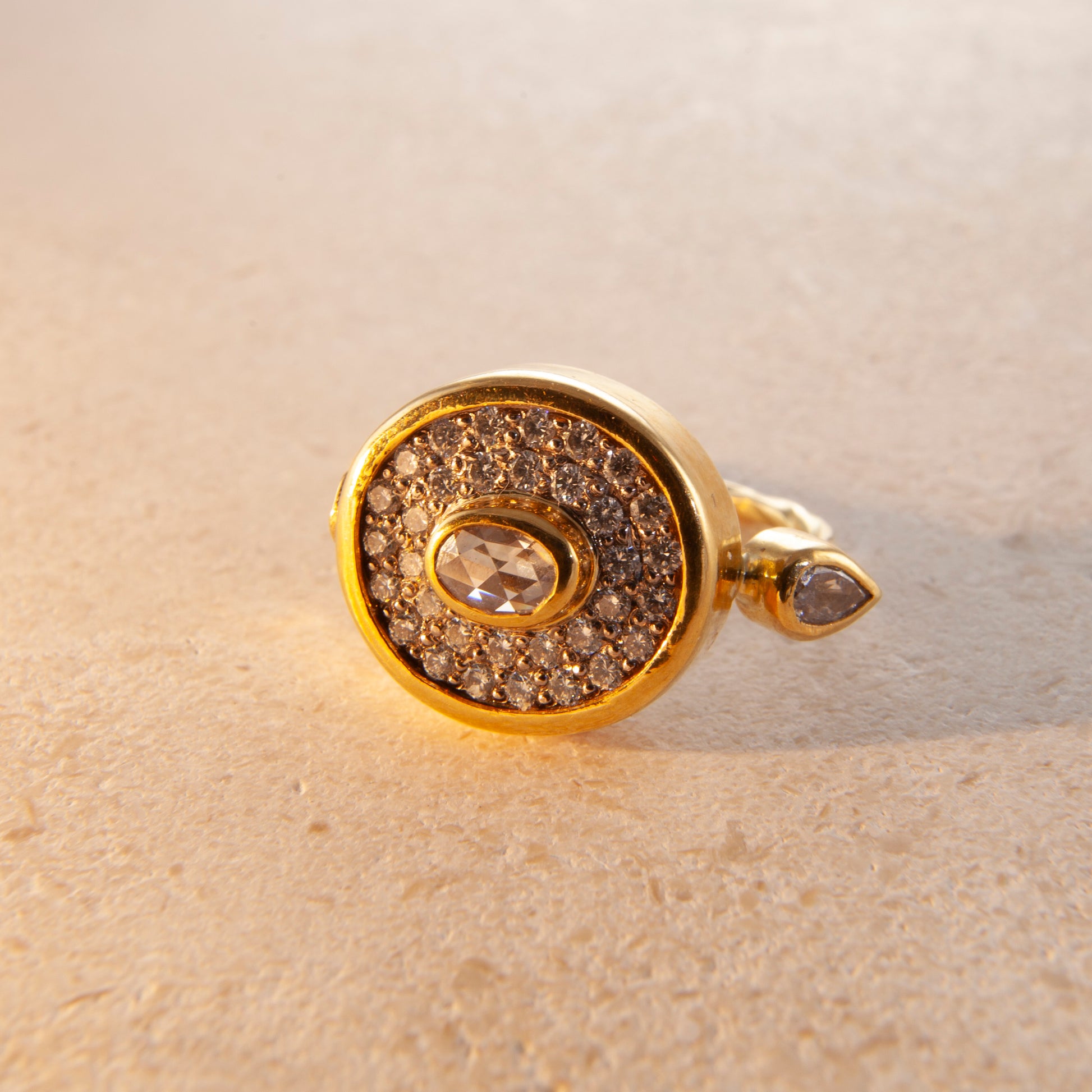 Gems: 0.27 ct. oval antique cut diamond, 0.15 ct. pear shaped diamond, 0.02 ct. TW vs, 33 x 0.015 ct. TW vs brilliant cut diamonds.
