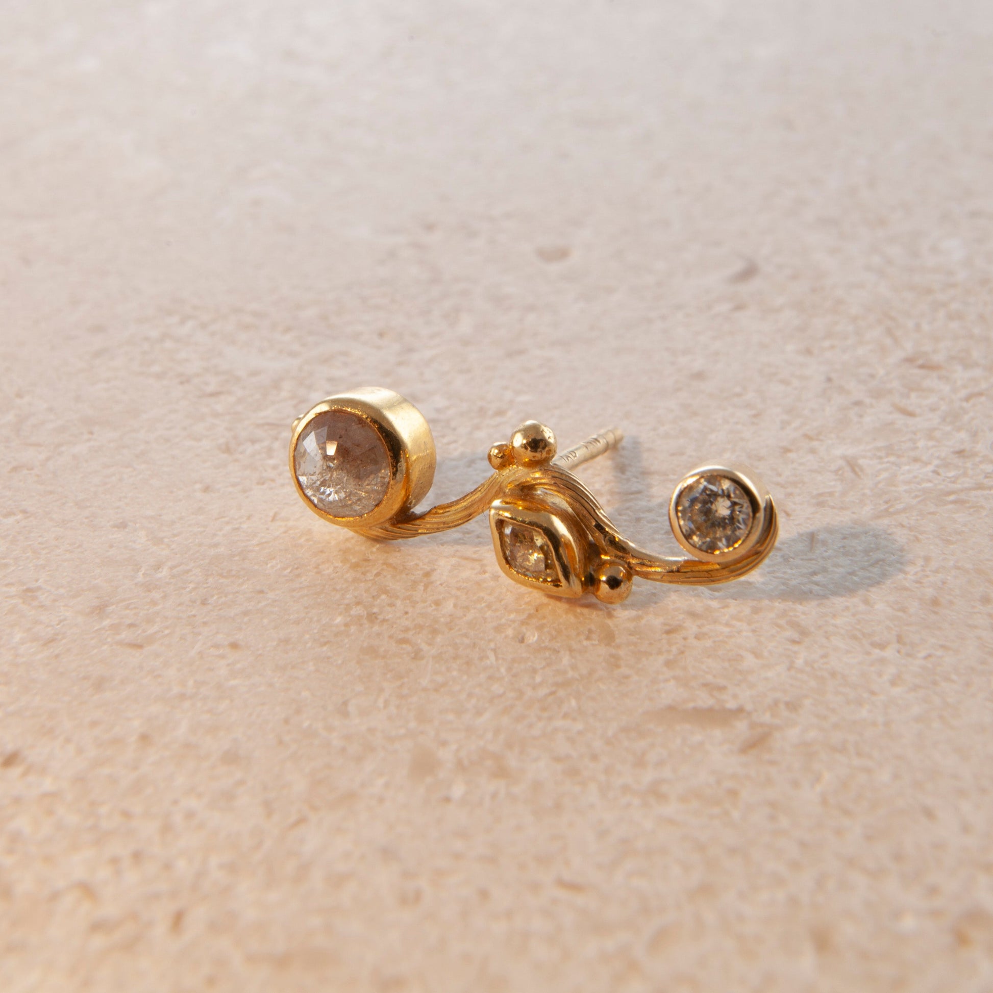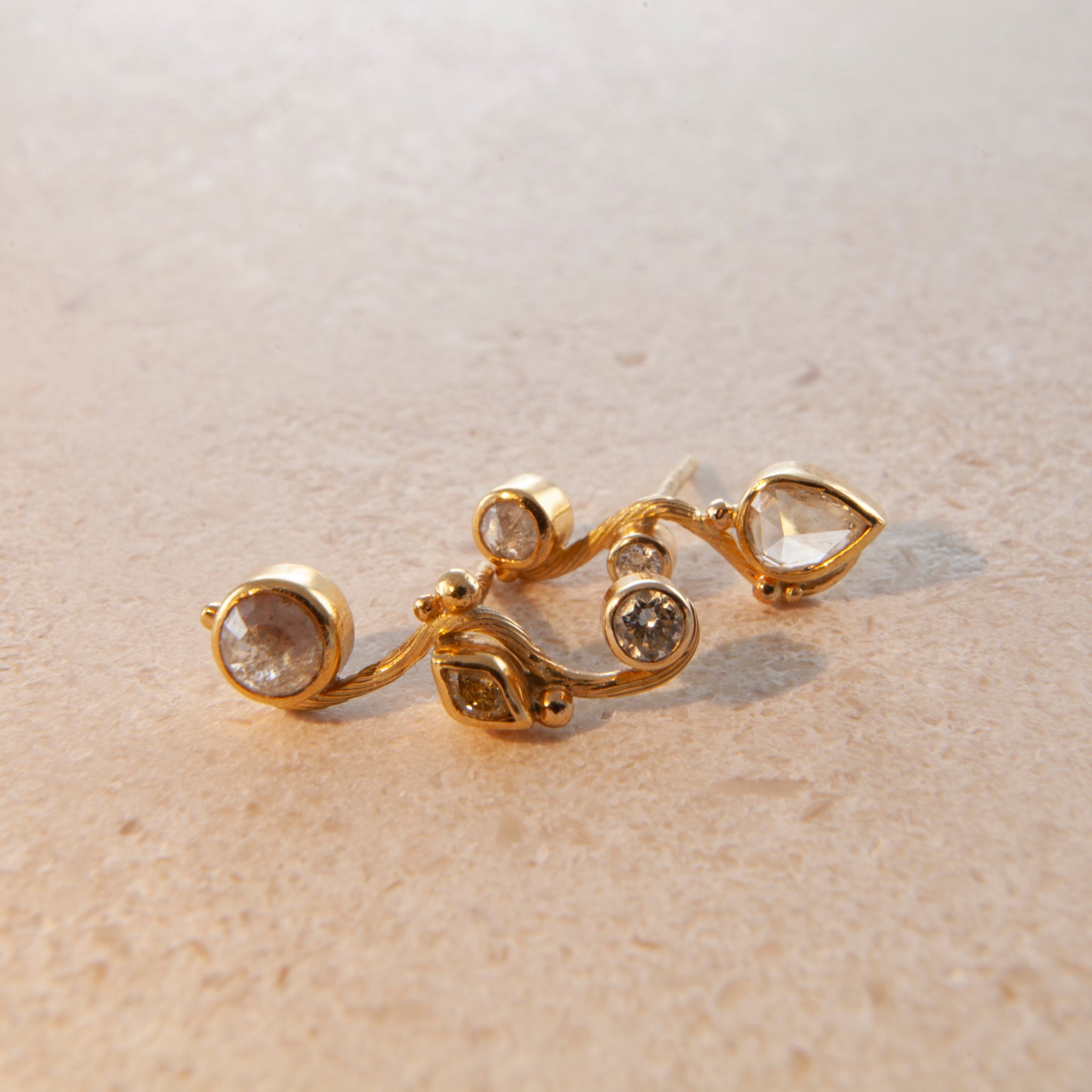 Right Earring: 0.65 ct. ruse cut diamond, 0.09 ct. navette cut diamond, 0.15 ct. brilliant cut diamond