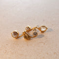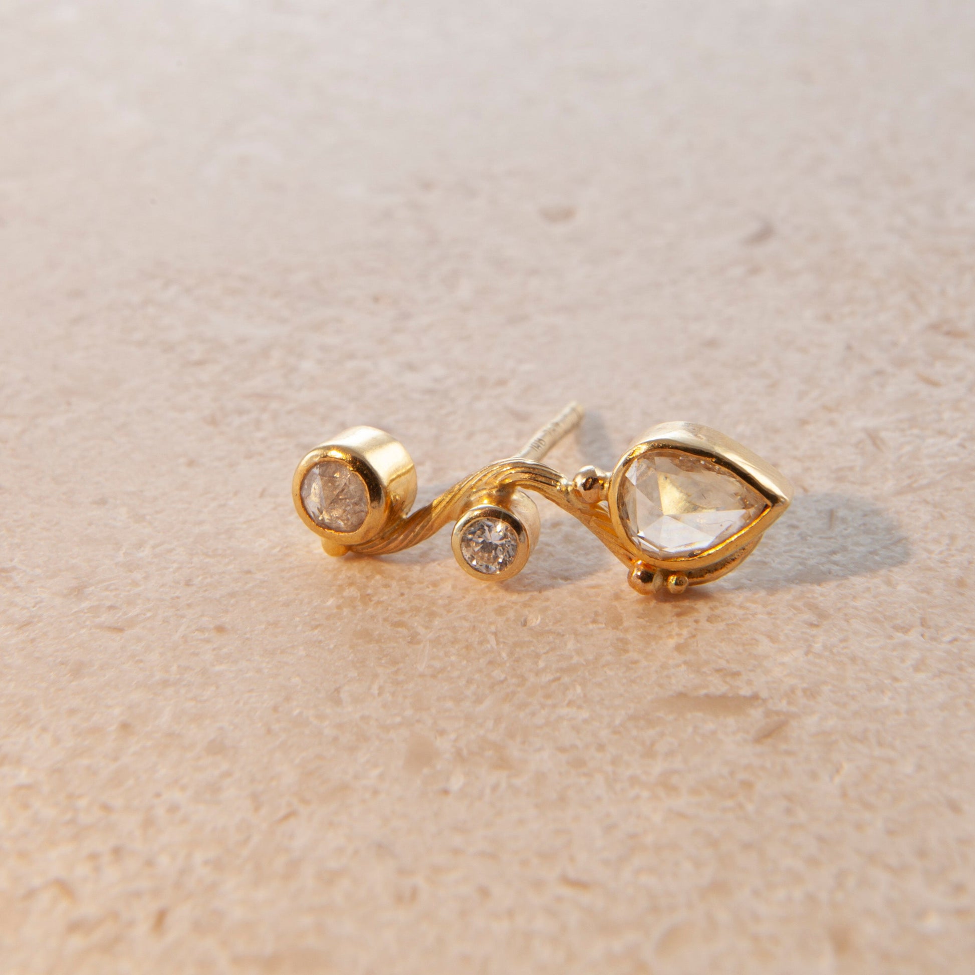 Left Earring: 0.35 ct. pear shaped diamond, 0.17 ct. rose cut diamond, 0.06 ct. tw vs brilliant cut diamond