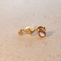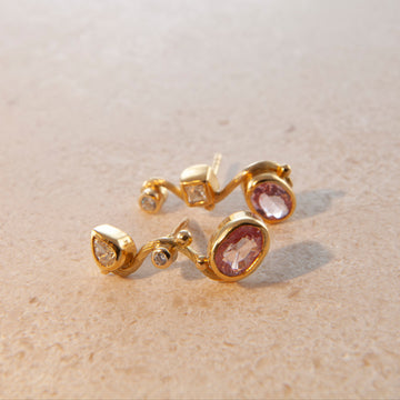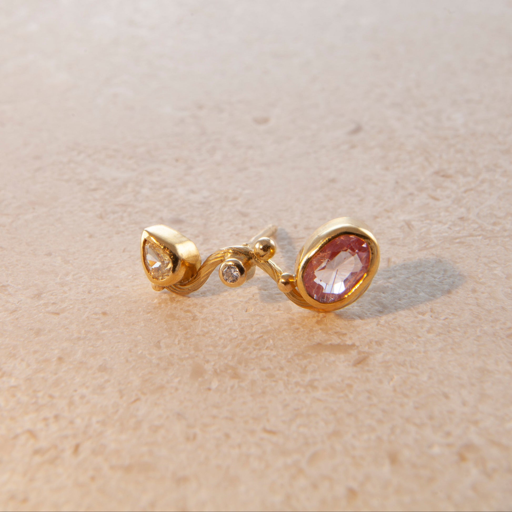 Gems: Pink oval cut sapphires, 0.17 ct. pear shaped diamond, 0.13 ct. princess cut diamond, 0.02 ct., 0.06 ct. TW vs brilliant cut diamonds.