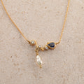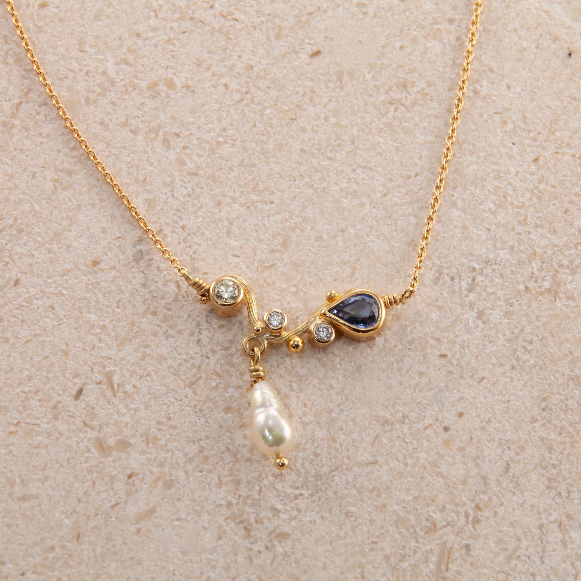 Gems: Blue Sapphire, 0.14 ct. Brilliant cut Diamond, 2 x 0.04 ct. TW. vs Brilliant cut Diamonds, Keshi Pearls