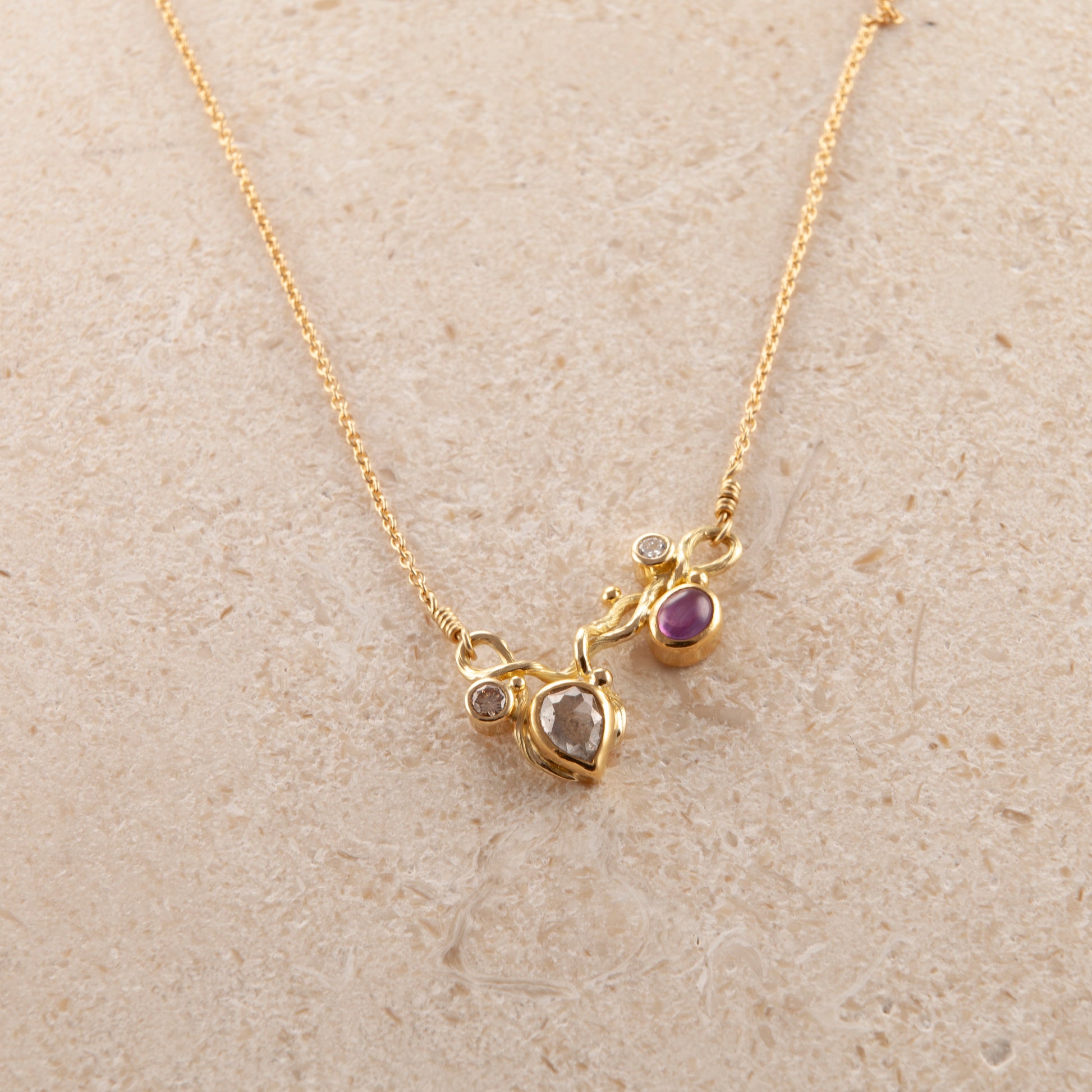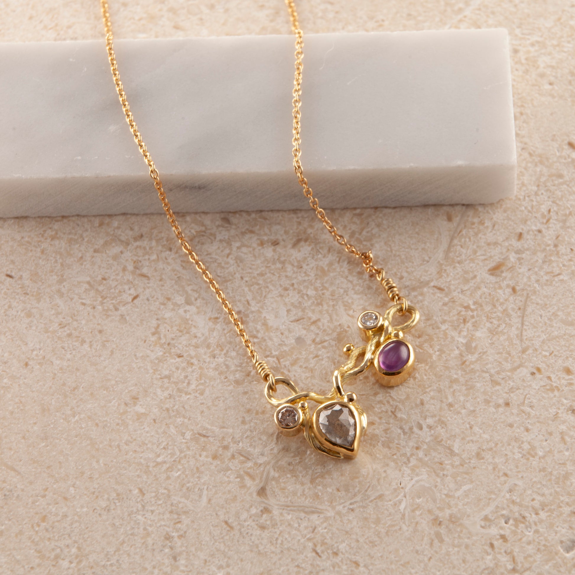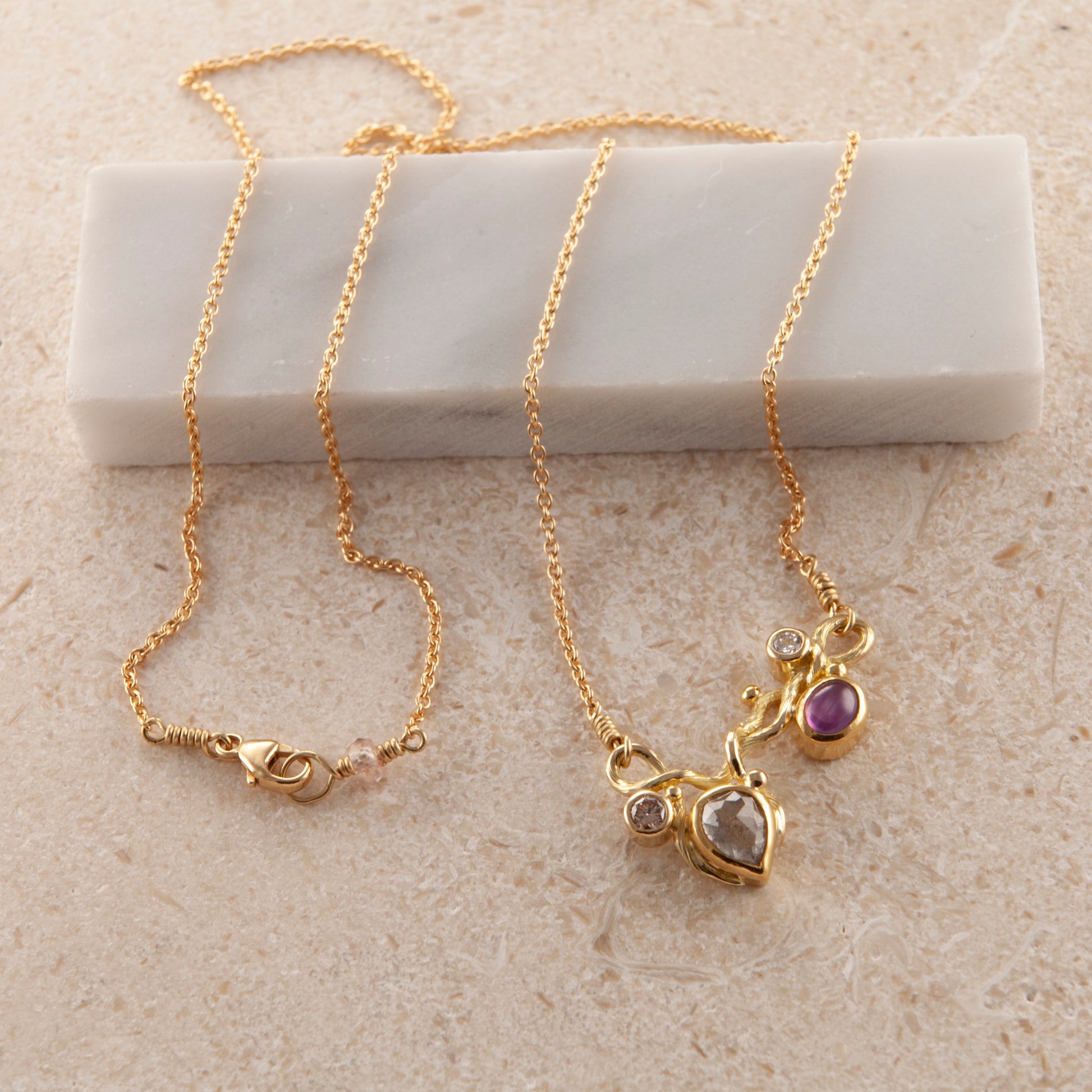 Gems: 0.88 ct. antique cut diamond, ruby, 0.09 ct. champagne brilliant cut diamond, 0.06 TW vs brilliant cut diamond