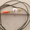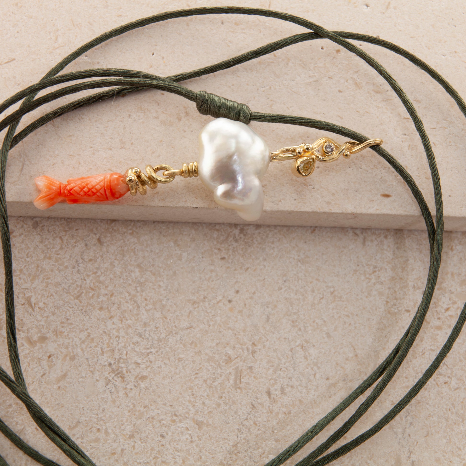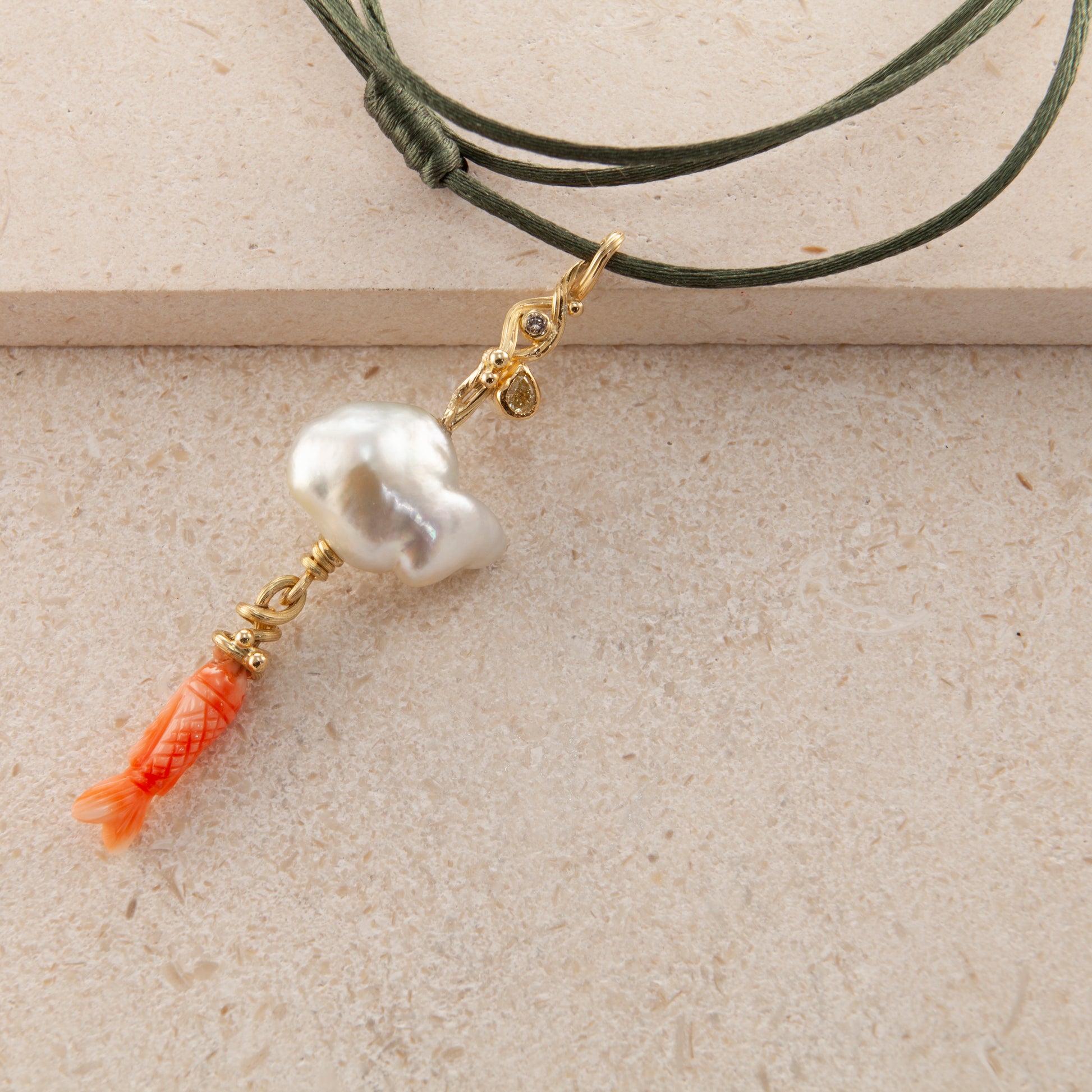 Gems: 0.11 ct. Pear Shaped Yellow Diamond, South Sea Pearl, Hand carved Coral Koi Fish, 0.04 ct. Champagne Brilliant Cut Diamond