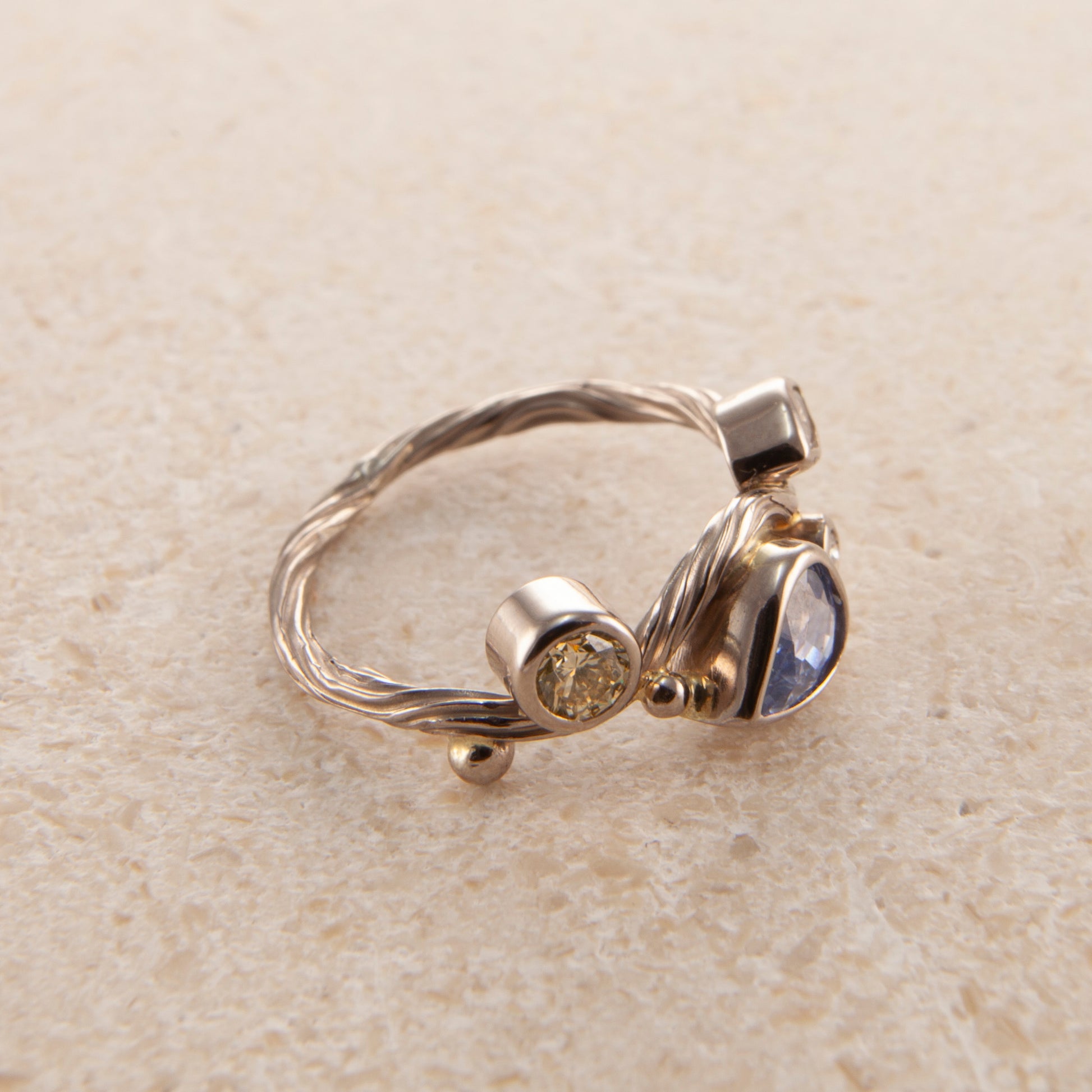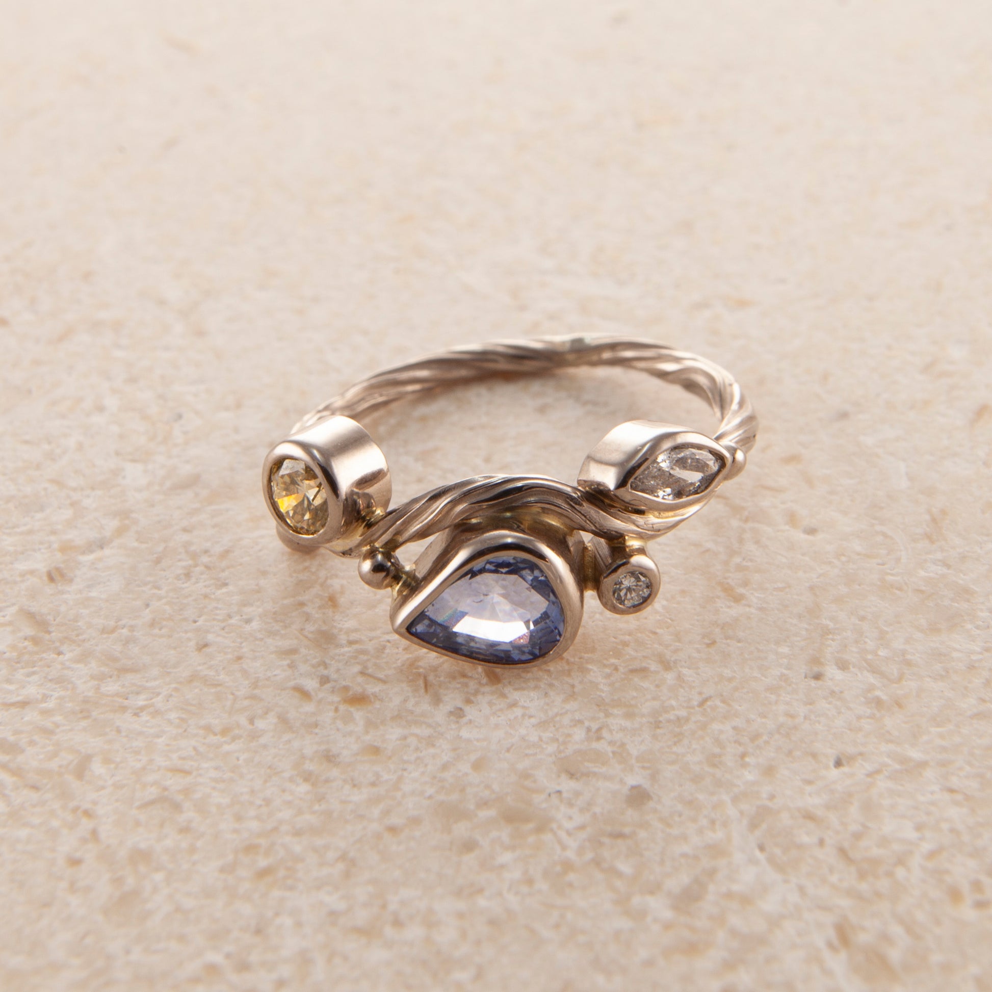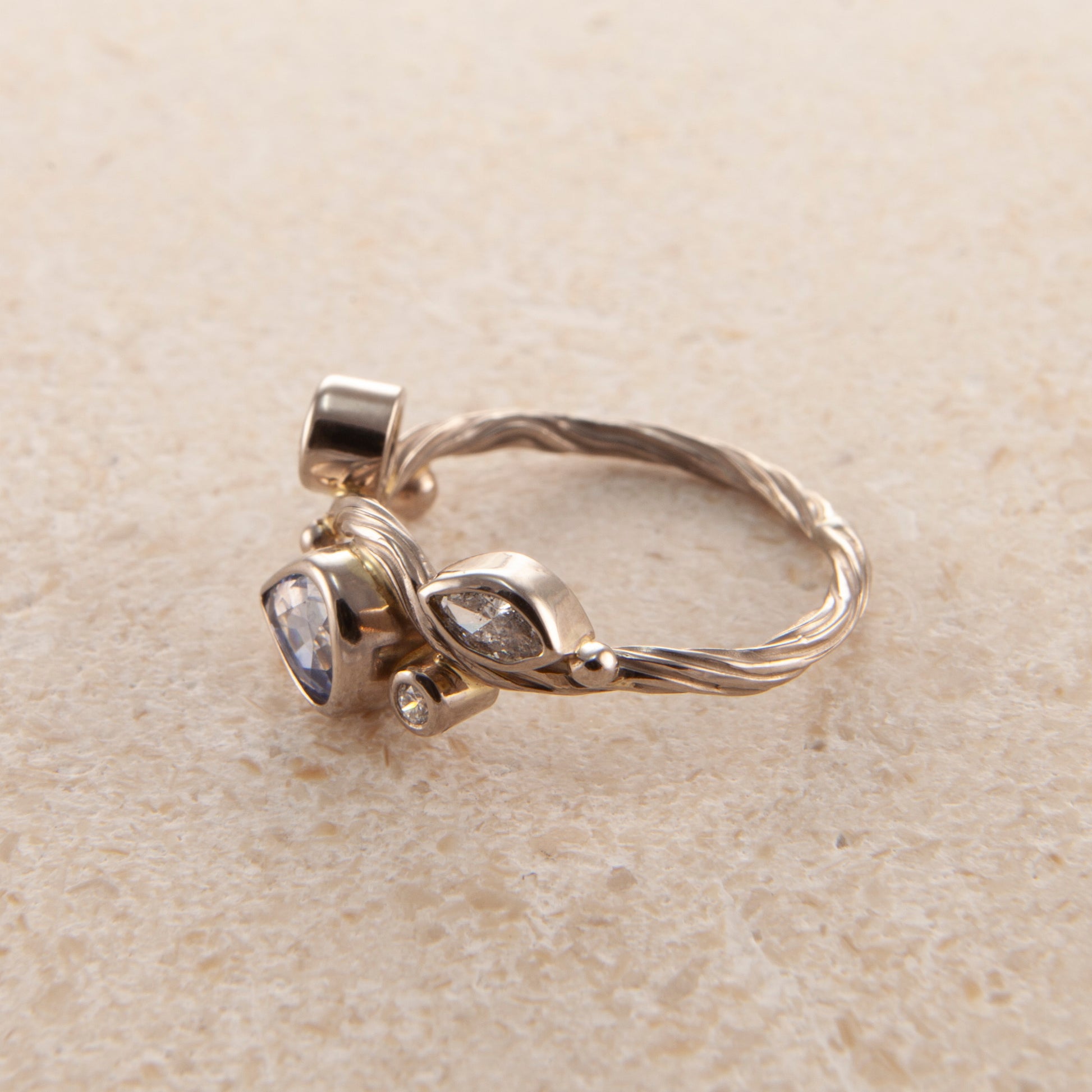 Gemstone: Pear shaped blue sapphire, 0.07 ct. navette cut diamond, 0.17 ct. & 0.02 ct. TW vs brilliant cut diamonds.