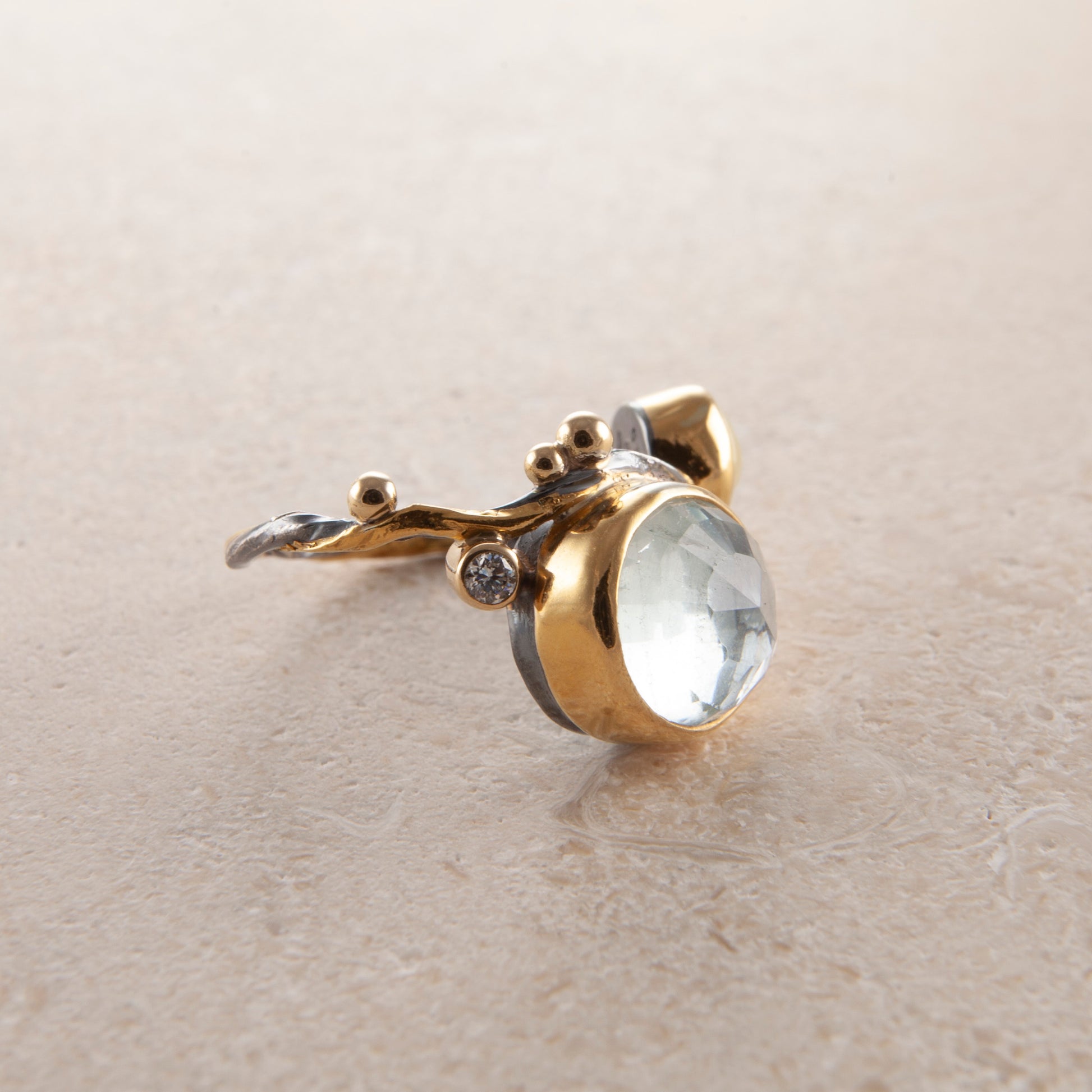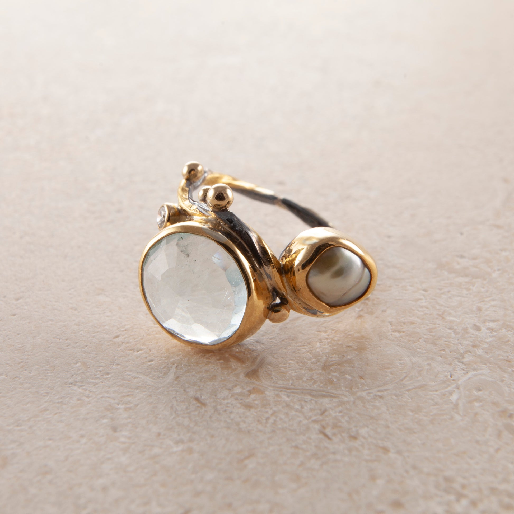 Gems: Aquamarine, 0.04 ct. TW vs brilliant cut Diamond, keshi Pearl.