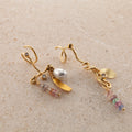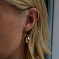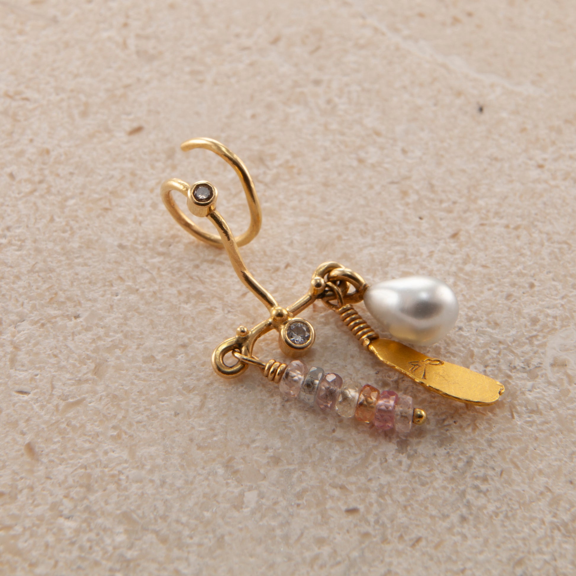 Gems left ear: Sapphires, keshi pearl, 0.02 ct. champagne brilliant cut diamond, 0.04 ct. TW brilliant cut diamond