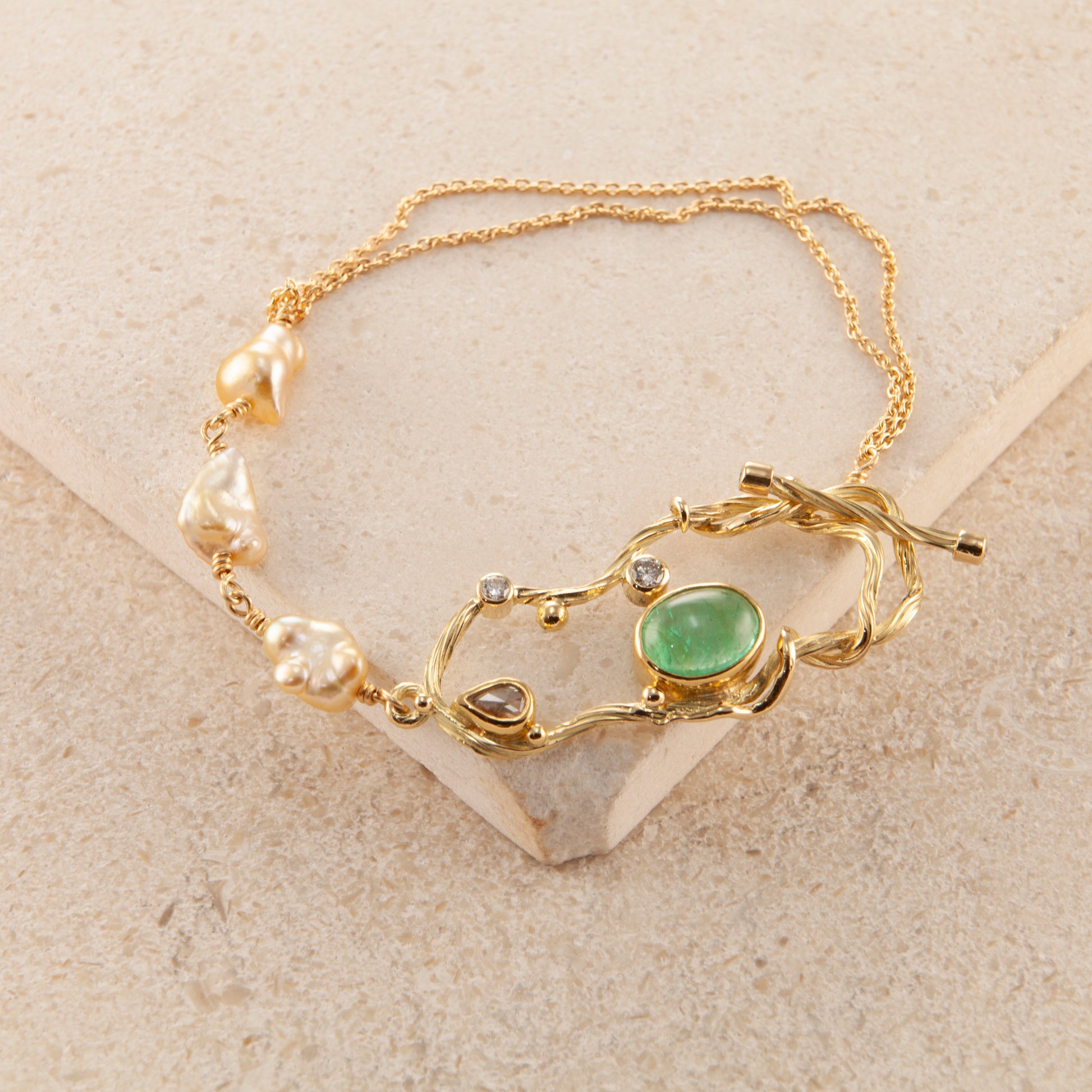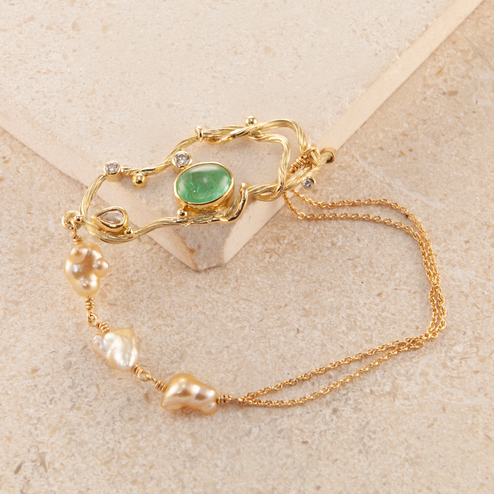 Ædelsten: 1.70 ct. Smaragd, 0.07 ct. antik cut dråbeformet Diamant, 0.07 ct. champagne brilliant cut Diamant, 0.04 ct. TW vs brilliant cut Diamant, 2 x 0.02 ct. TW vs brillant cut Diamanter, 3 x gyldne Keshi Perler.