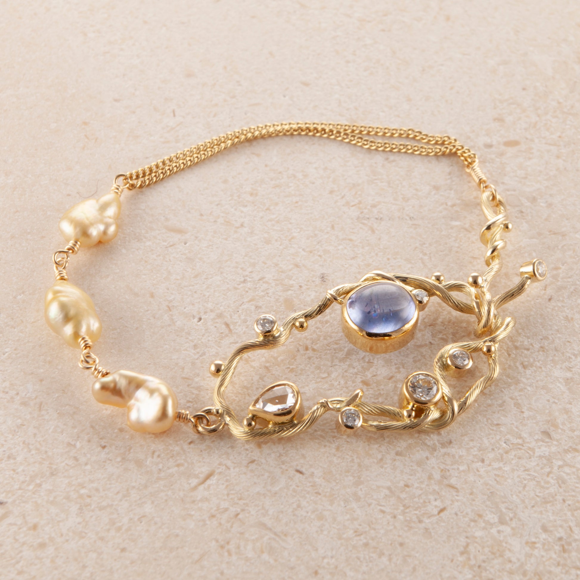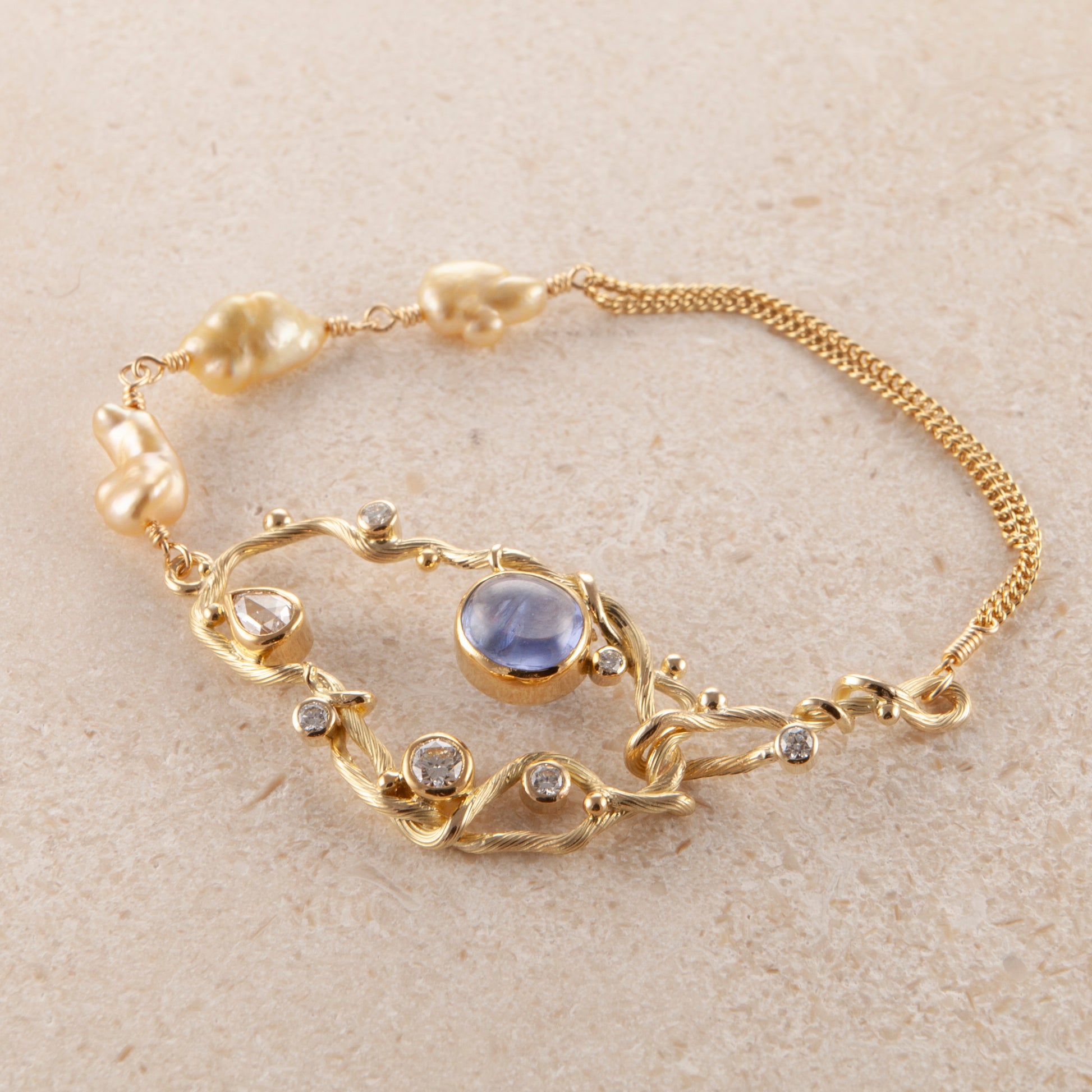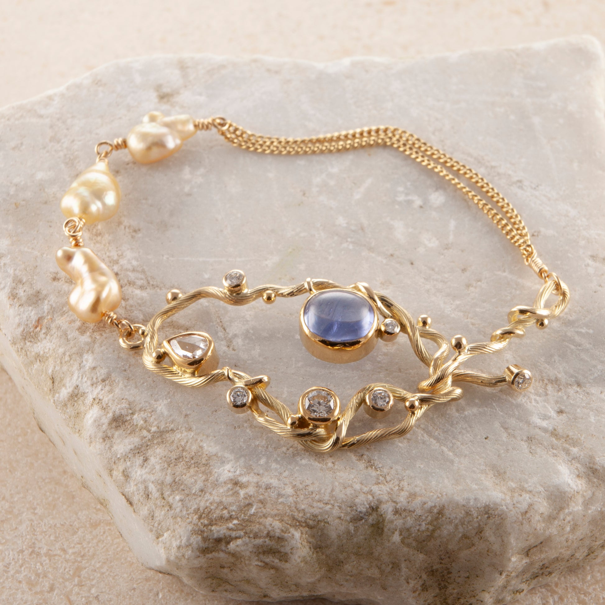 Ædelsten: Blå cabochon safir, 0.28 ct. dråbeformet antik slebet diamant, 0.22 ct. brilliant slebet diamant, 1 x 0.02 ct., 3 x 0.04 ct., 1 x 0.06 ct. TW vs brilliantslebne diamanter, 3 x gyldne keshi pereler
