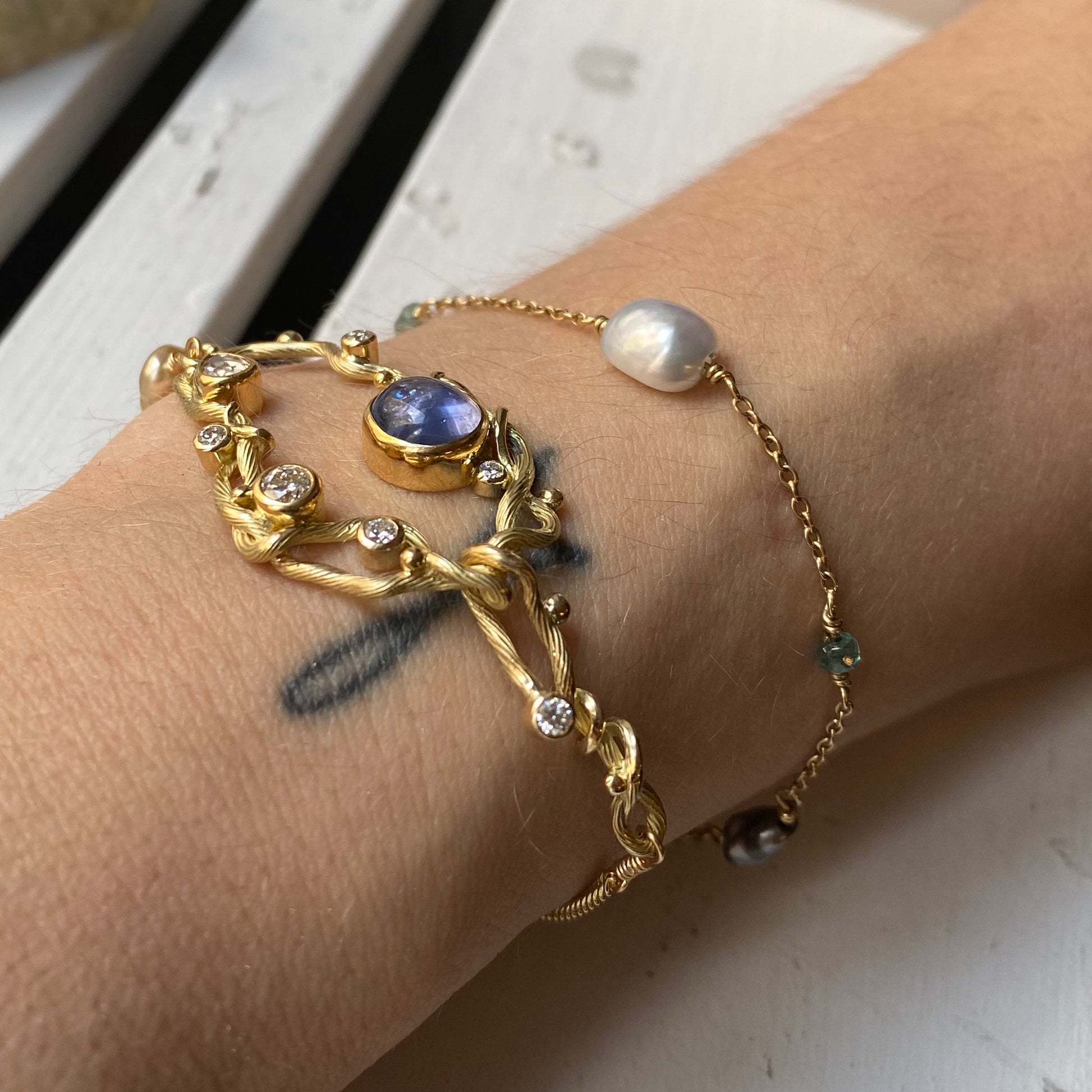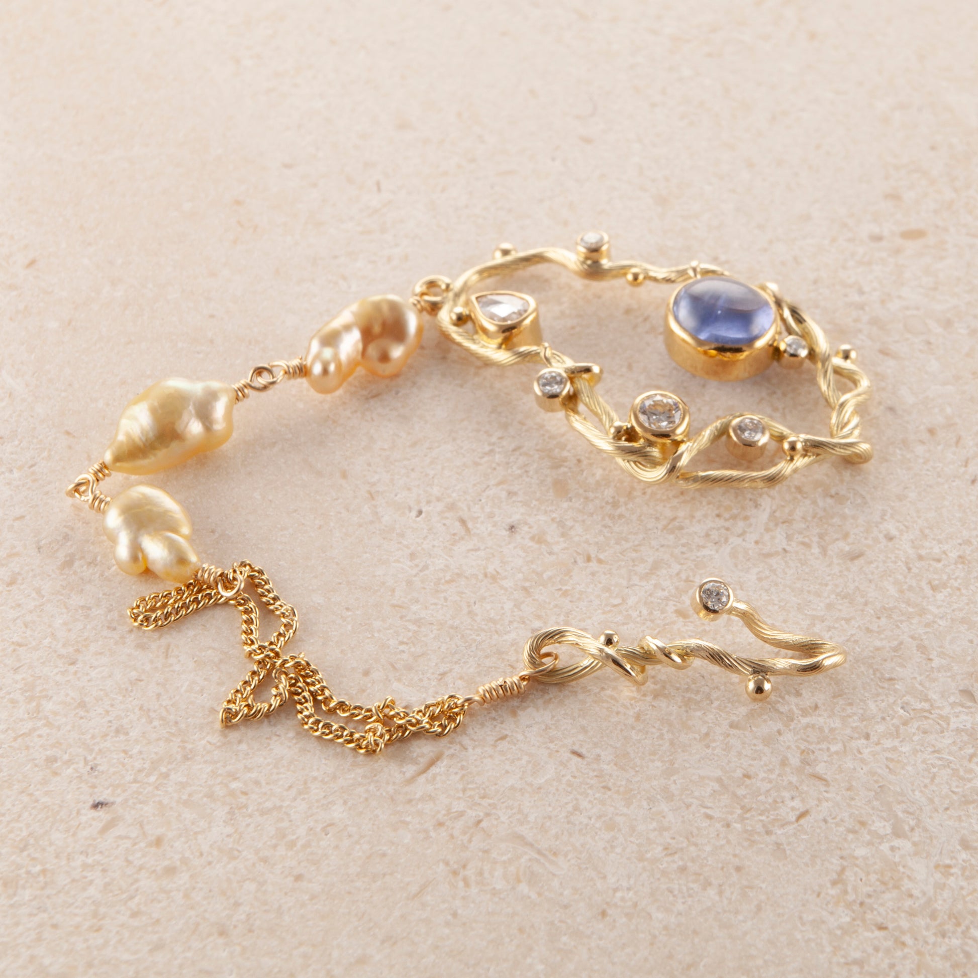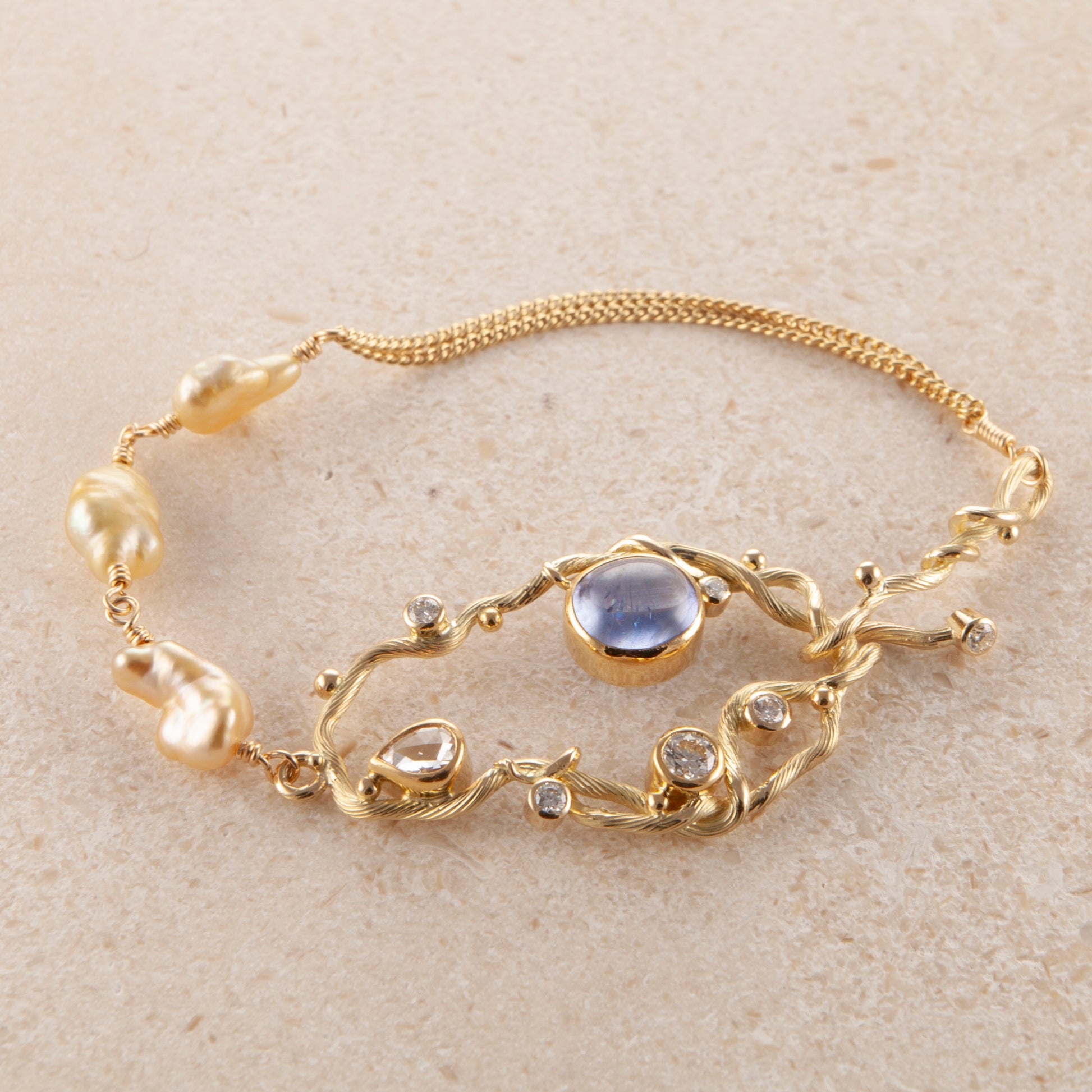 Ædelsten: Blå cabochon safir, 0.28 ct. dråbeformet antik slebet diamant, 0.22 ct. brilliant slebet diamant, 1 x 0.02 ct., 3 x 0.04 ct., 1 x 0.06 ct. TW vs brilliantslebne diamanter, 3 x gyldne keshi pereler