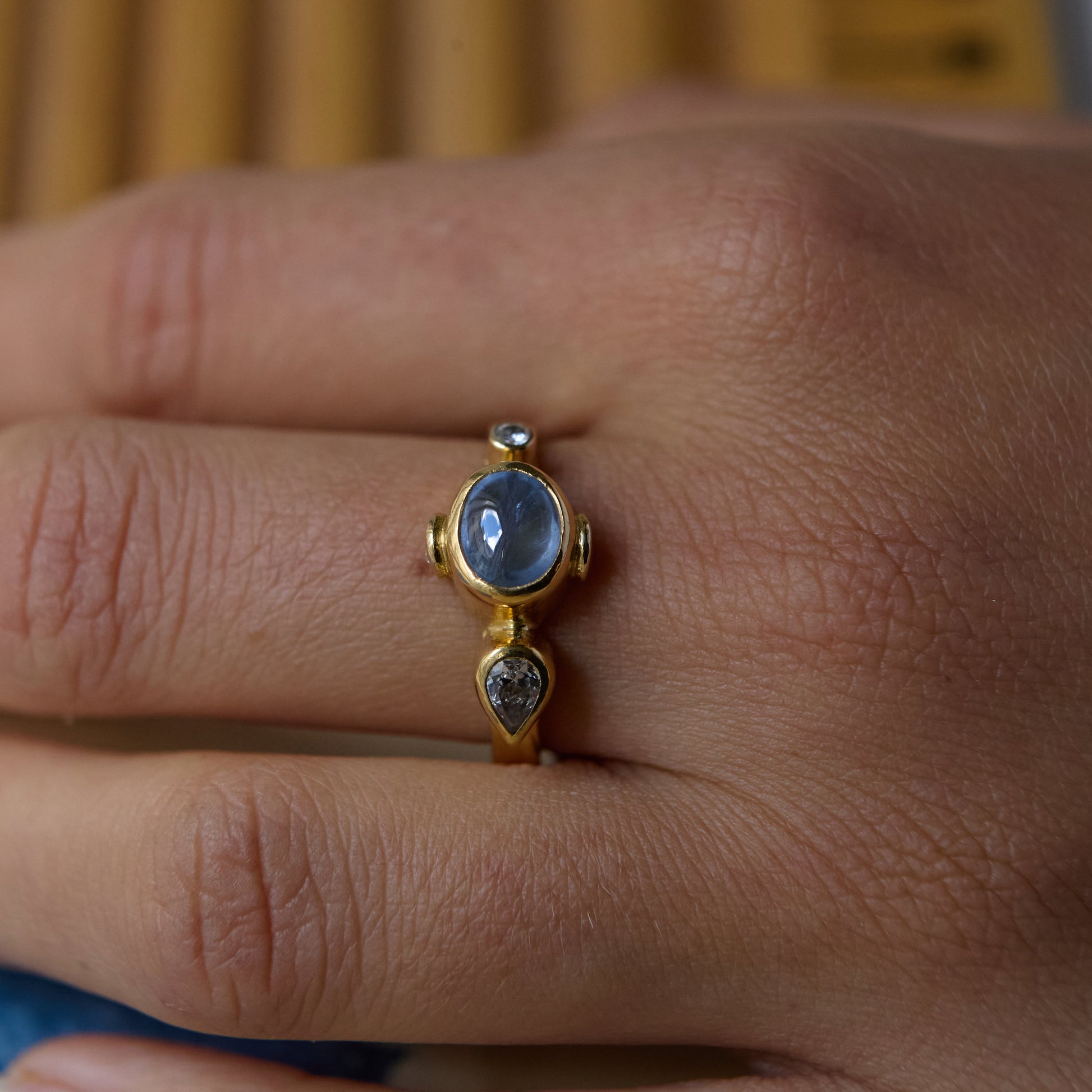 Ædelsten: Blå safir, 0,24 ct. pæreformet diamant, 3 x 0,04 ct. TW vs. brillantslebne diamanter.