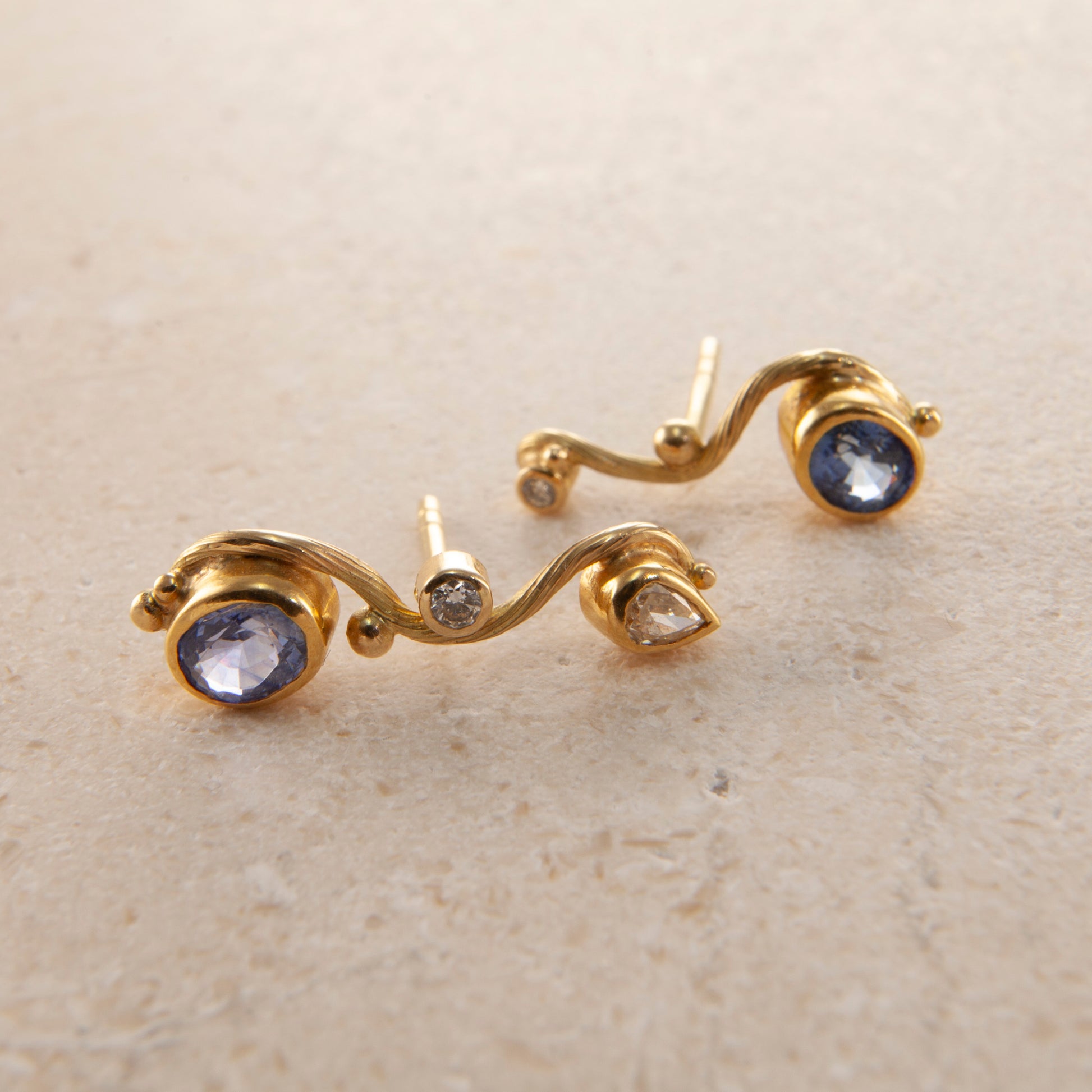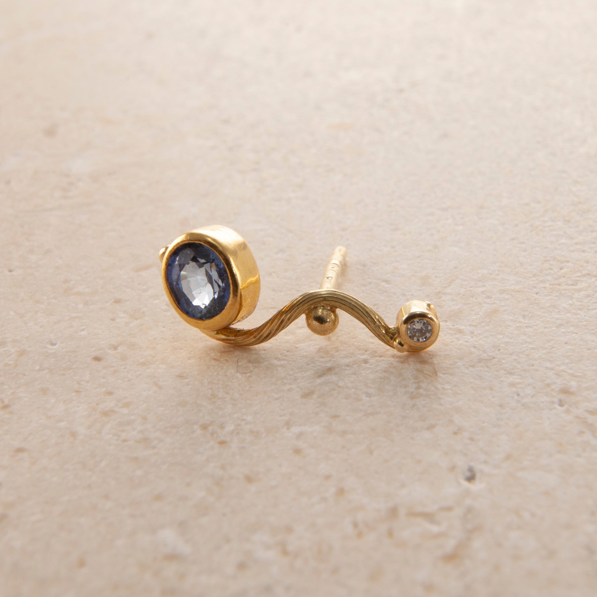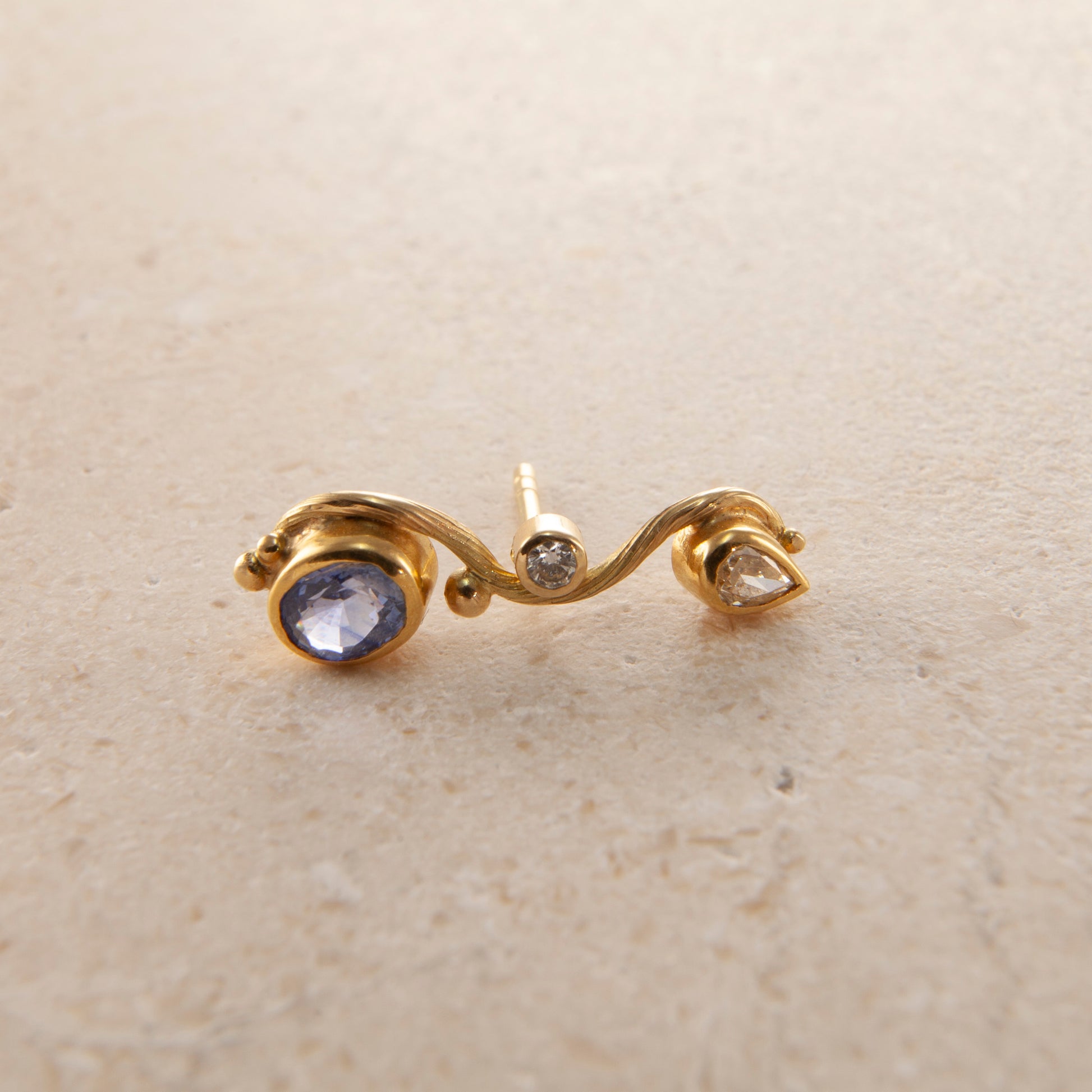 Ædelsten: Blå safirer, 0,14 ct. gul pæreformet diamant, 0,02 ct., 0,04 ct. TW vs. brillantslebne diamanter
