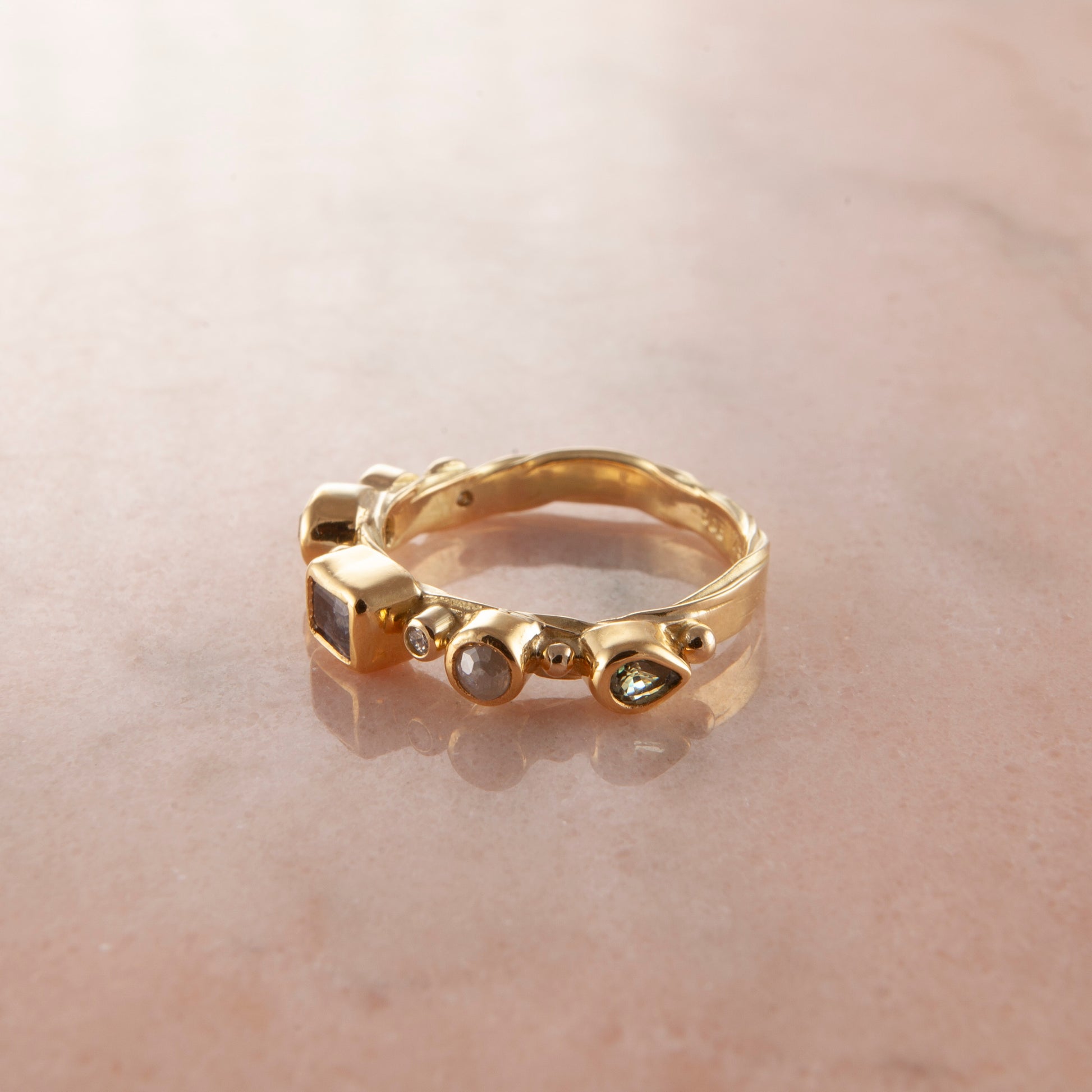 Ædelsten: Safir, 0.20 ct. oval antikslebet diamant, 0.19 ct. rosenslebet diamant, 0.09 ct. champagnefarvet brilliantslebet diamant, dråbeformet safir, 2 x 0.02 TW vs brilliant slebet diamanter