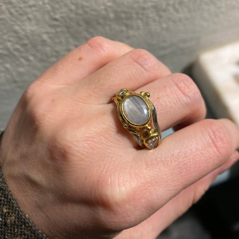 Ædelsten: Stjerne safir, 0.33 ct. antik cut Diamant, 0.18 ct. brilliant cut Diamant.