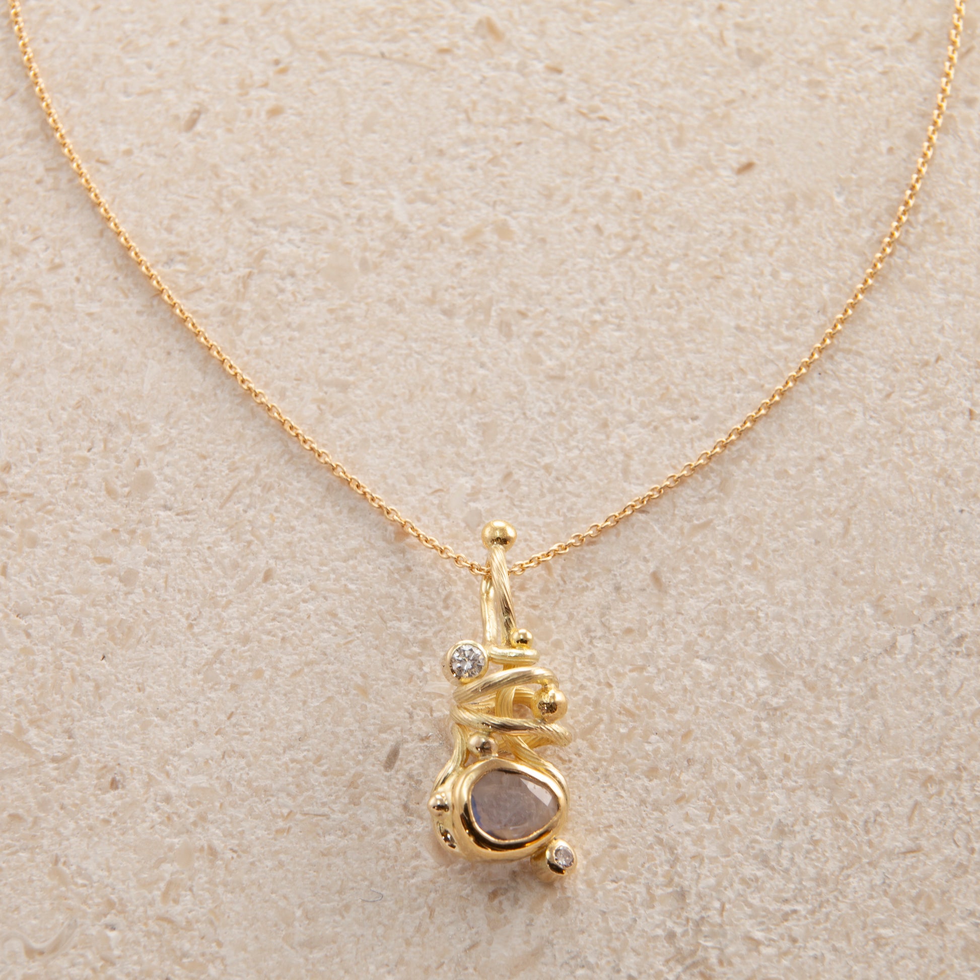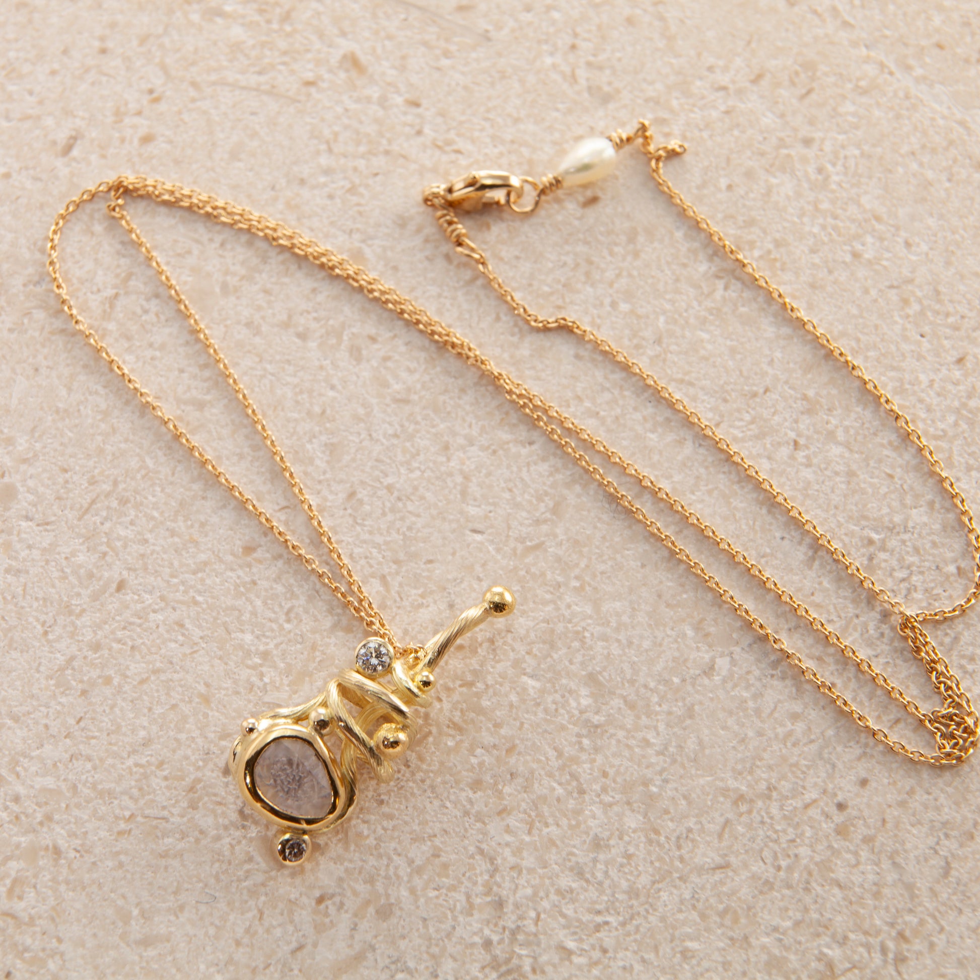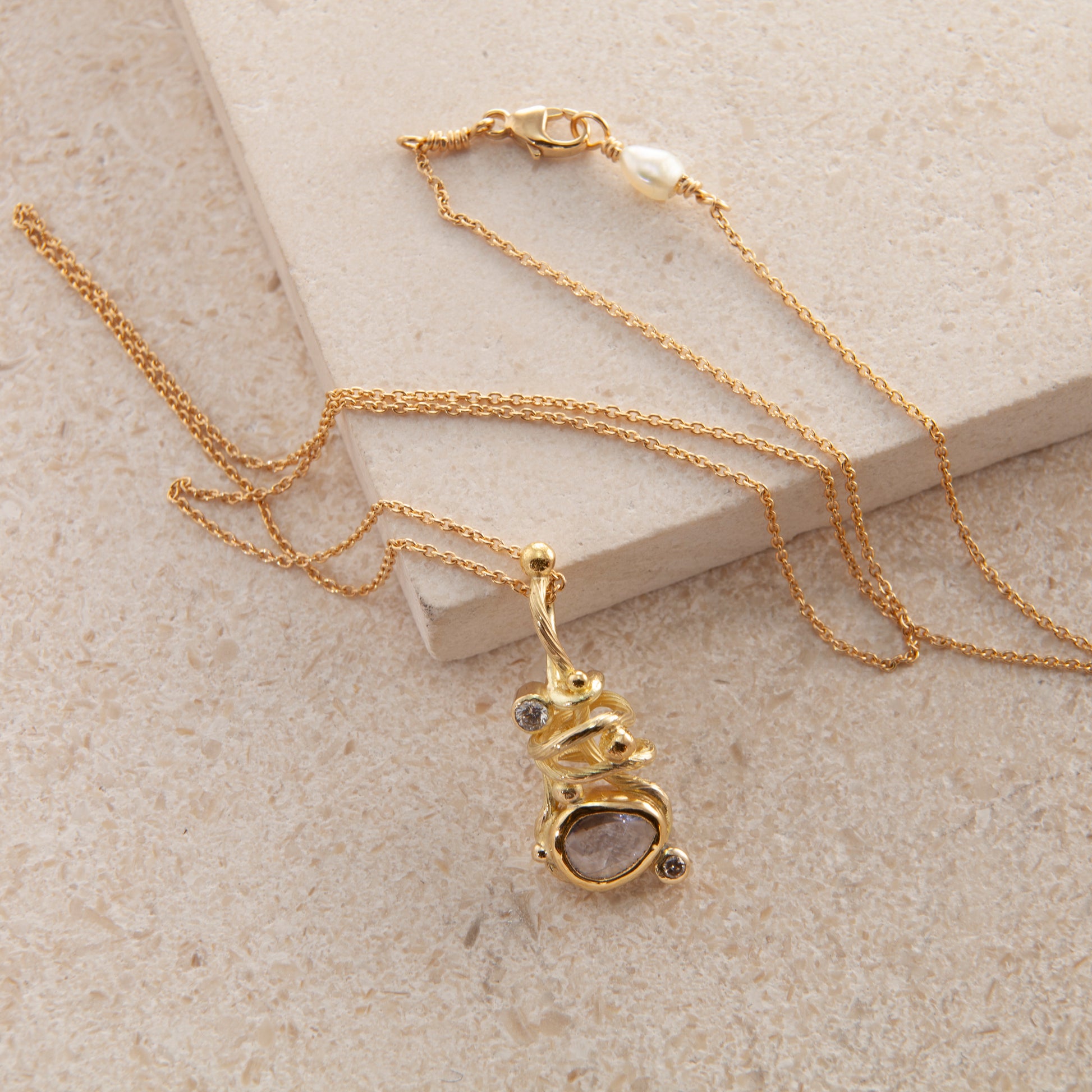 Ædelsten: Blå cabochon-safir, keshi-perle, 0,08 ct. champagnefarvet brillantslebet diamant, 0,02 ct. TW VS brillantslebet diamant.