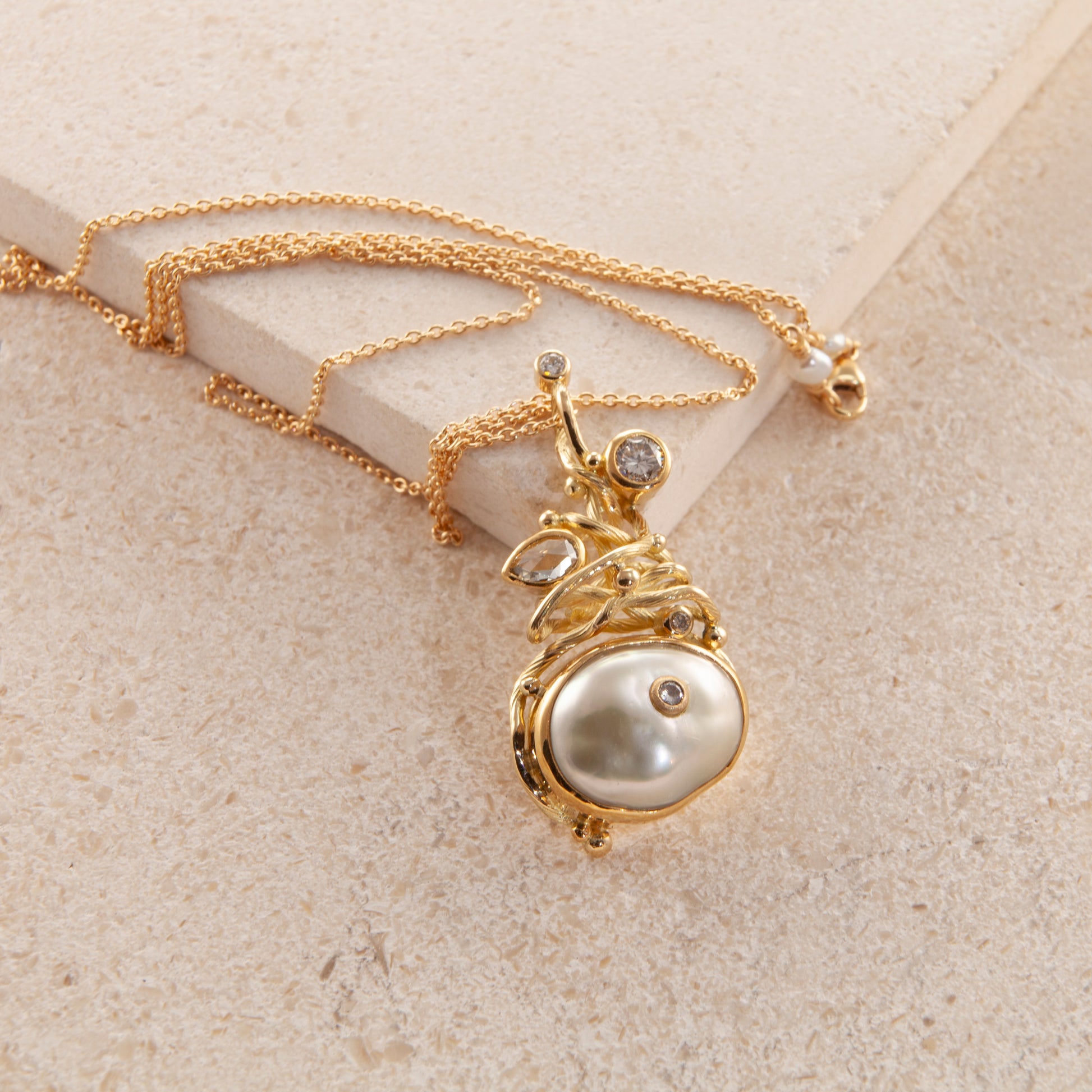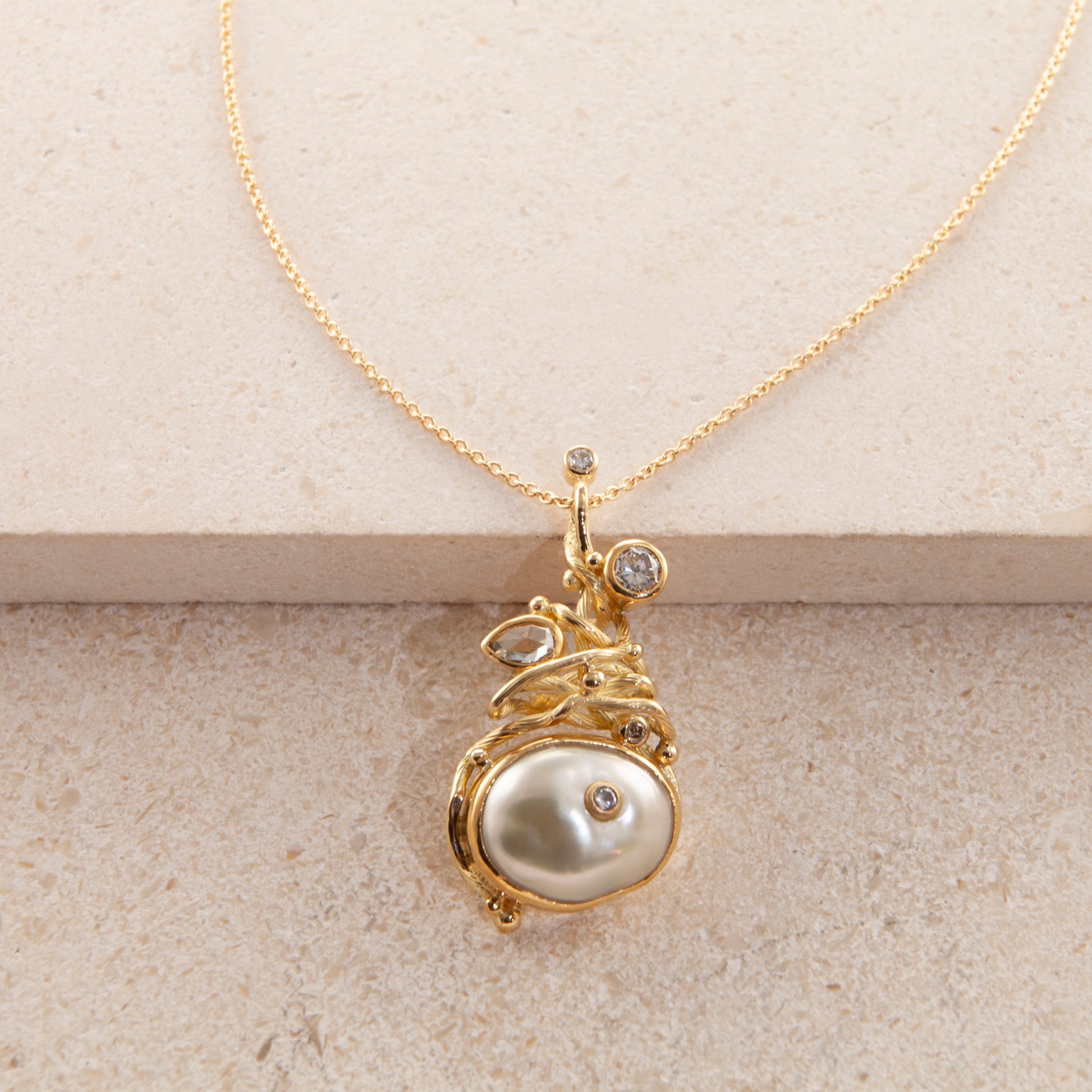 Ædelsten: 0.31 ct. Brilliant cut Diamant, 0.28 ct. Antique cut Diamant, 2 x 0.04 ct.TW vs brilliant cut Diamanter, 0.02 ct. brilliant cut Diamant, Keshi perler.