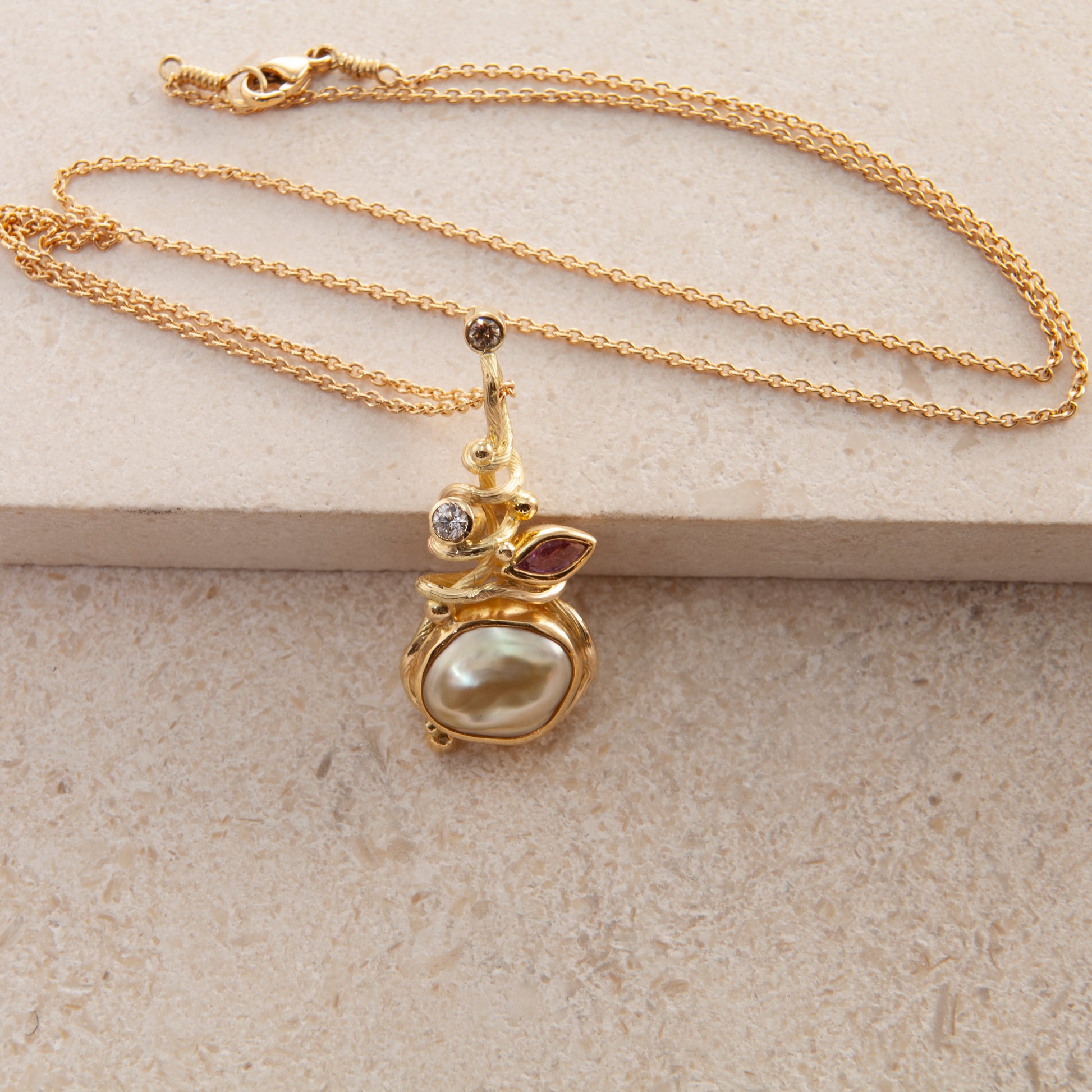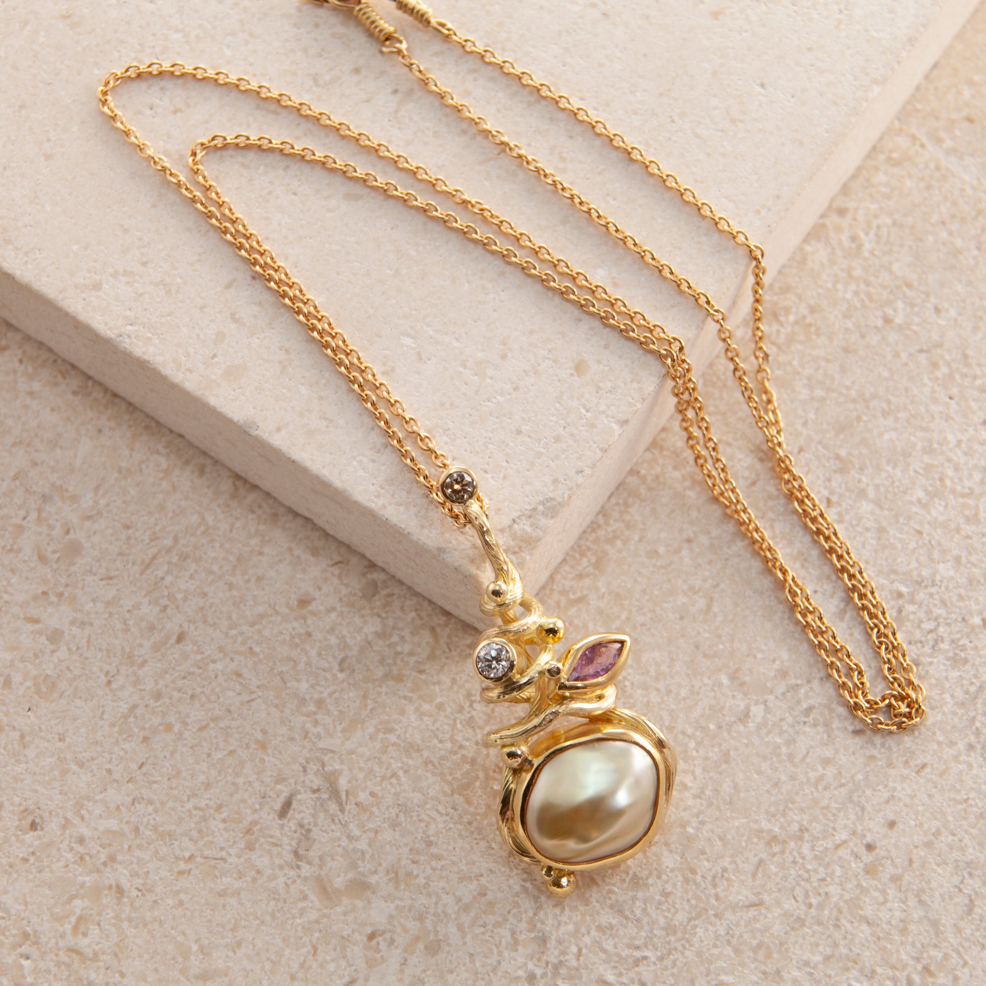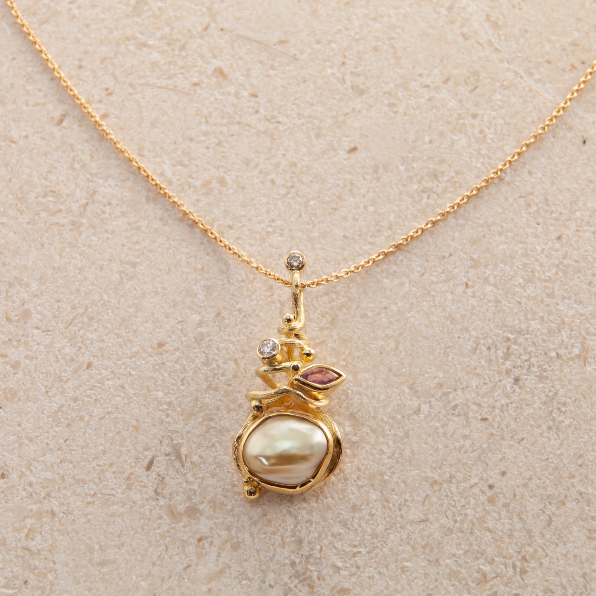 Ædelsten: Pink Navette Sapphire, 06 ct.TW vs brilliant cut Diamant, 0.04 ct. champagne brilliant cut Diamant, gylden keshi perle.