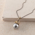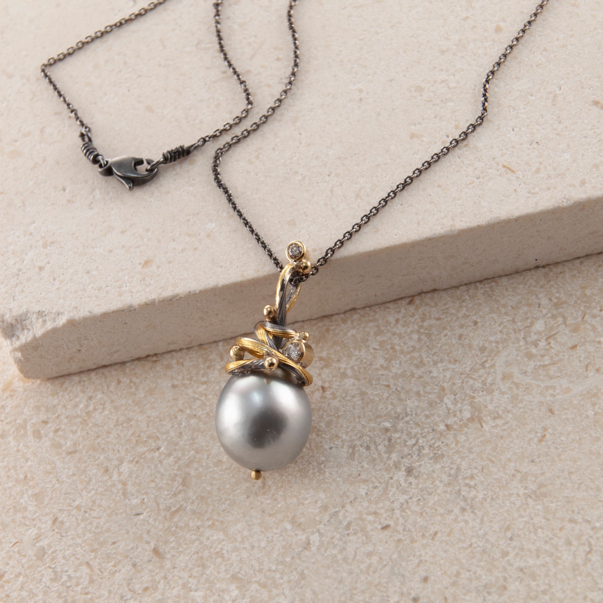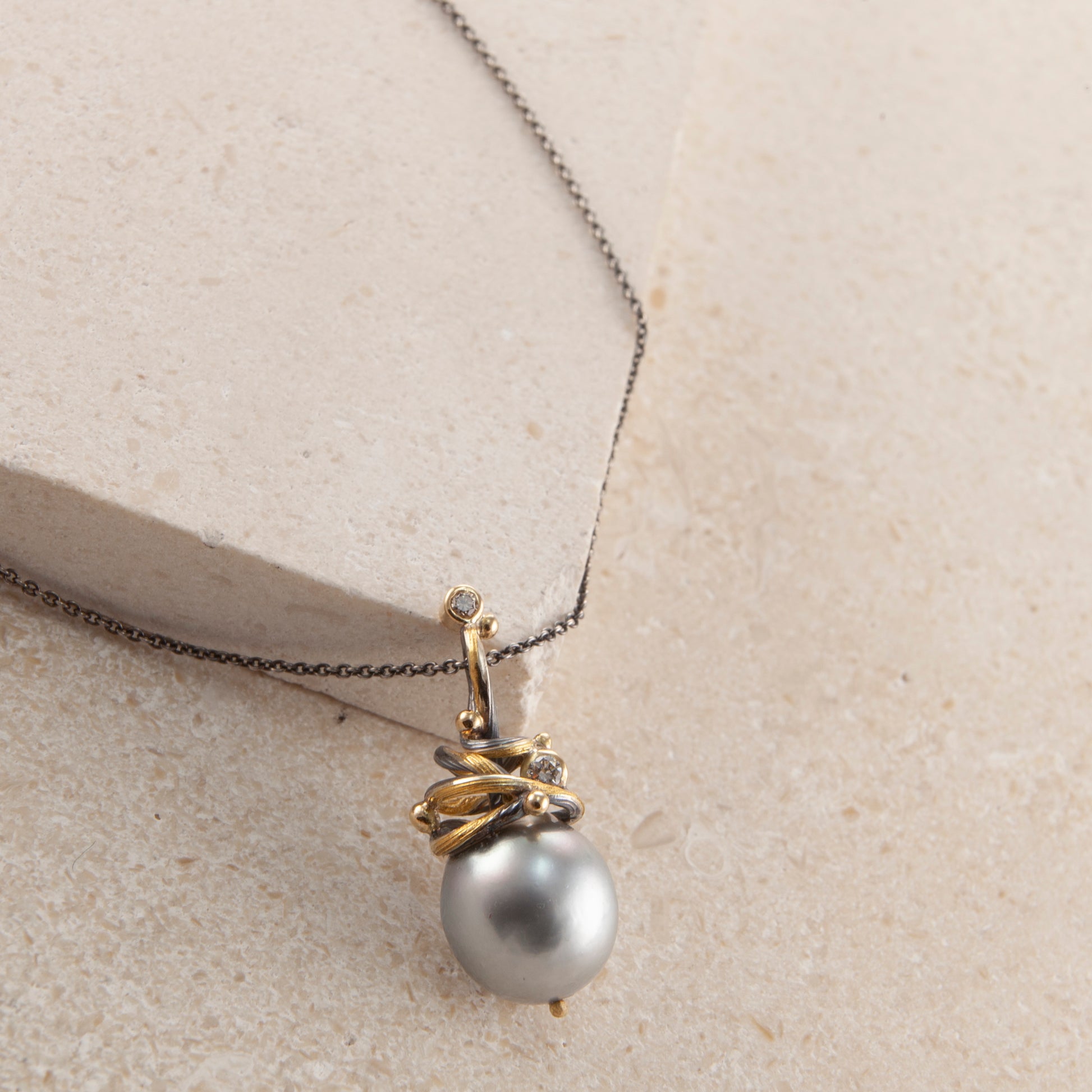 Ædelsten: Tahiti perle, 0.04 ct. TW vs brilliantsleben diamant, 0.02 ct. champagnefarvet brilliantsleben diamant