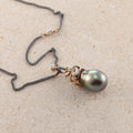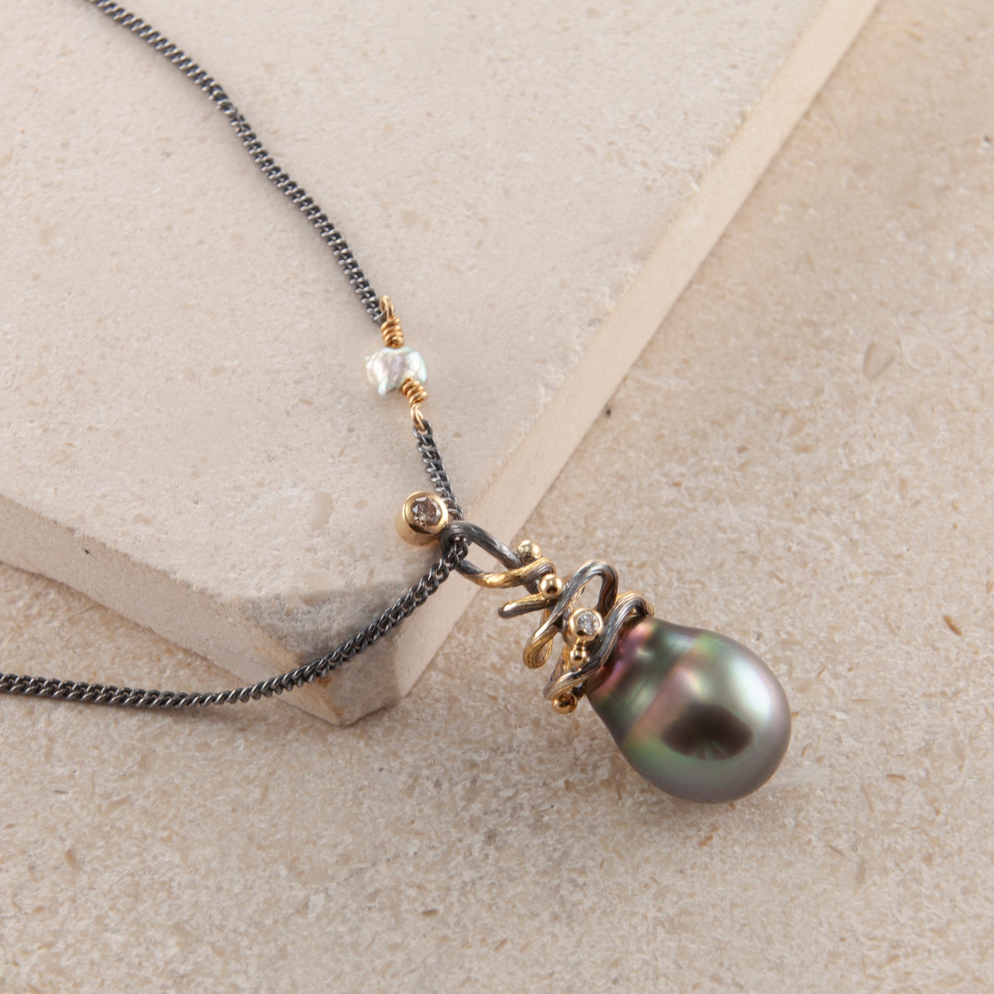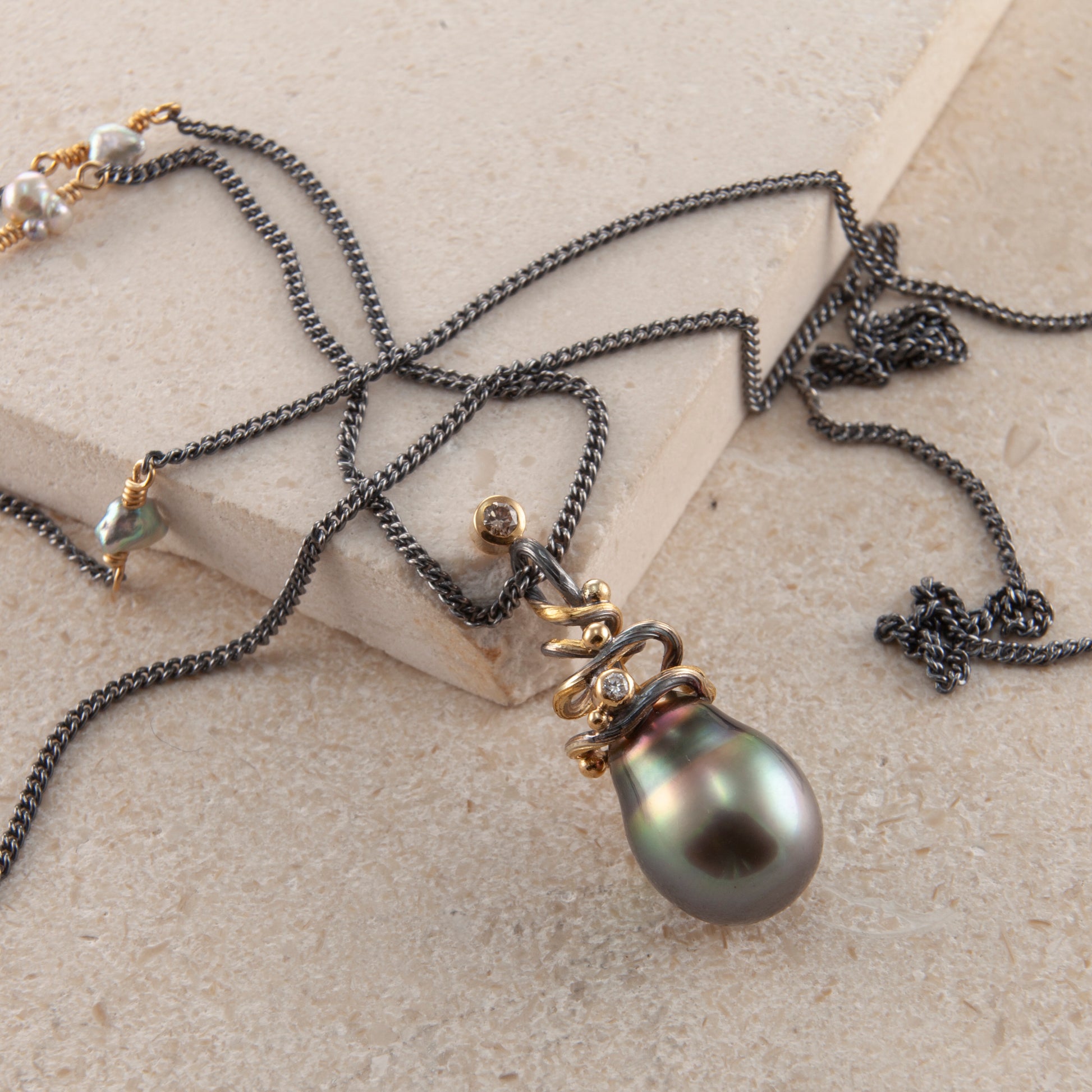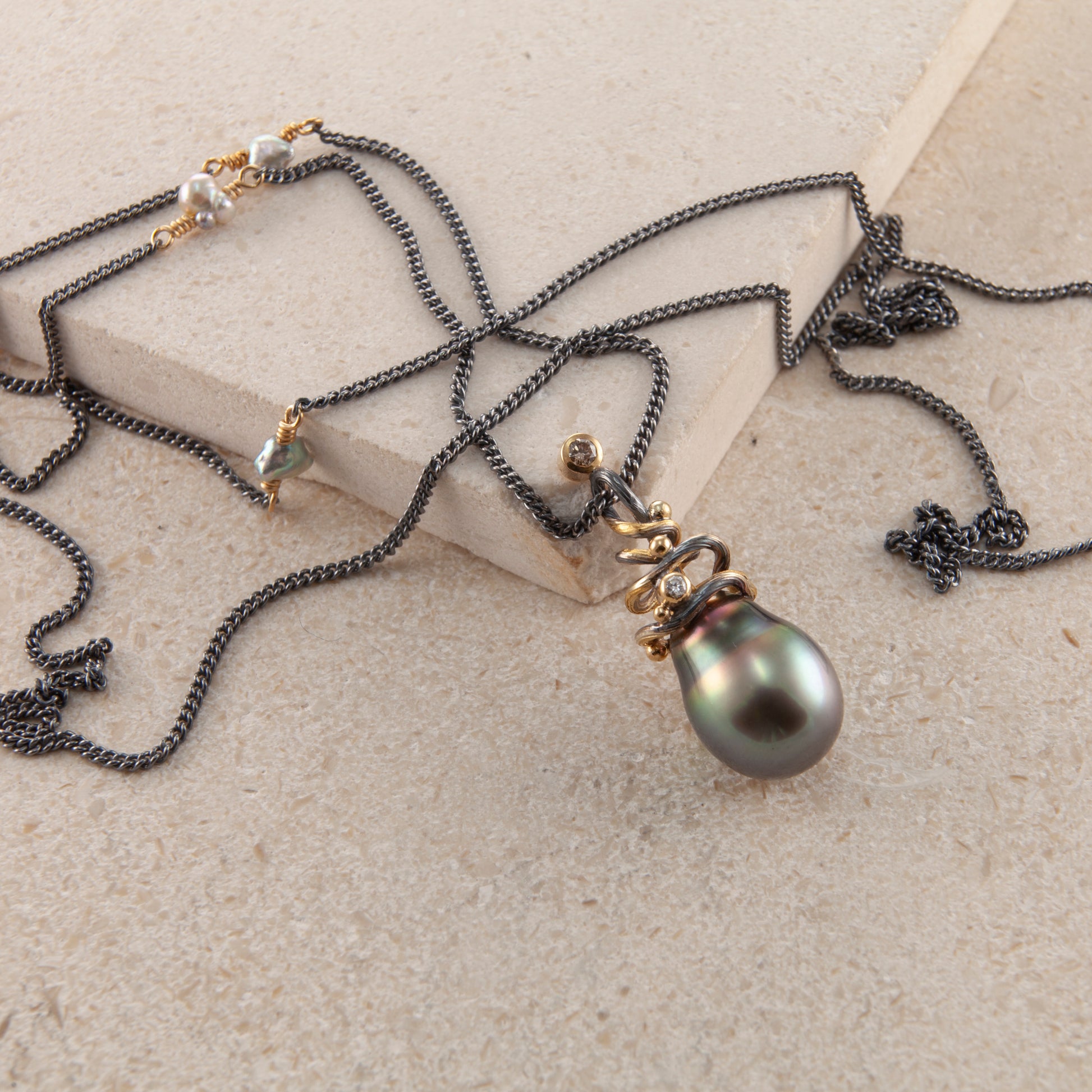 Ædelsten: Tahiti perle, 0.06 ct. champagnefarvet brilliantsleben diamant, 0.02 ct. TW vs brilliantsleben diamant, 3 x keshi perler