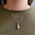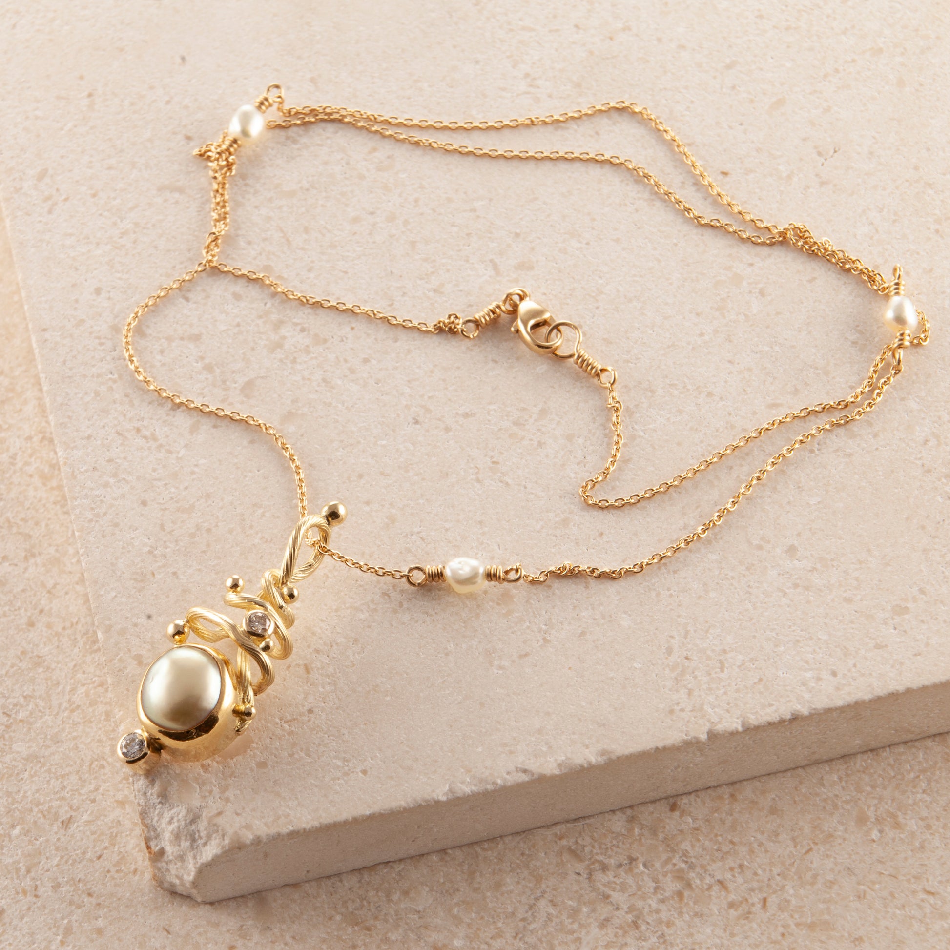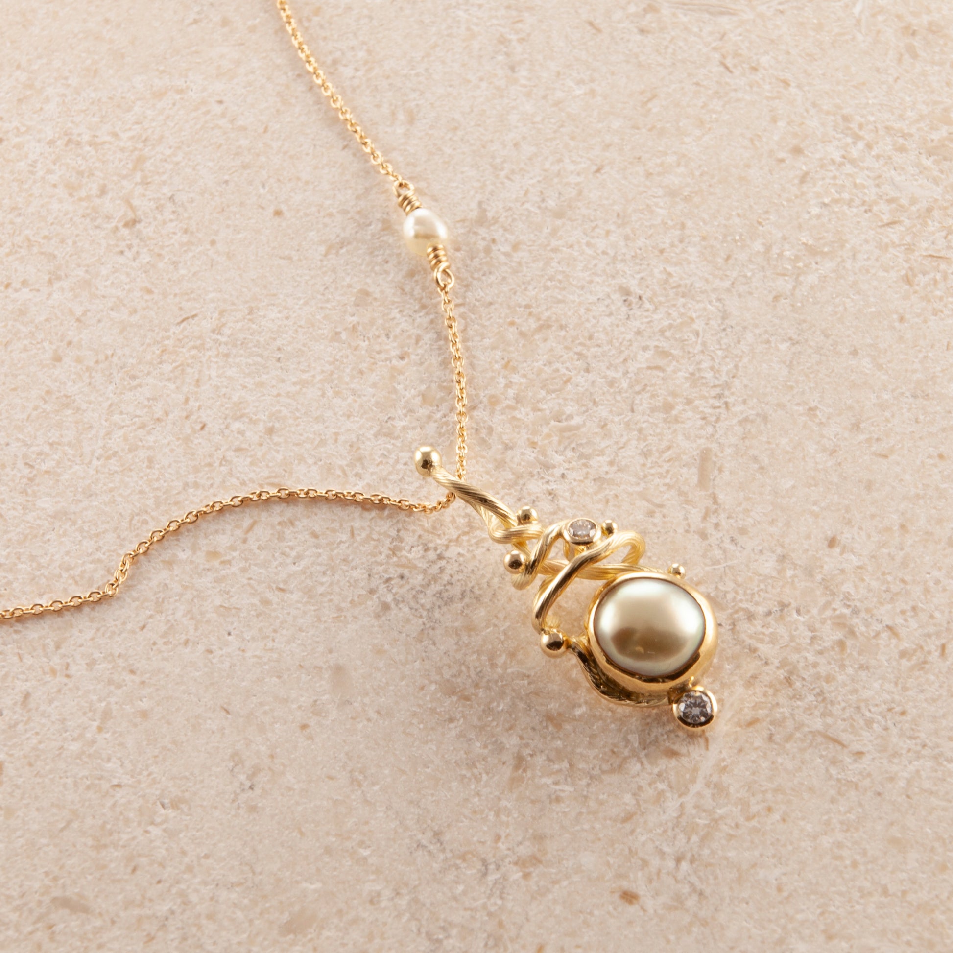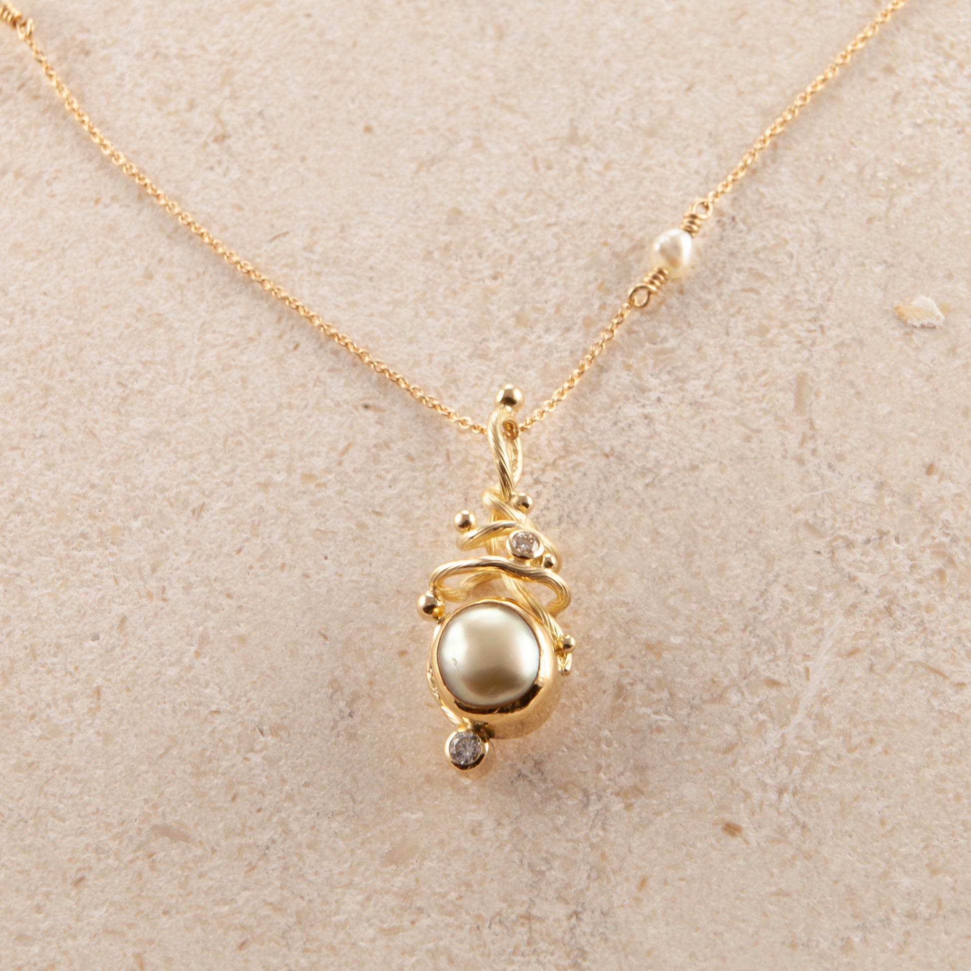 Ædelsten: Keshi perle, 0.06 ct. TW vs brilliantslebet diamant, 0.04 ct. champagne farvet brilliantslebet diamant, 3 x små keshi perler
