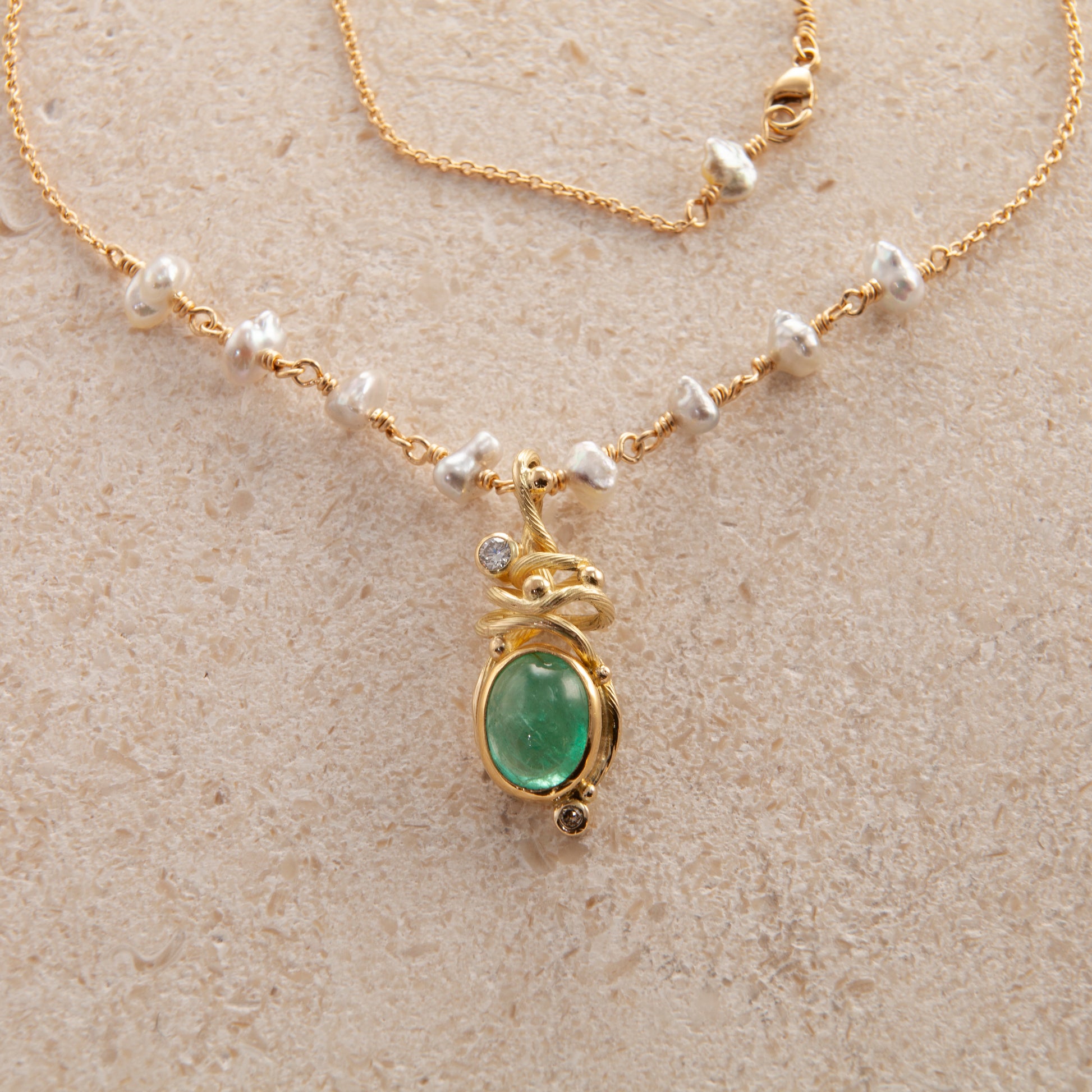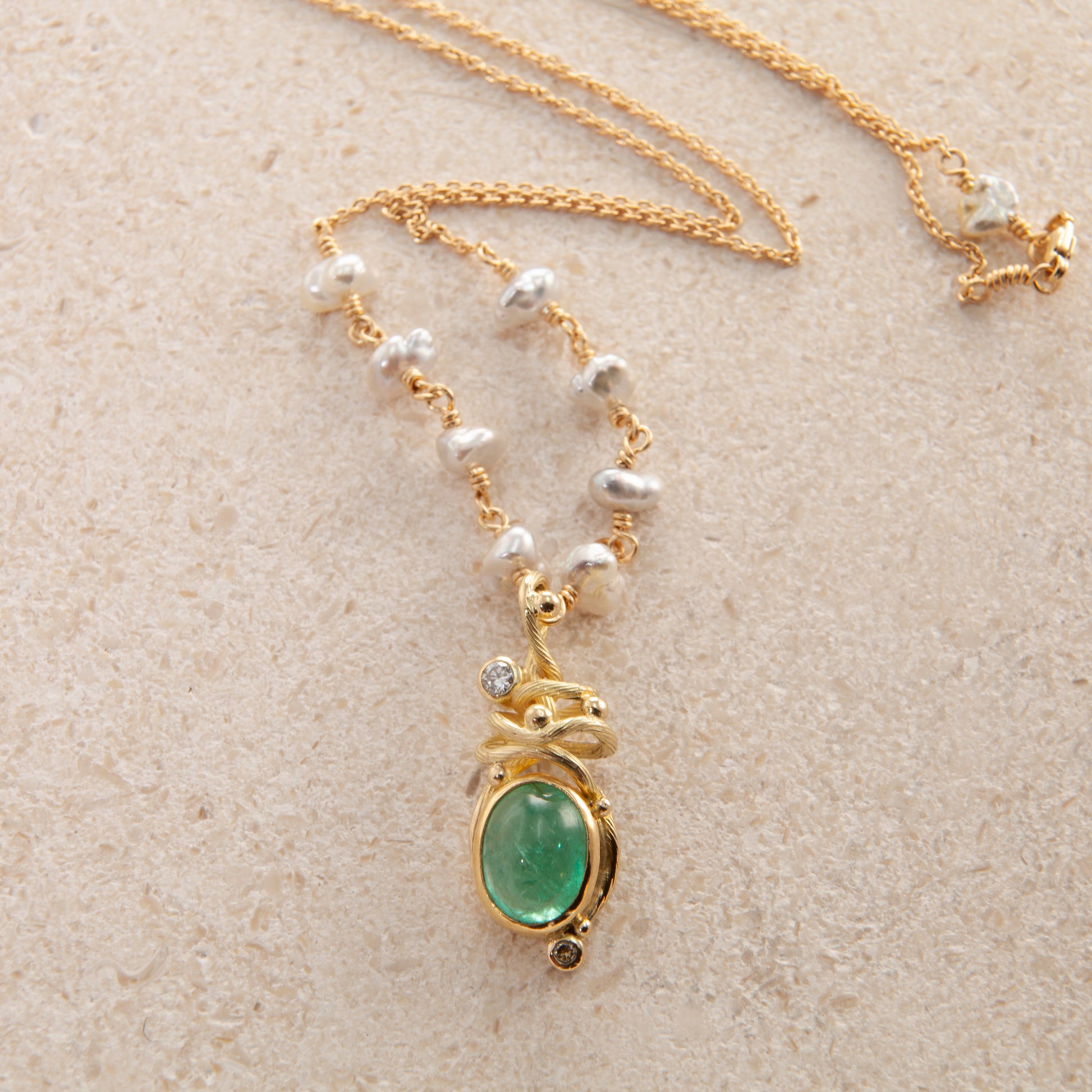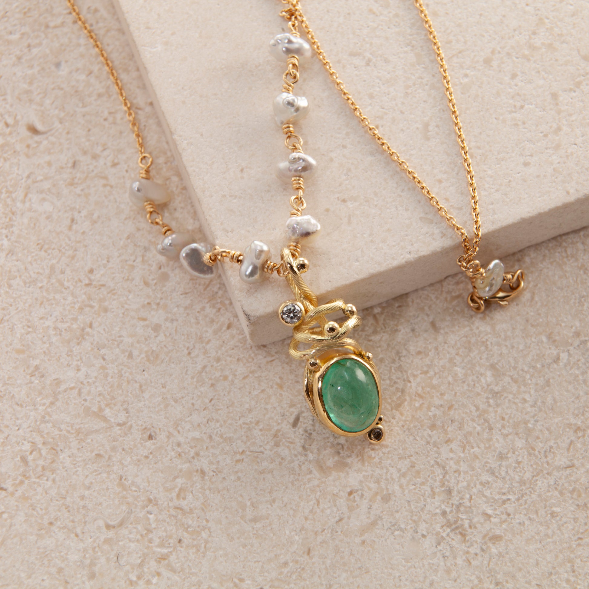 Ædelsten: Smaragd, 0.06 ct. TW vs brilliant cut Diamant, 0.02 ct. champagne brilliant cut Diamant, keshi perle.