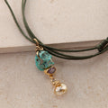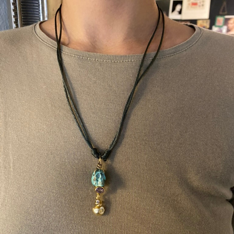 Ædelsten: Håndskåret turkis kranie, pink Safir, 0.04 ct. champagne brilliant cut Diamant, Keshi South Sea Perle.