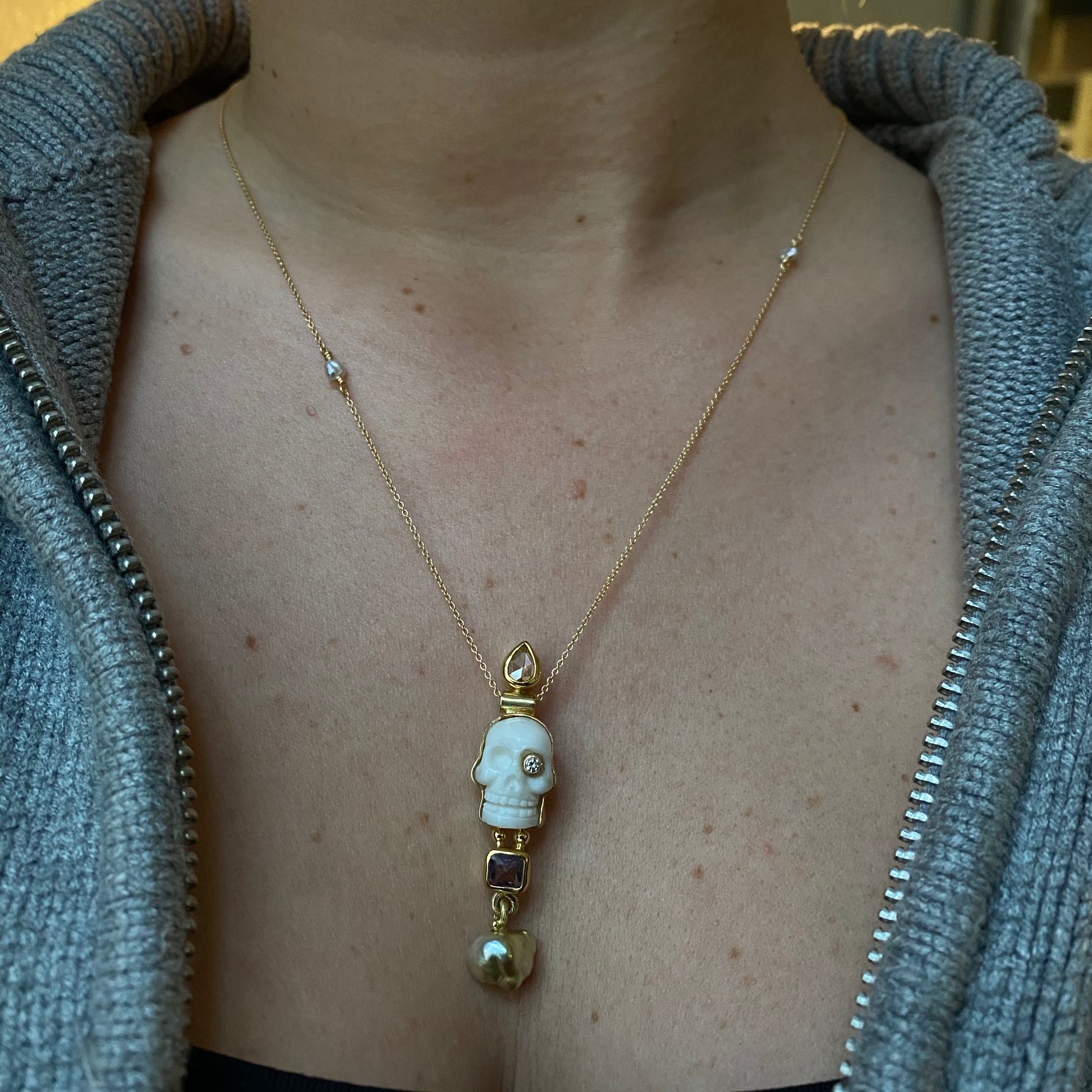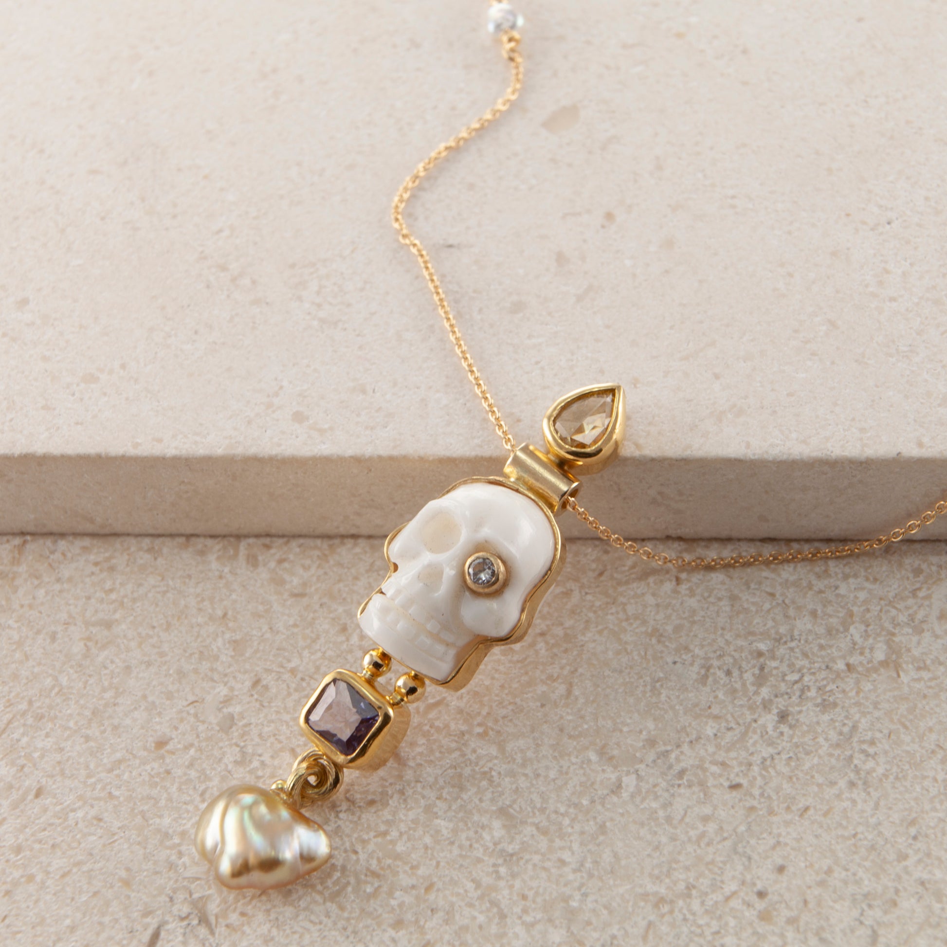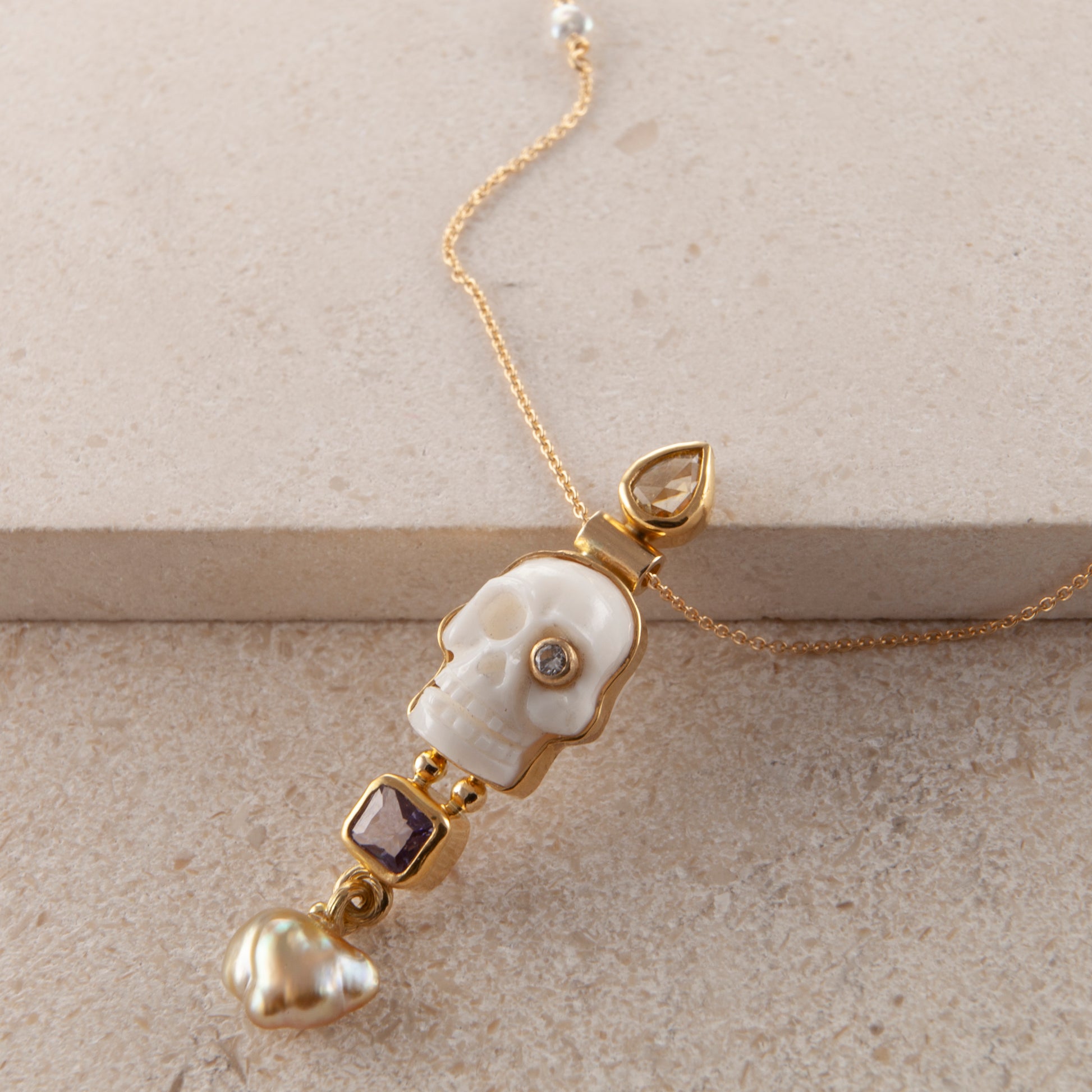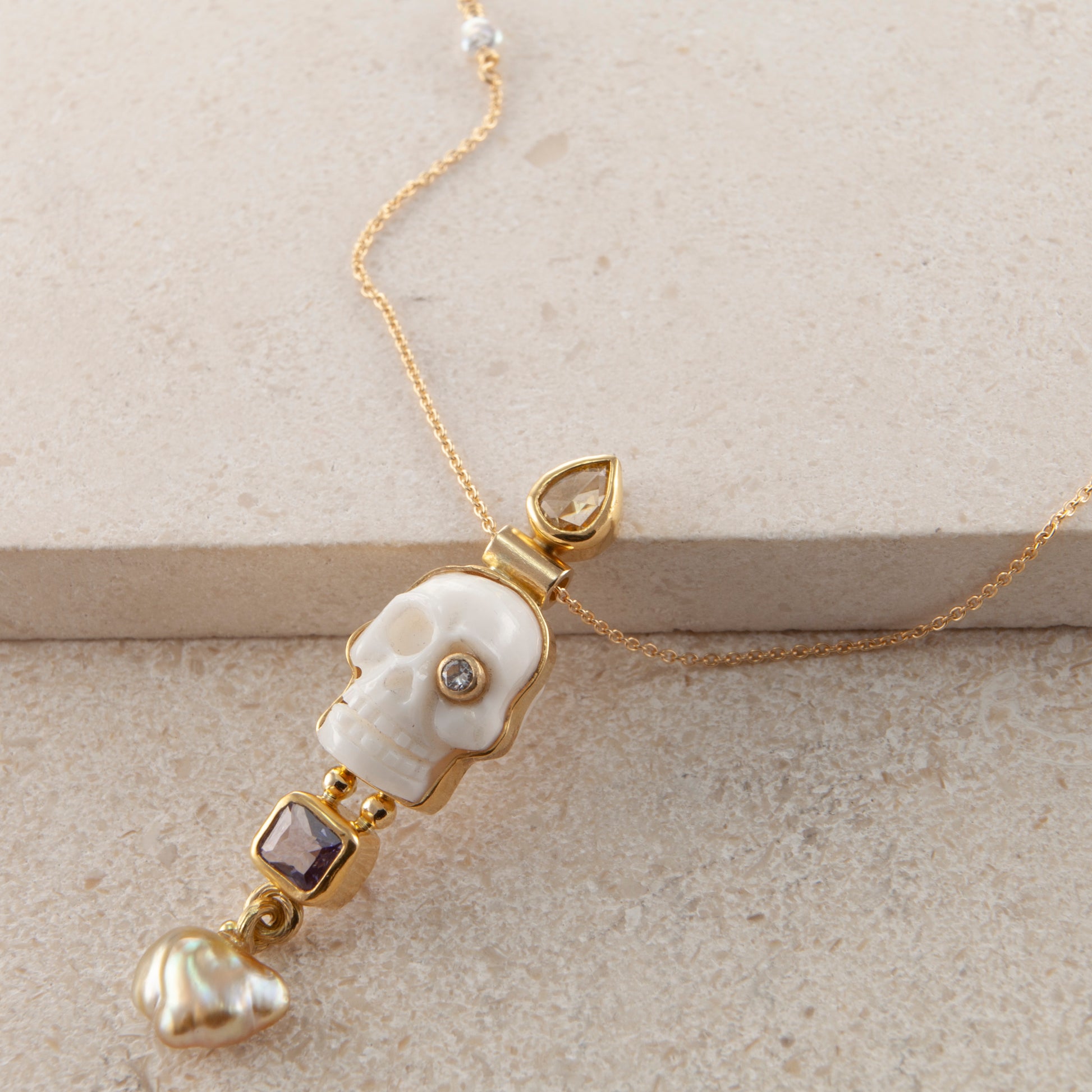 Ædelsten: Håndskåret hvidt kranie, lilla Safir, 0.30 ct. antique cut diamant, 0.04 ct. TW vs. brilliantsleben diamant, keshi perle