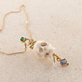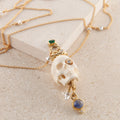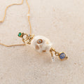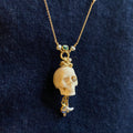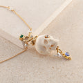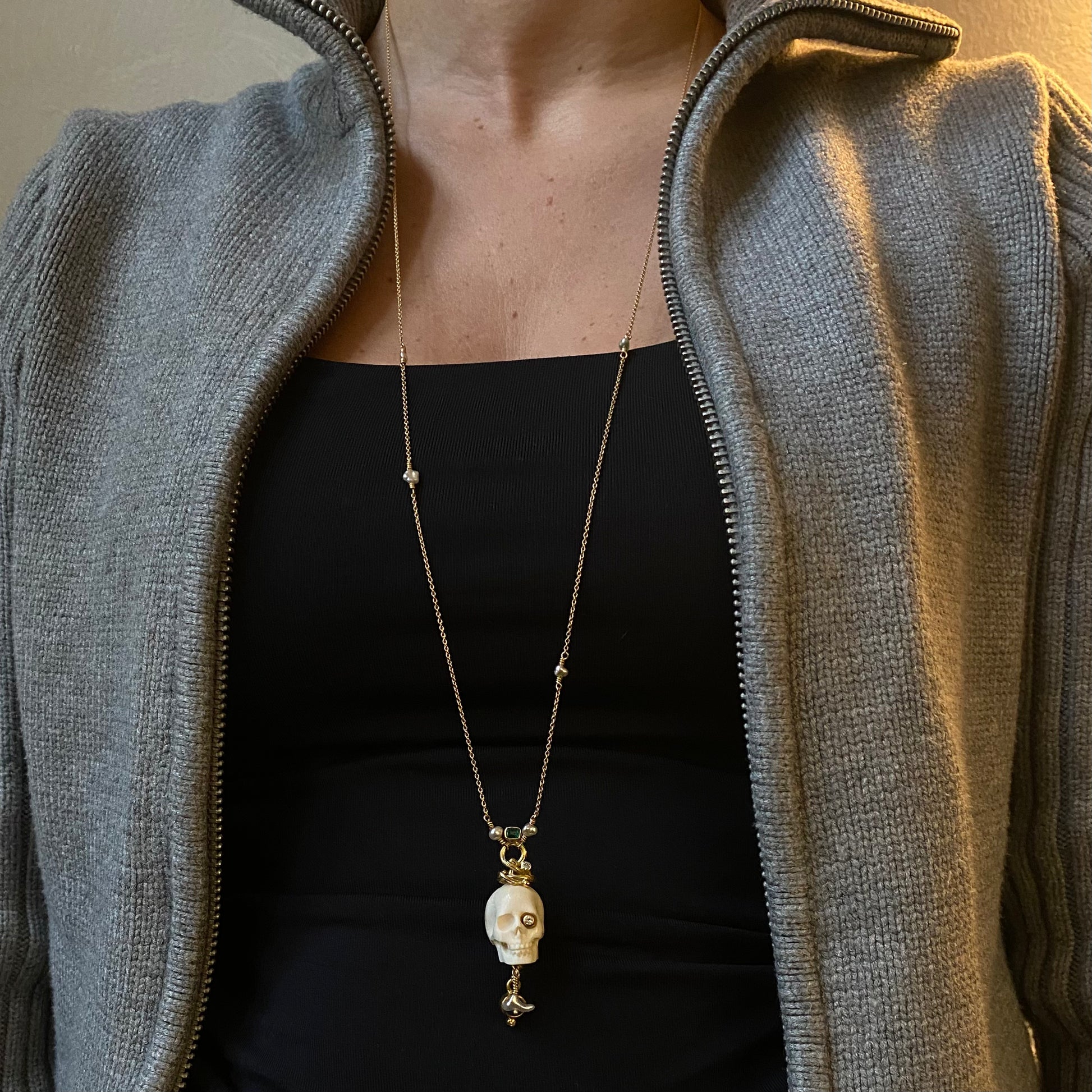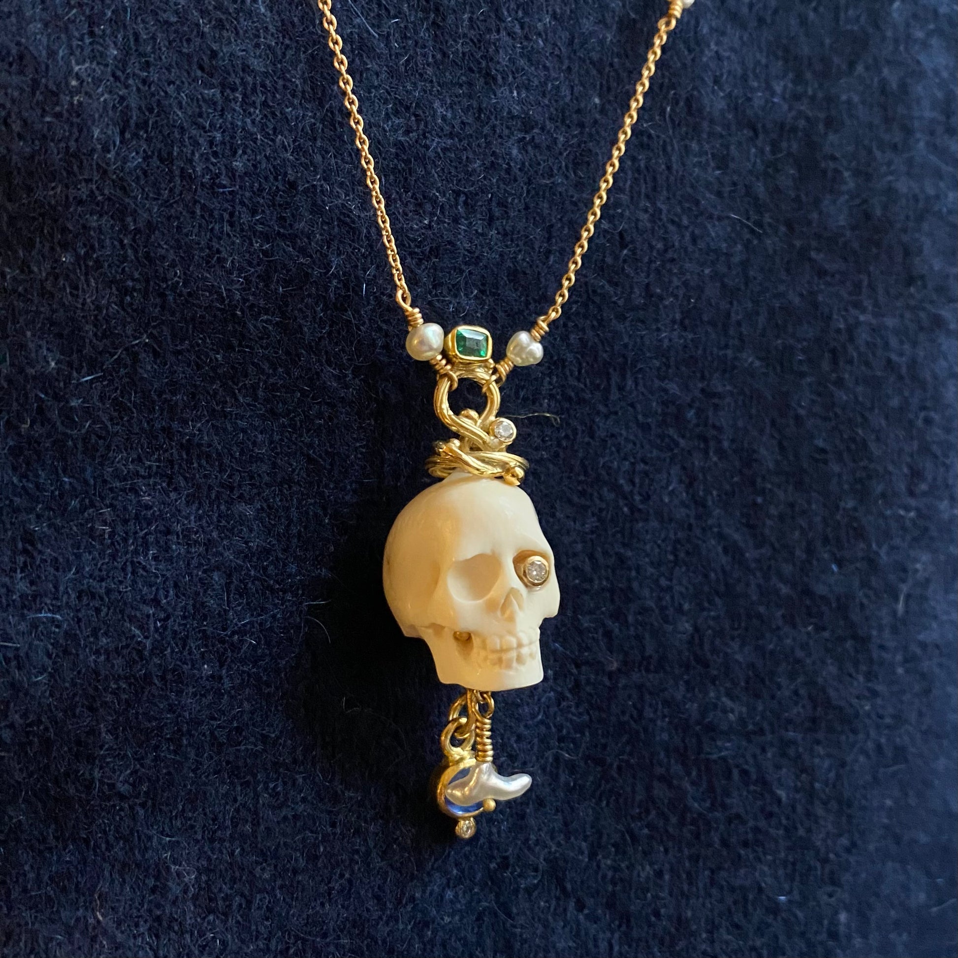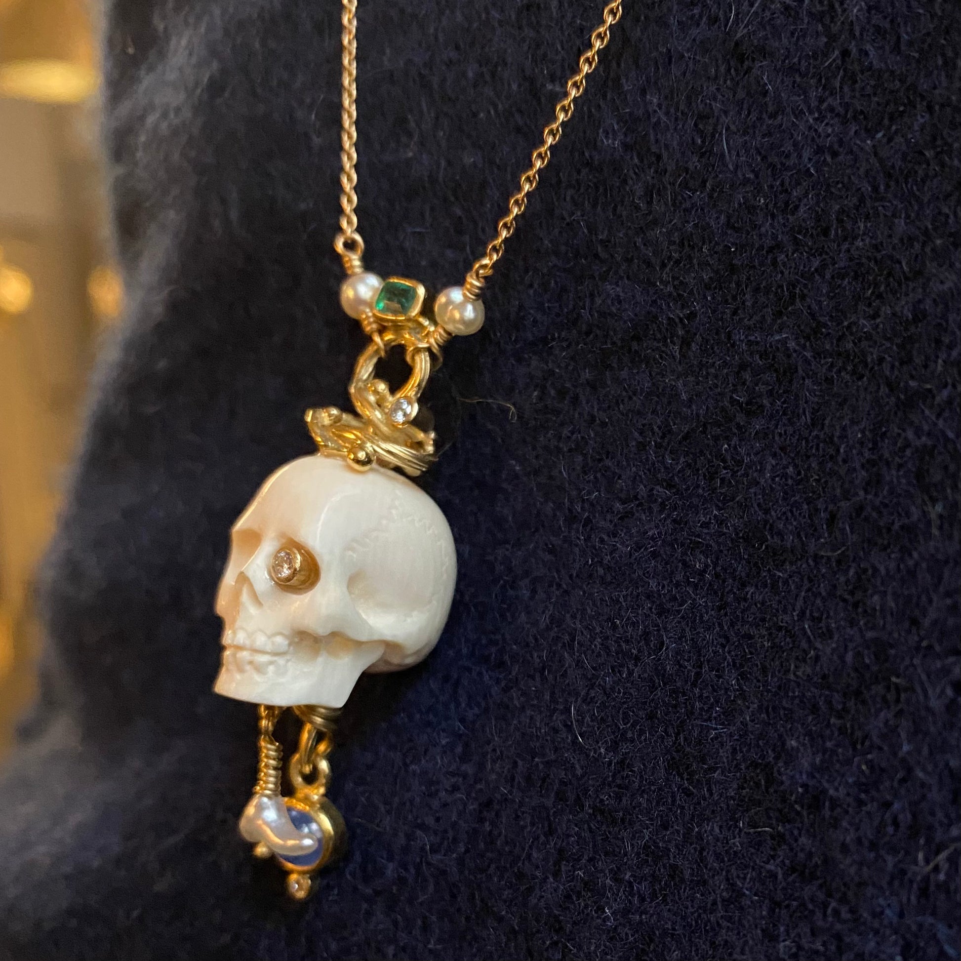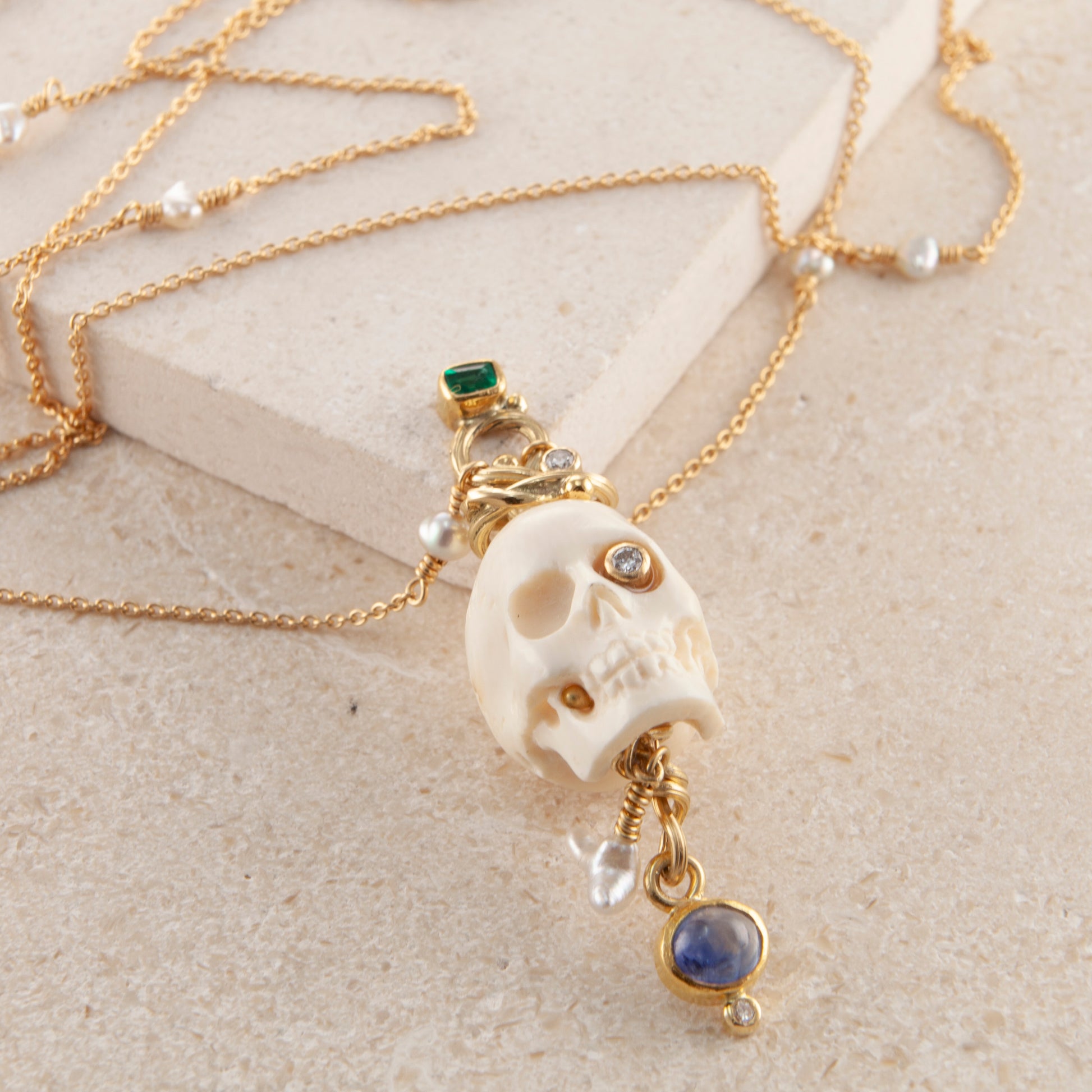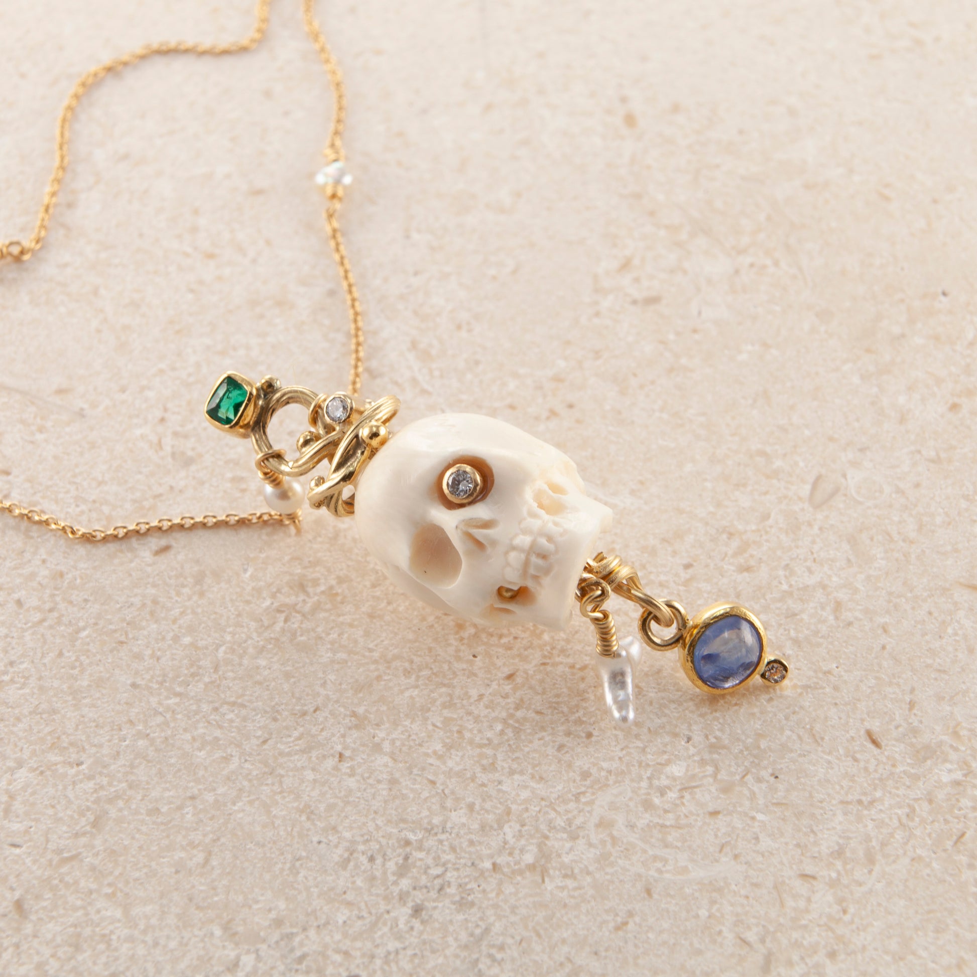 Ædelsten: Håndskåret hvidt mammut kranie, smaragd, blå safir, keshi perle, 0.02 ct., 2 x 0.04 ct. TW vs brilliantslebne diamanter, 8 x små keshi perler