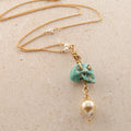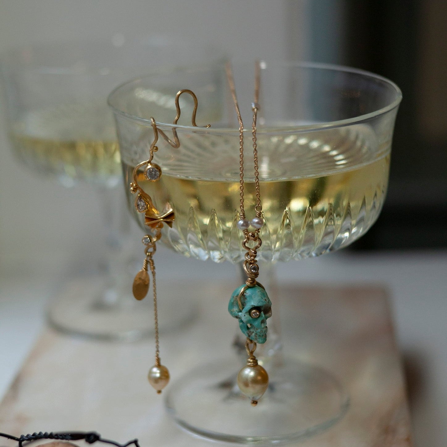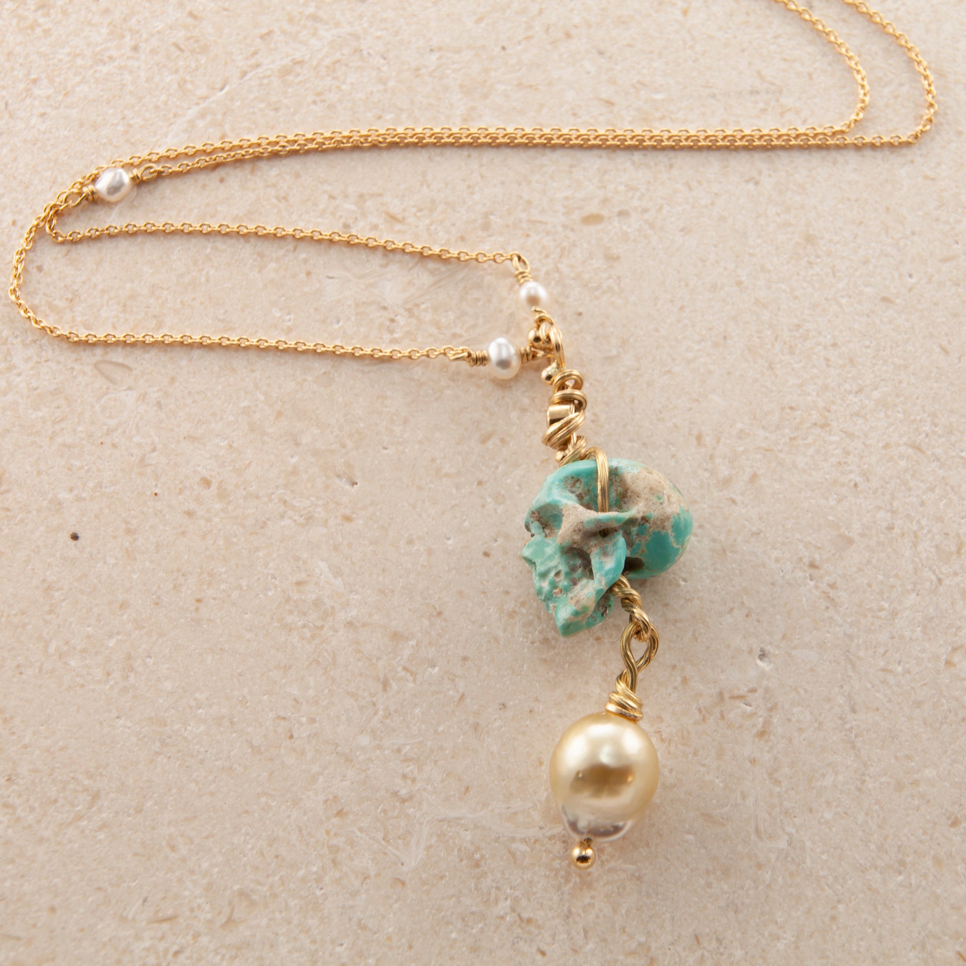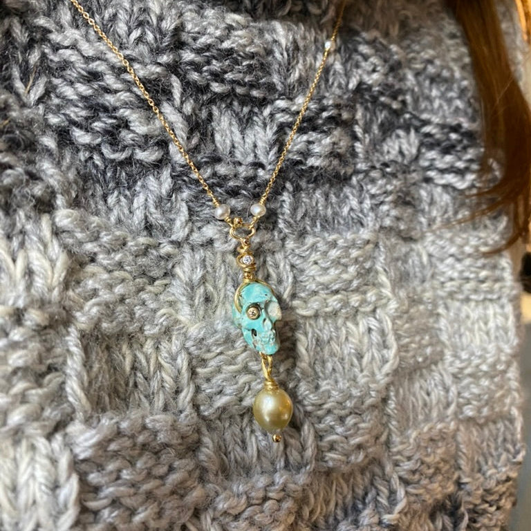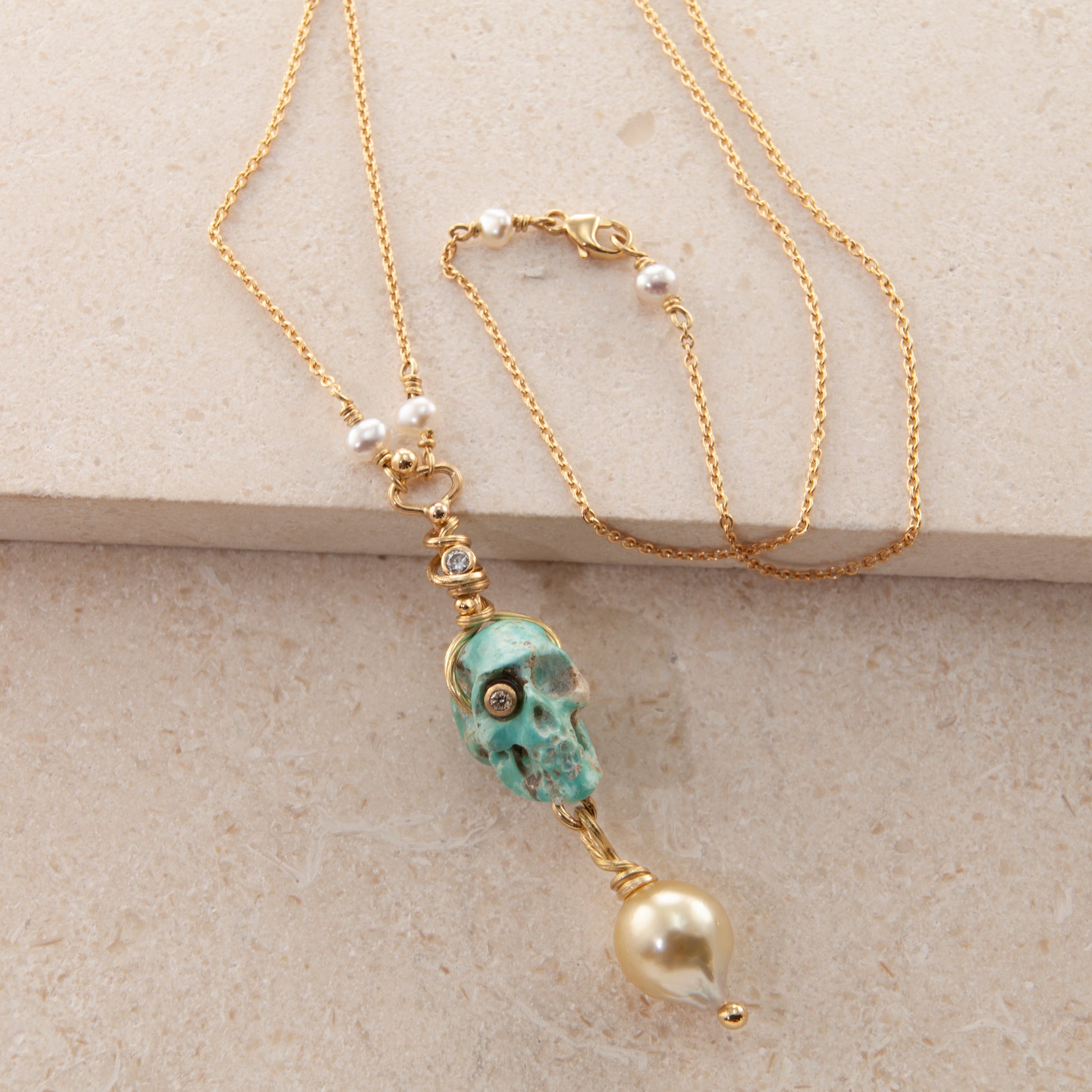 Ædelsten: Håndskåret turkis kranie, South Sea Perle, 0.04 ct. TW. vs. brilliant cut Diamant, 0.02 ct. champagne brilliant cut Diamant, Keshi perler.